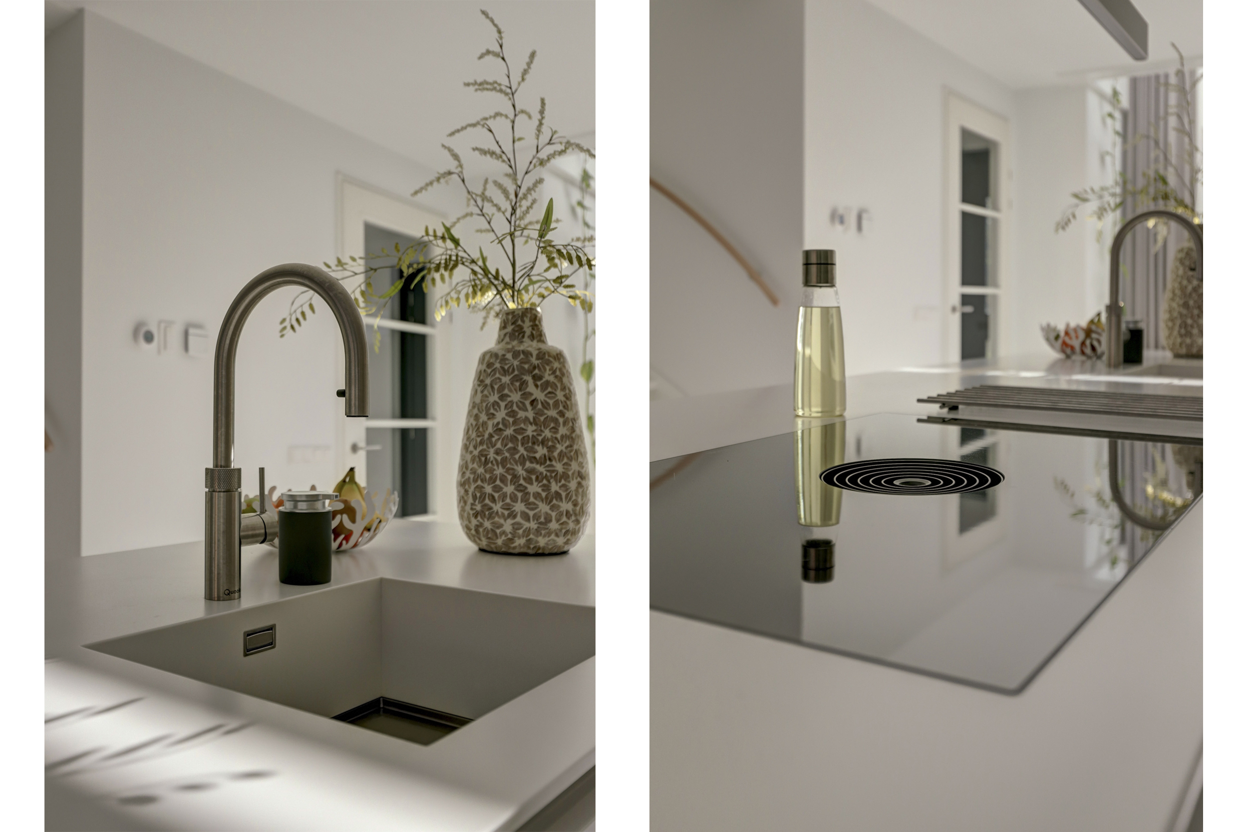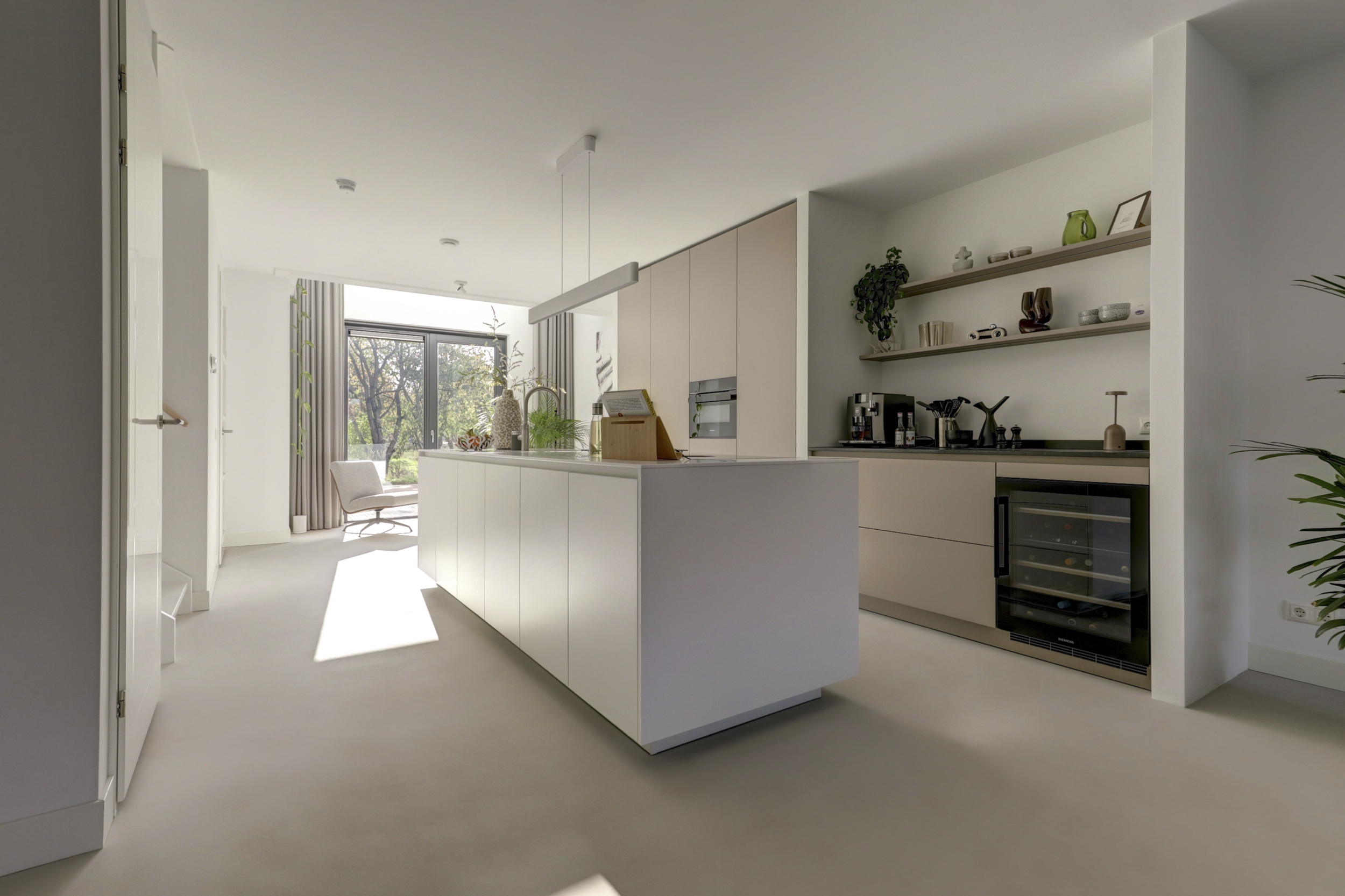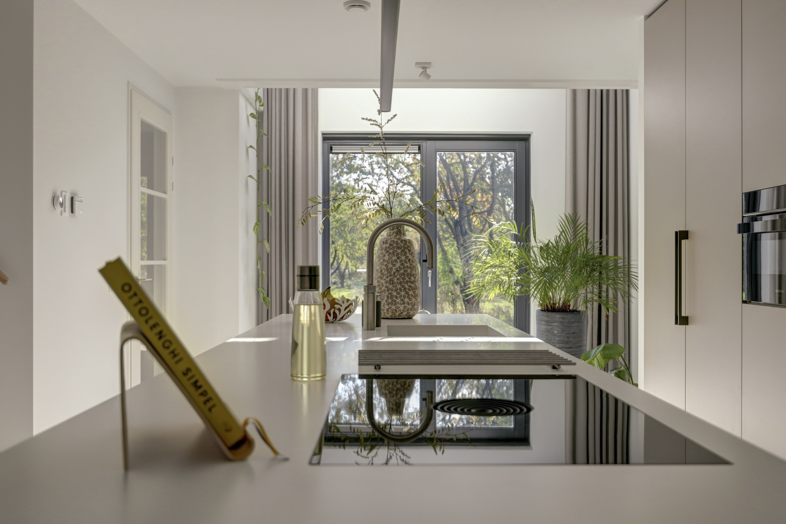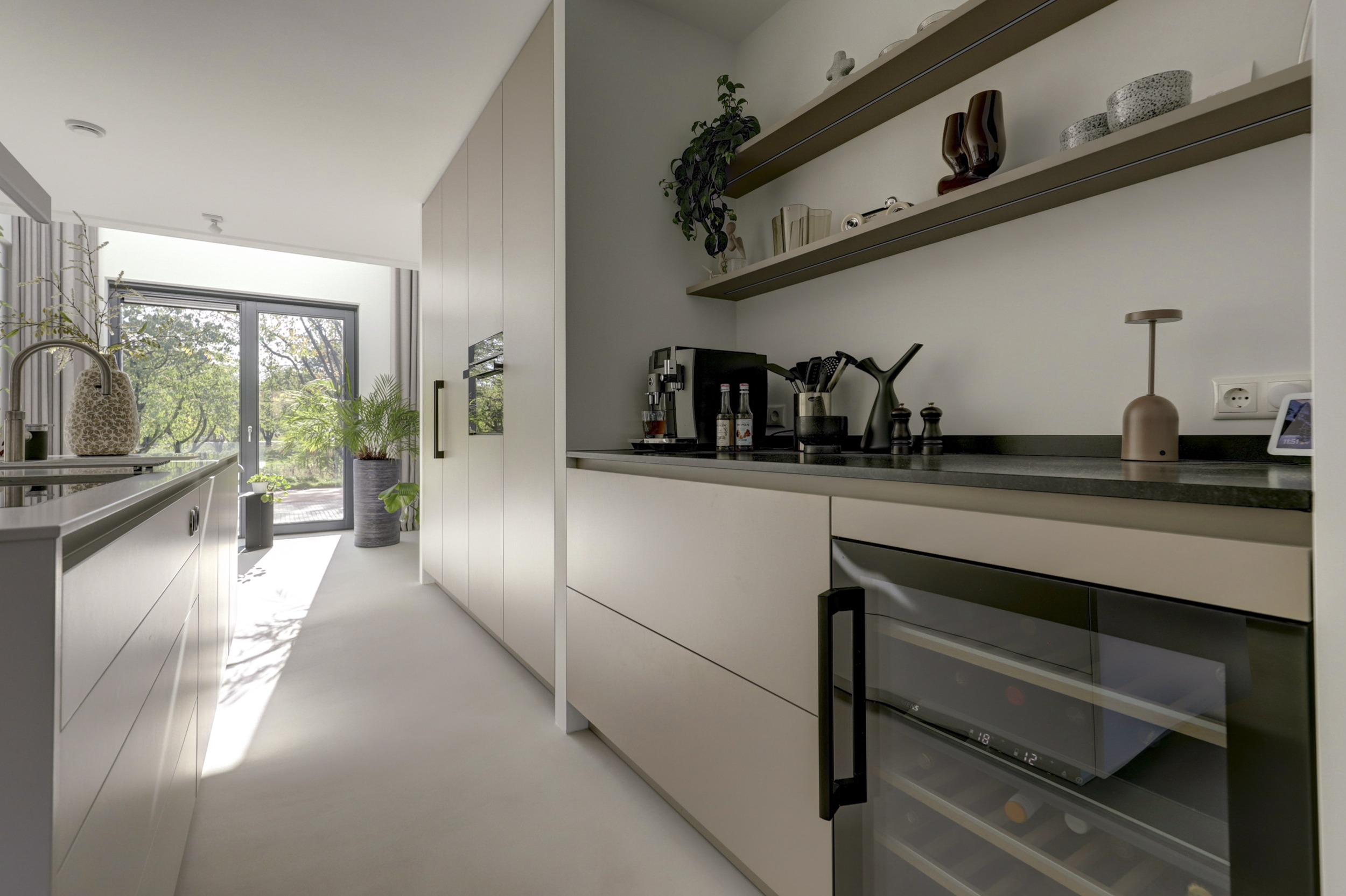 Via de hal met modern toilet en meterkast (voorzien van stadsverwarming en waterontharder) stap je binnen in de uitgebouwde woonkeuken. De Poggenpohl keuken is in 2023 met oog voor detail ontworpen met een royaal kookeiland als blikvanger. Hier kook je op topniveau met onder meer een BORA-inductiekookplaat, Siemens combioven, vaatwasser, koel- en vrieskast en wijnklimaatkast. De Quooker met plat, bruisend en kokend water maakt het plaatje compleet. Openslaande deuren geven toegang tot de tuin, waar je tot in de avond kunt genieten van de zon.