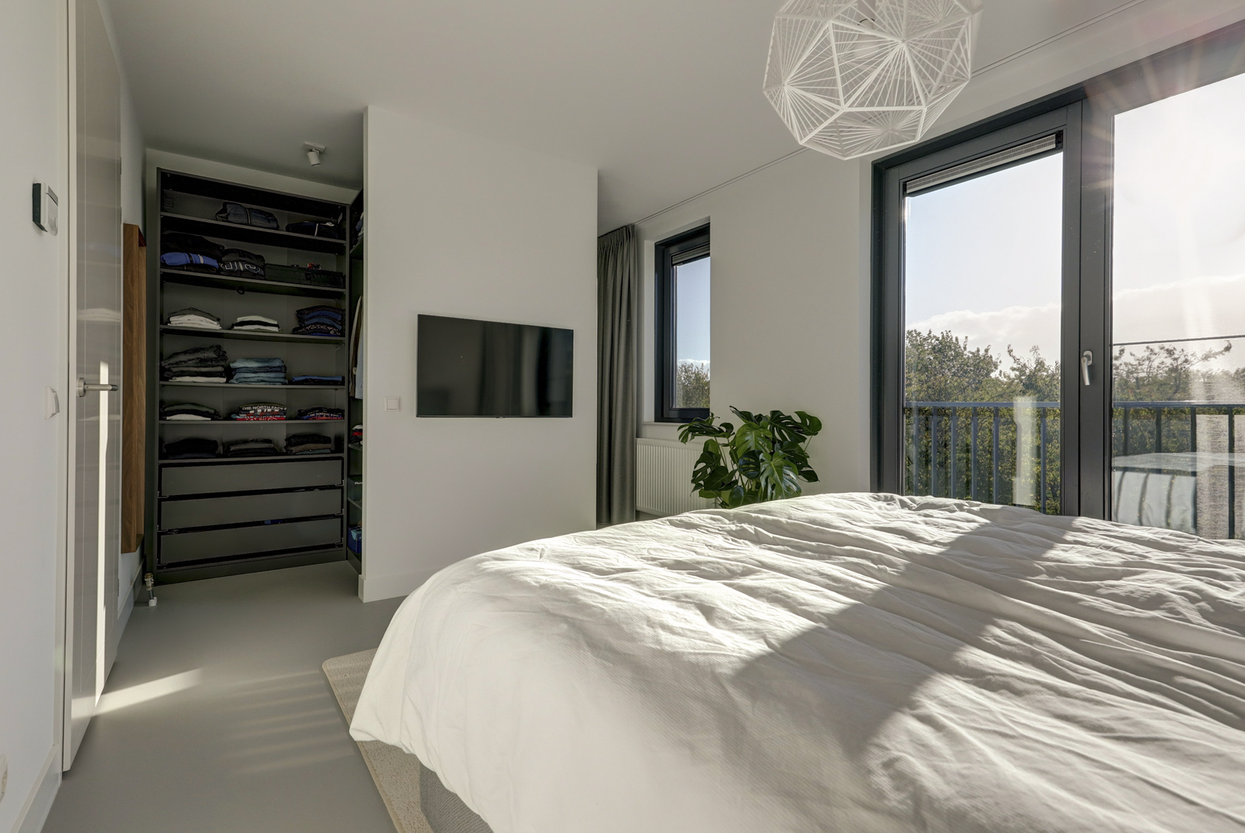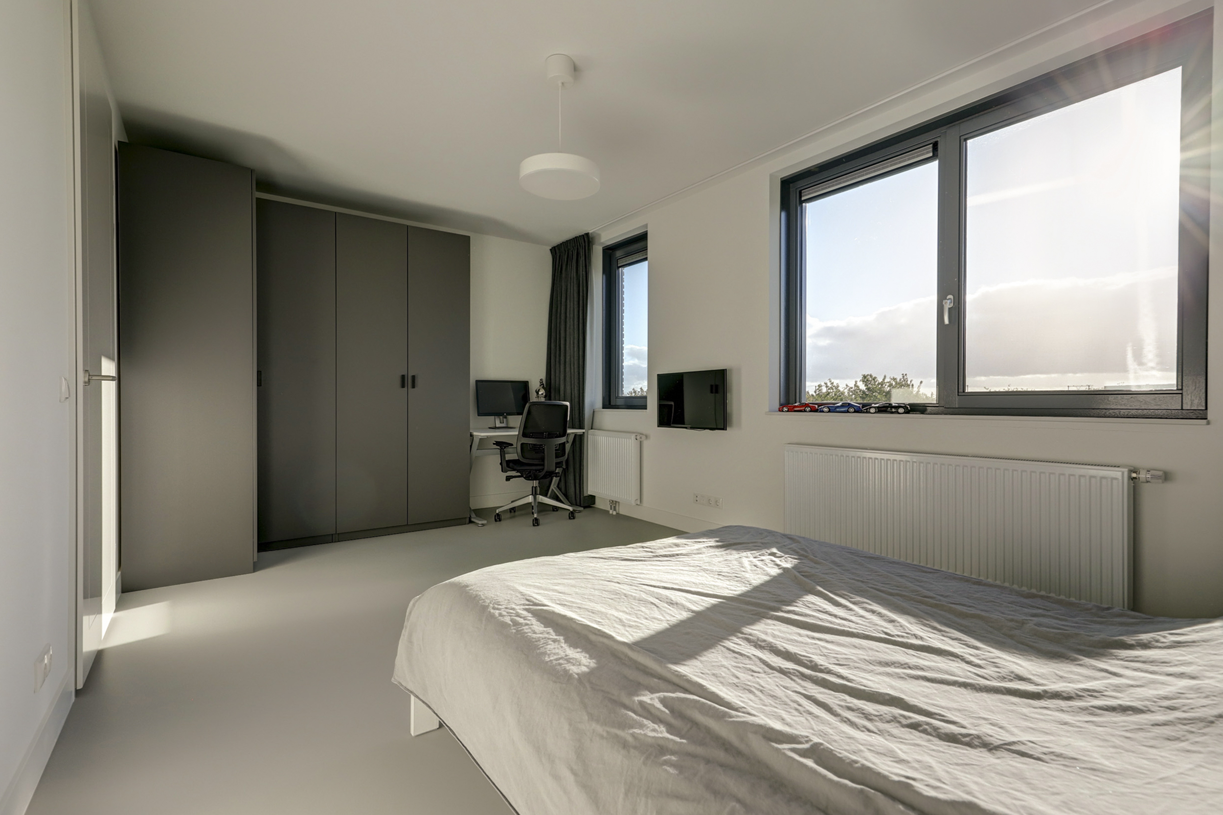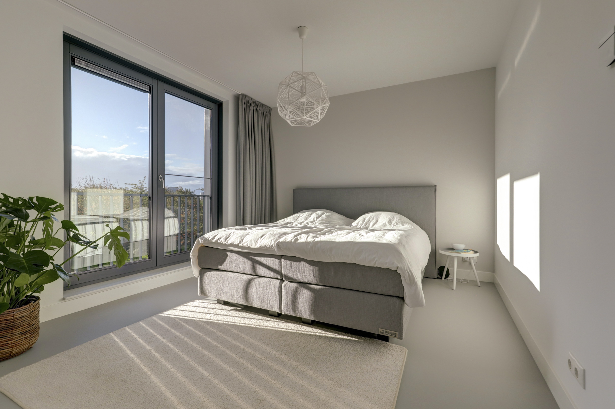 De derde verdieping herbergt nog twee fijne slaapkamers: de kamer aan de voorzijde biedt eveneens uitzicht op de boomgaard en de skyline van Nijmegen, de kamer aan de achterzijde is rustig gelegen. Verder vind je hier een aparte wasruimte met opstelplaats voor witgoed, WTW-installatie en omvormer van de zonnepanelen.