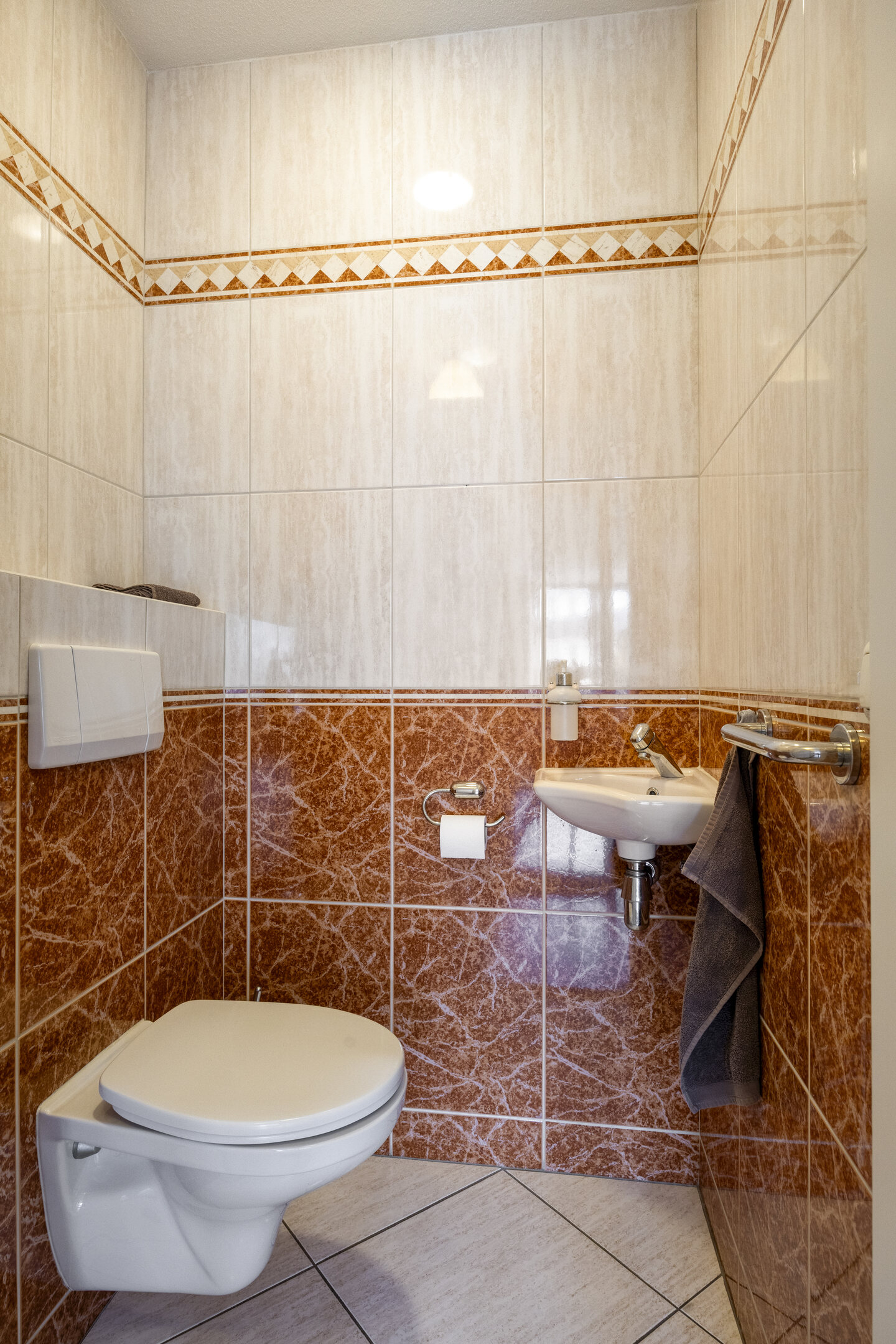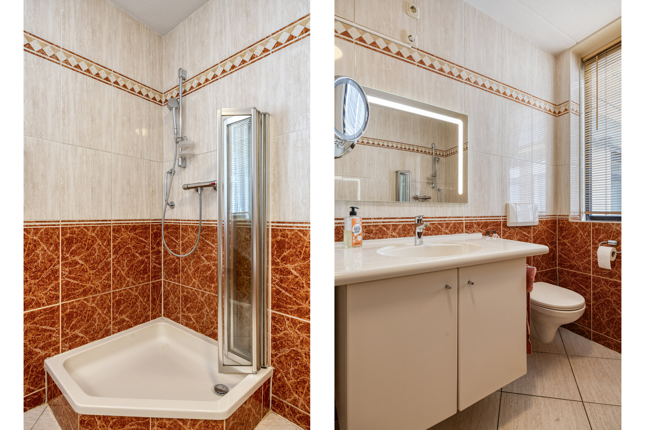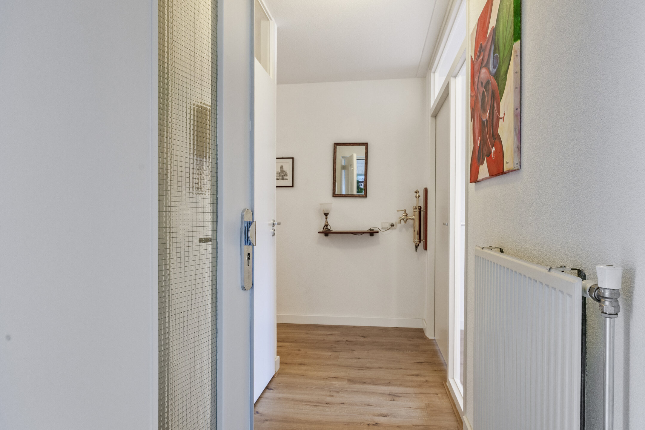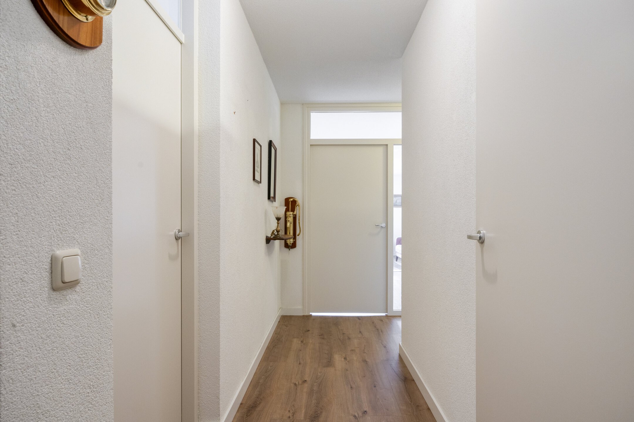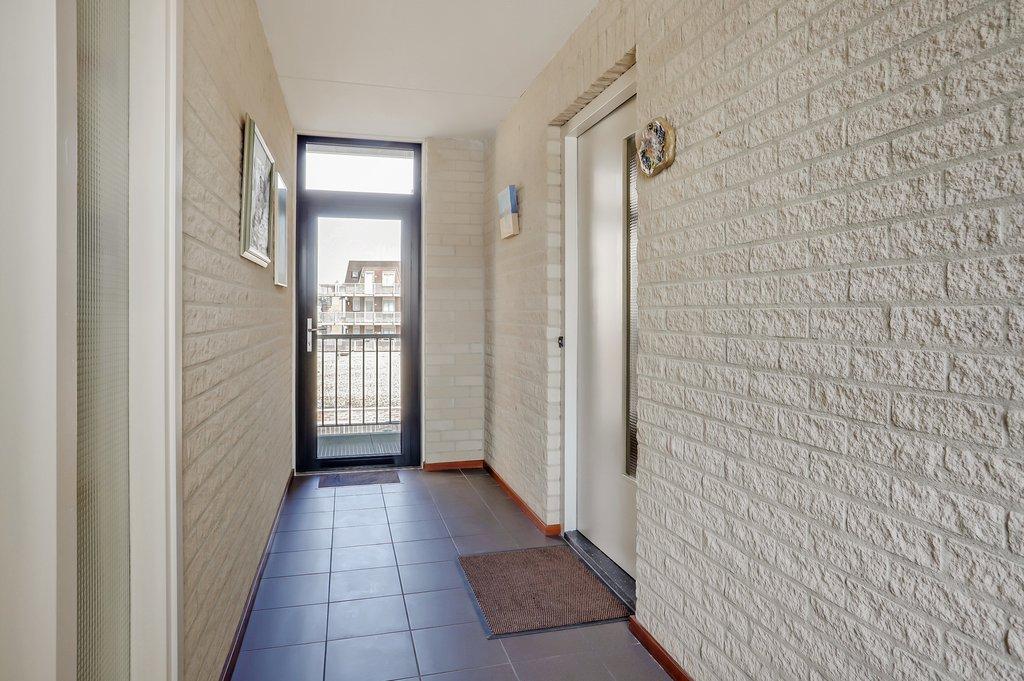 Je komt binnen via een portiek met slechts één appartement, wat zorgt voor een rustige en private entree. In de hal heb je direct toegang tot alle vertrekken. Hier vind je de meterkast en een nette toiletruimte met vrij hangend toilet en fonteintje.