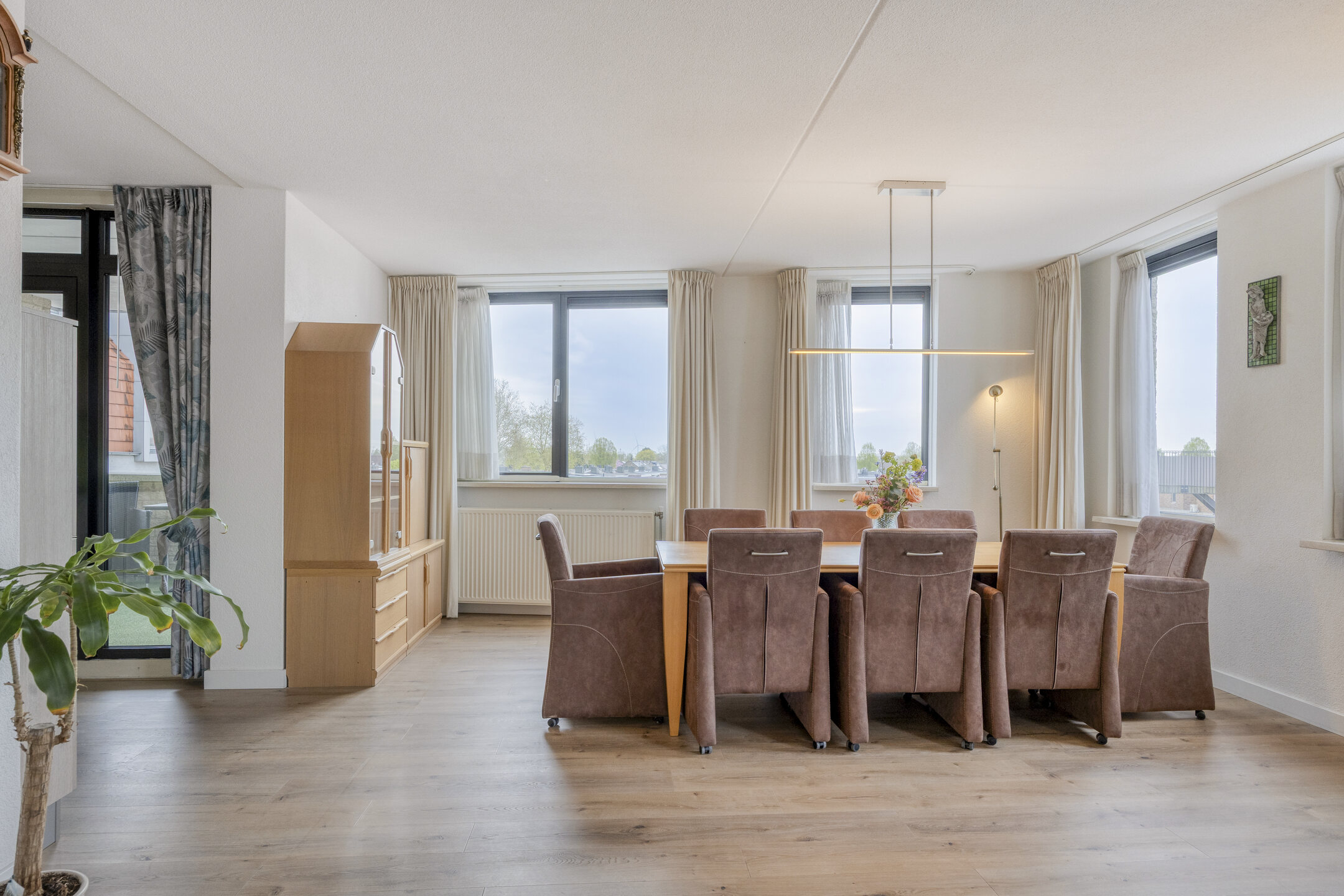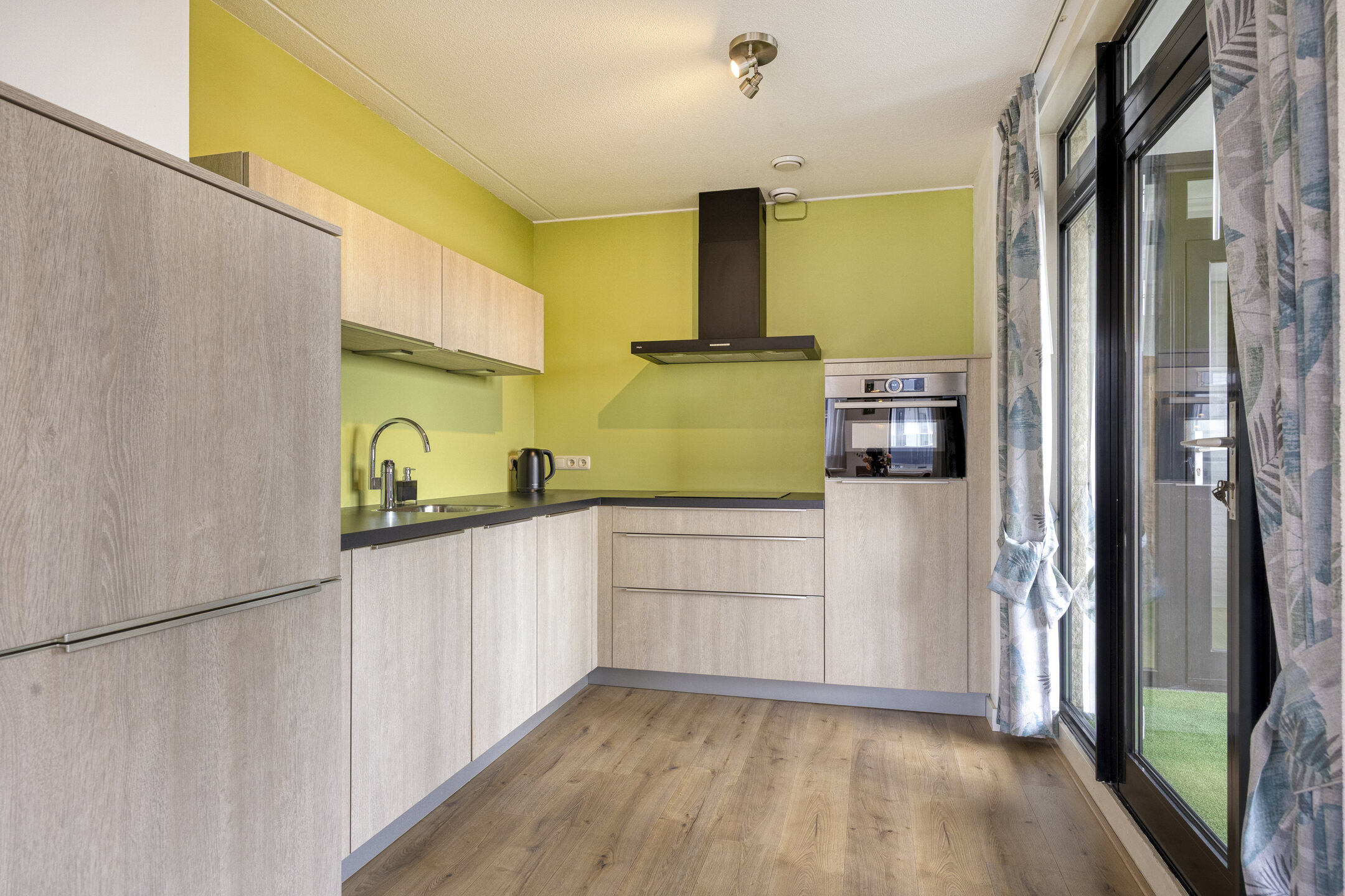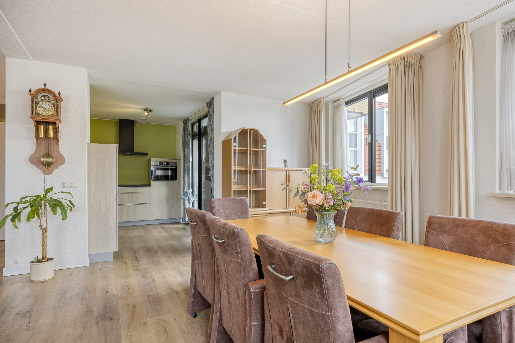 De woonkamer is ruim en opvallend licht dankzij de grote raampartijen aan twee zijden en de gunstige ligging op het zuiden. Dit is een fijne plek om te ontspannen of gasten te ontvangen. Aansluitend ligt de open keuken (2020), uitgevoerd in een praktische hoekopstelling en voorzien van een elektrische kookplaat, afzuigkap, vaatwasser, combi-magnetron en koelkast.