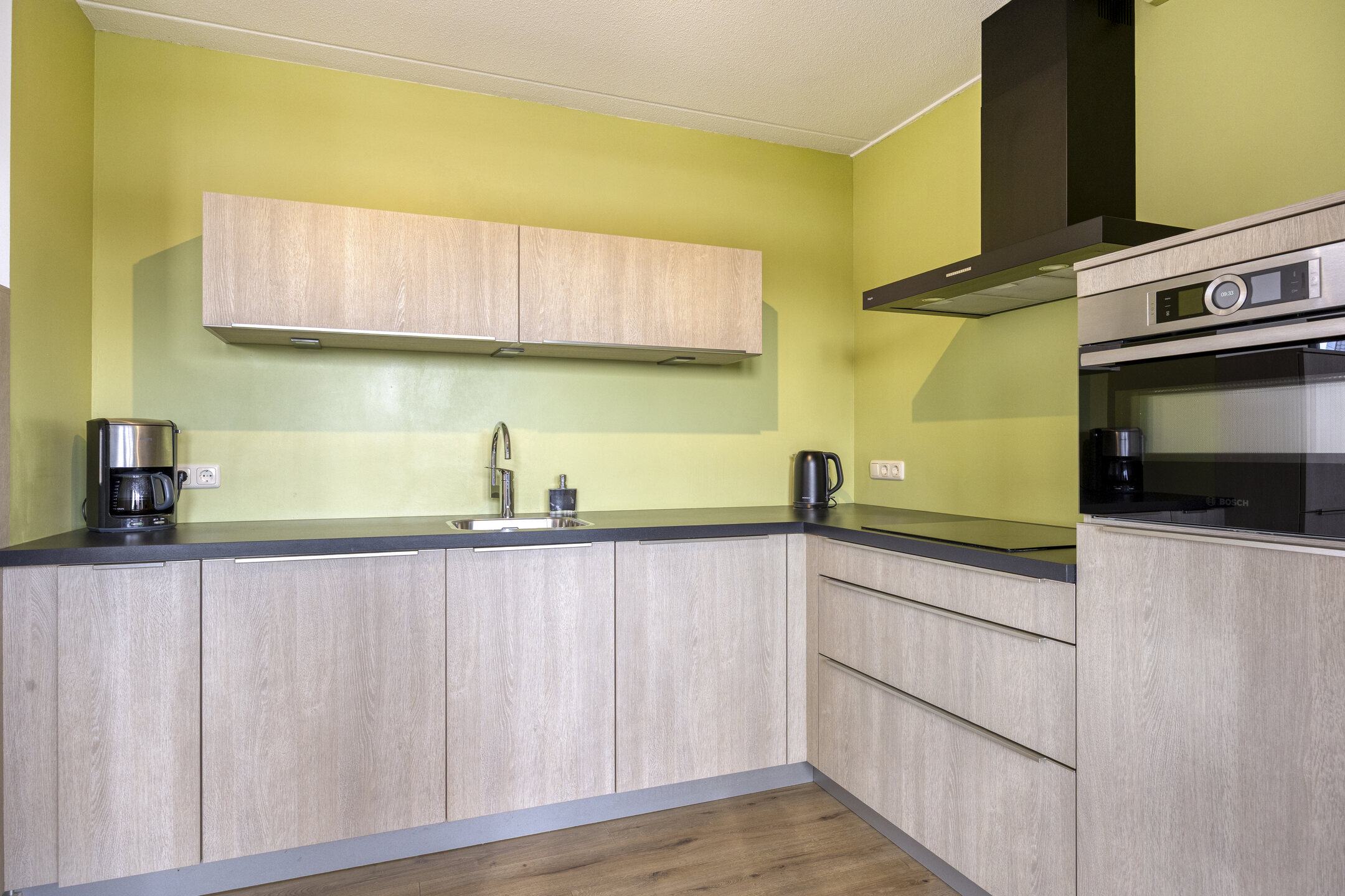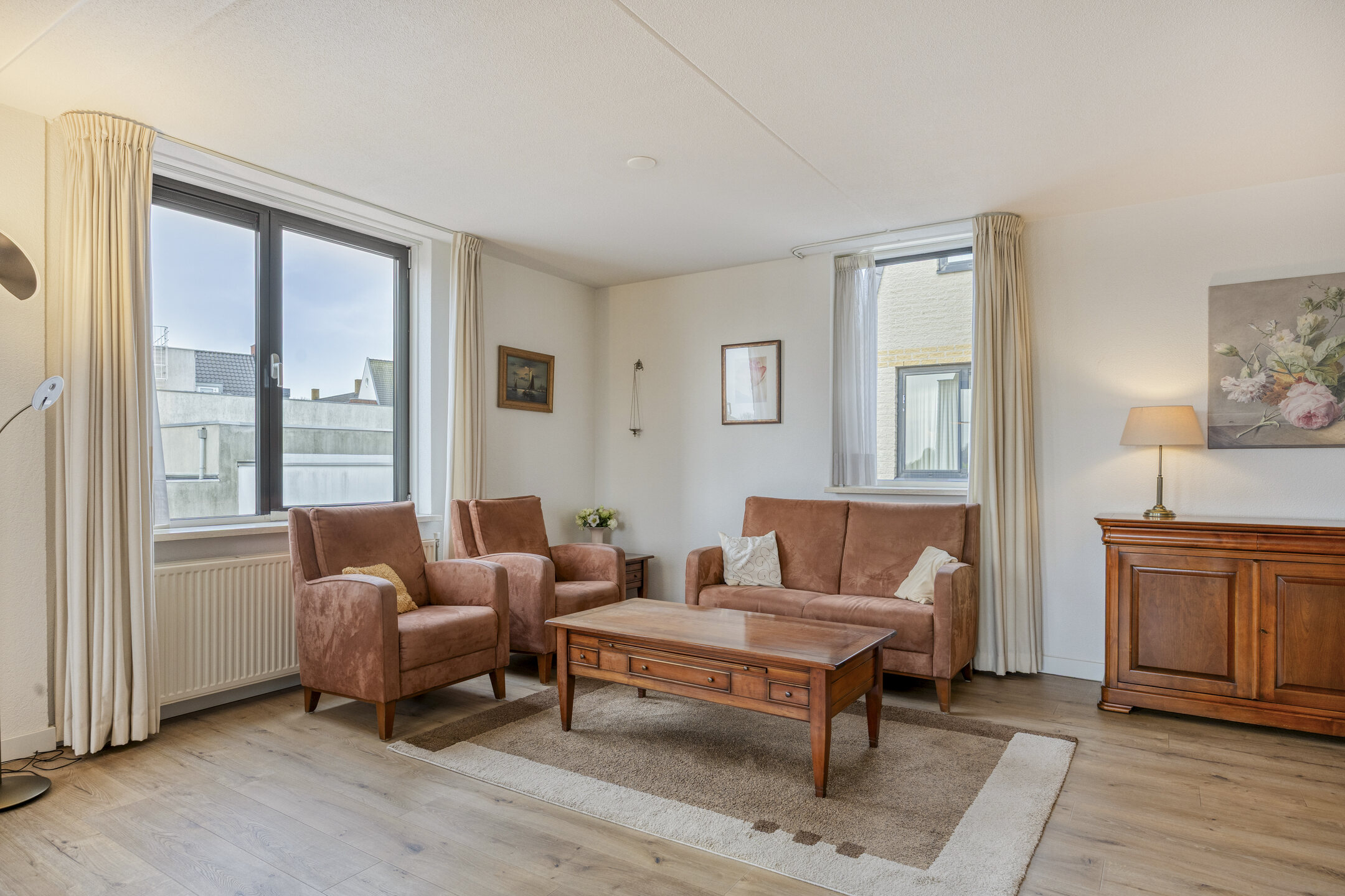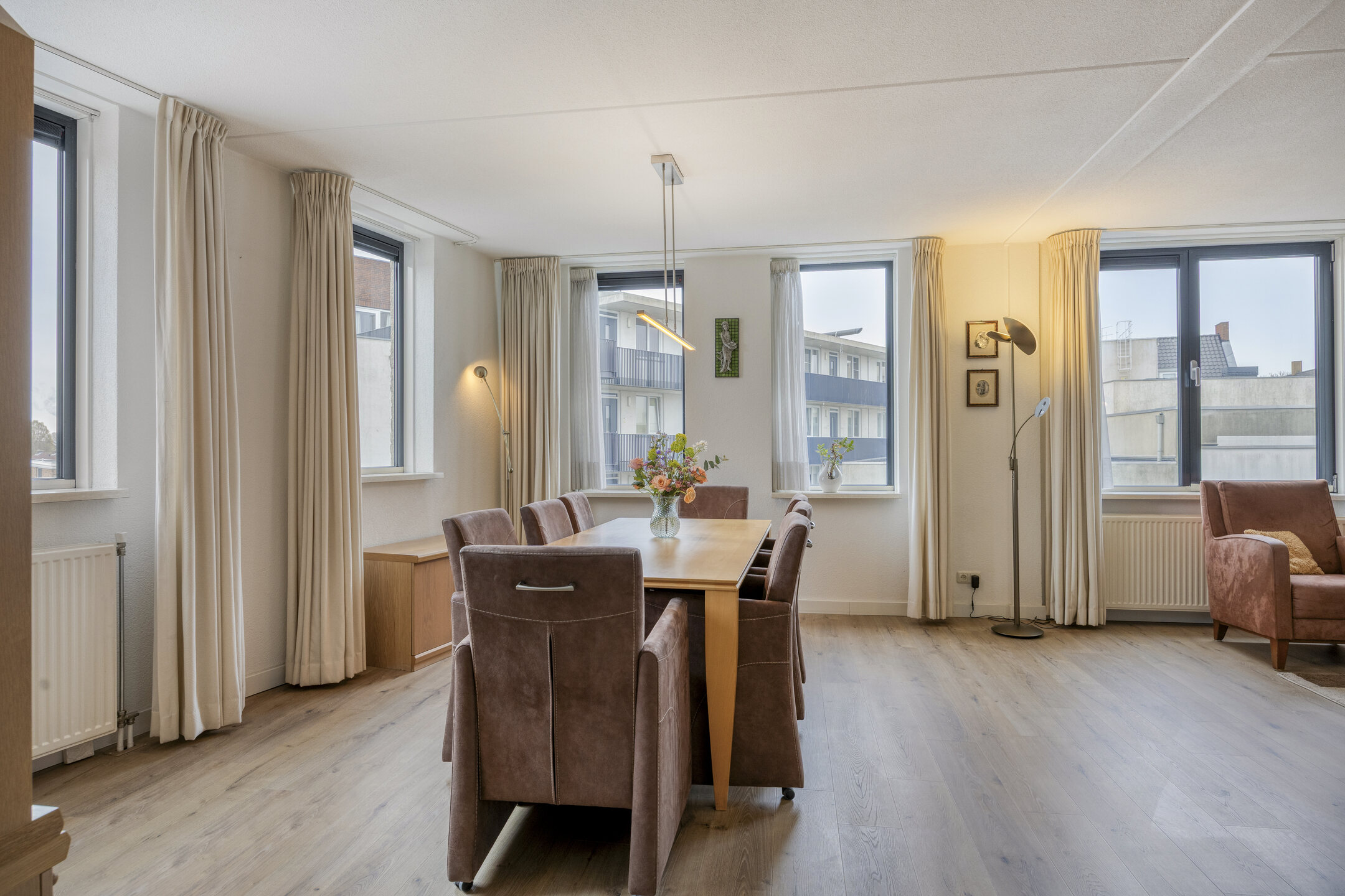 De woonkamer is ruim en opvallend licht dankzij de grote raampartijen aan twee zijden en de gunstige ligging op het zuiden. Dit is een fijne plek om te ontspannen of gasten te ontvangen. Aansluitend ligt de open keuken (2020), uitgevoerd in een praktische hoekopstelling en voorzien van een elektrische kookplaat, afzuigkap, vaatwasser, combi-magnetron en koelkast.