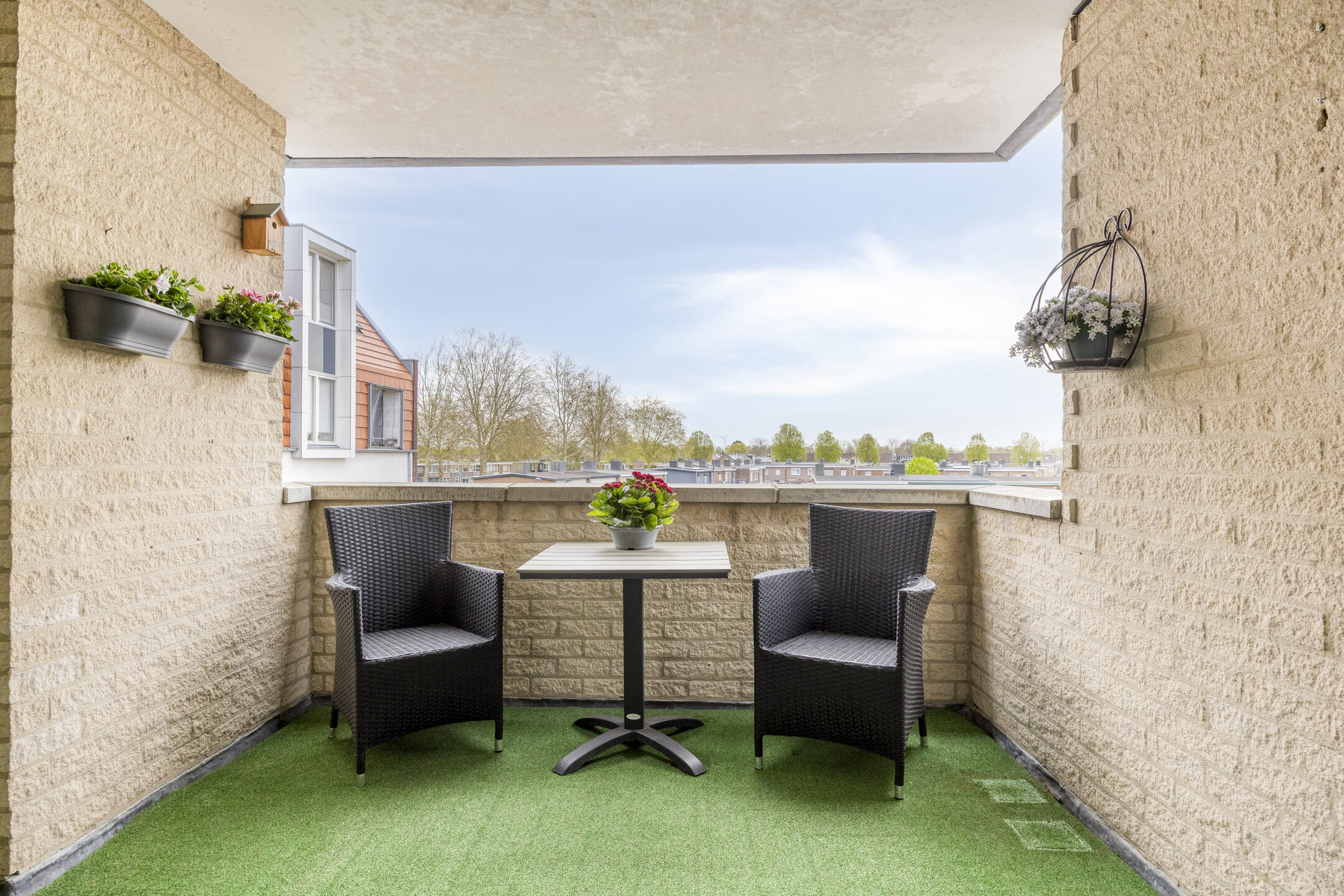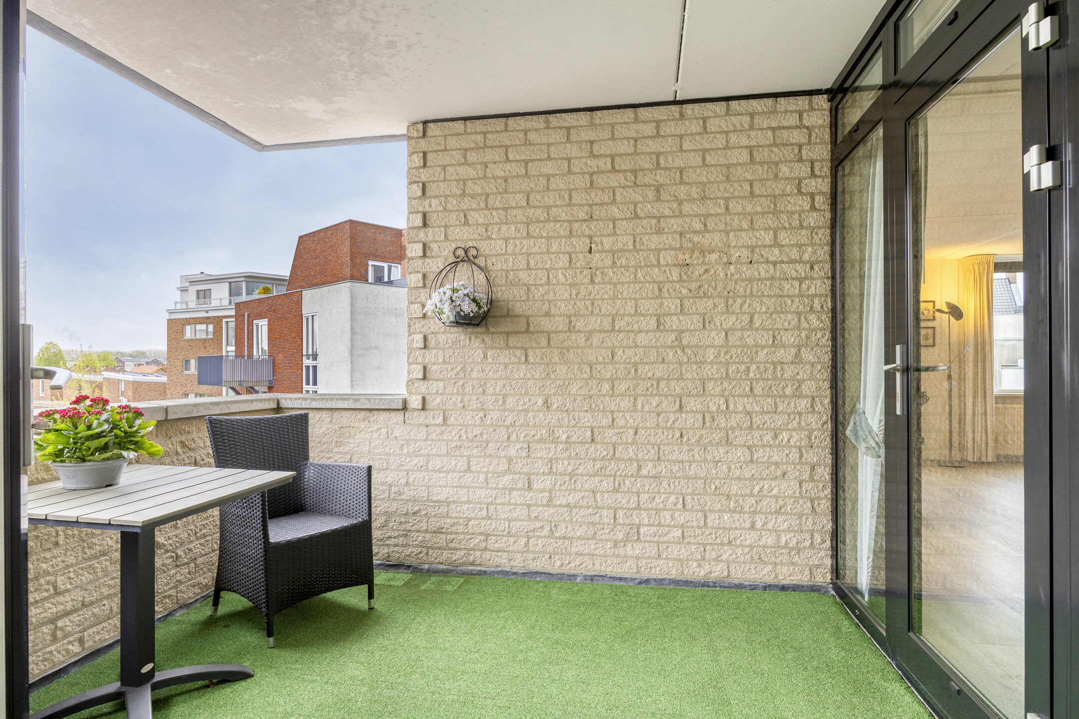 Vanuit de keuken stap je zo het balkon op. Met een oppervlakte van circa 8 m² is dit een volwaardige buitenruimte waar je comfortabel zit en uitkijkt richting het Beatrixplein.