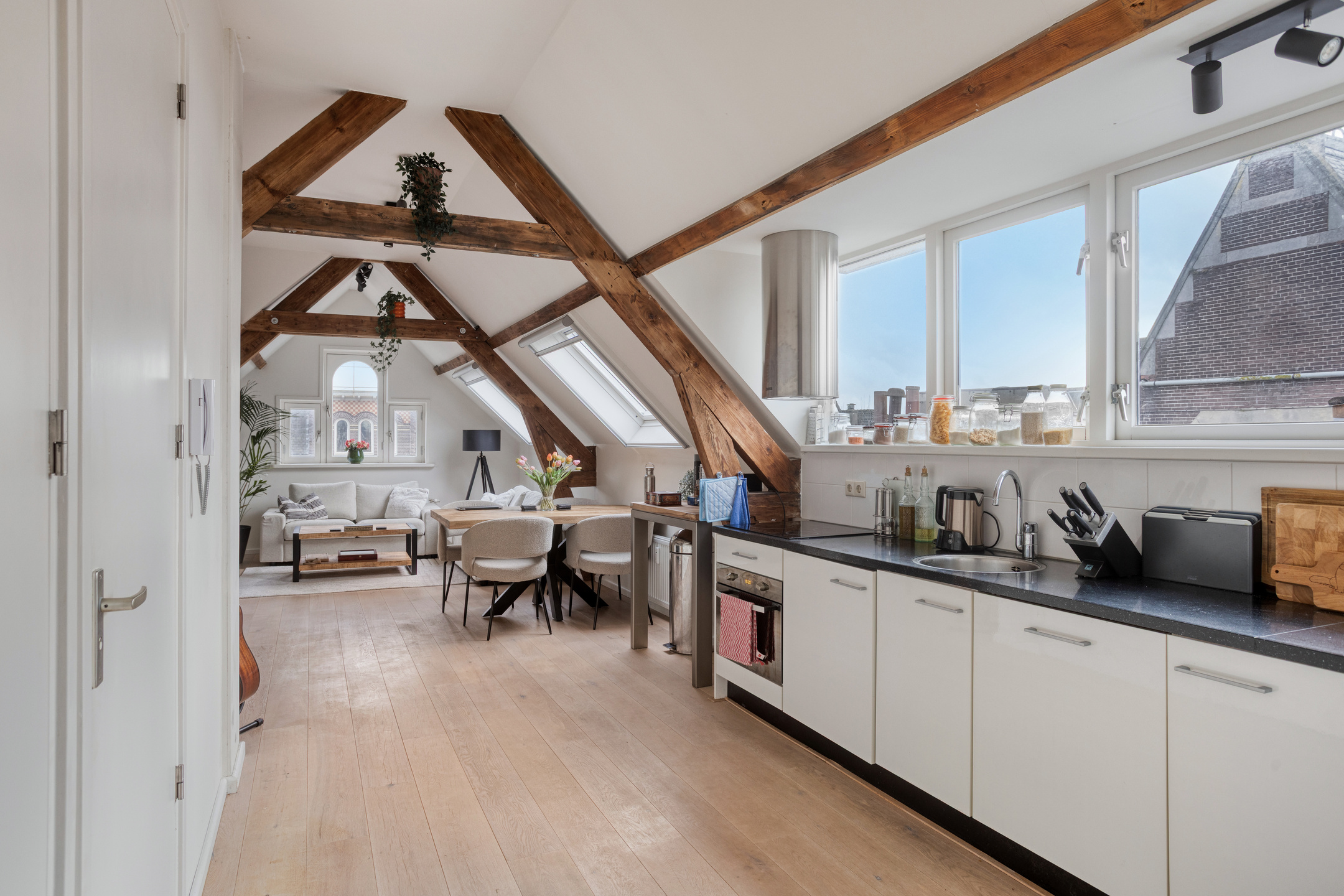 Je komt binnen in de hal, die toegang geeft tot alle ruimtes. De woonkamer is licht en sfeervol, met mooie raampartijen en een karakteristieke houten spantconstructie die direct de monumentale uitstraling van het pand benadrukt. De open keuken in wandopstelling is geplaatst in 2014 en voorzien van een stenen werkblad, 4-pits inductiekookplaat, combimagnetron, design afzuigkap, vaatwasser, koelkast en een was-/droogcombinatie – compact en praktisch ingericht. Om meer kastruimte te creëren is een inbouwkast gerealiseerd aan de rechterzijde van de keuken.