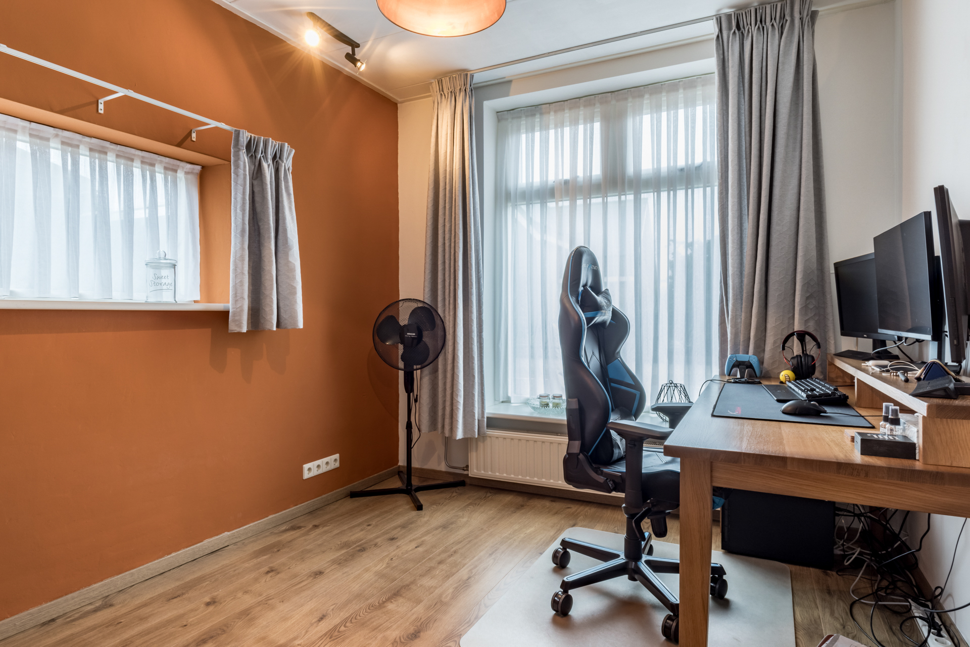 Hal, trapopgang en meterkast. Vanuit de hal kom je ook in de (slaap)kamer aan de voorzijde. Deze ruimte is te gebruiken als kantoor maar ook als slaapkamer.