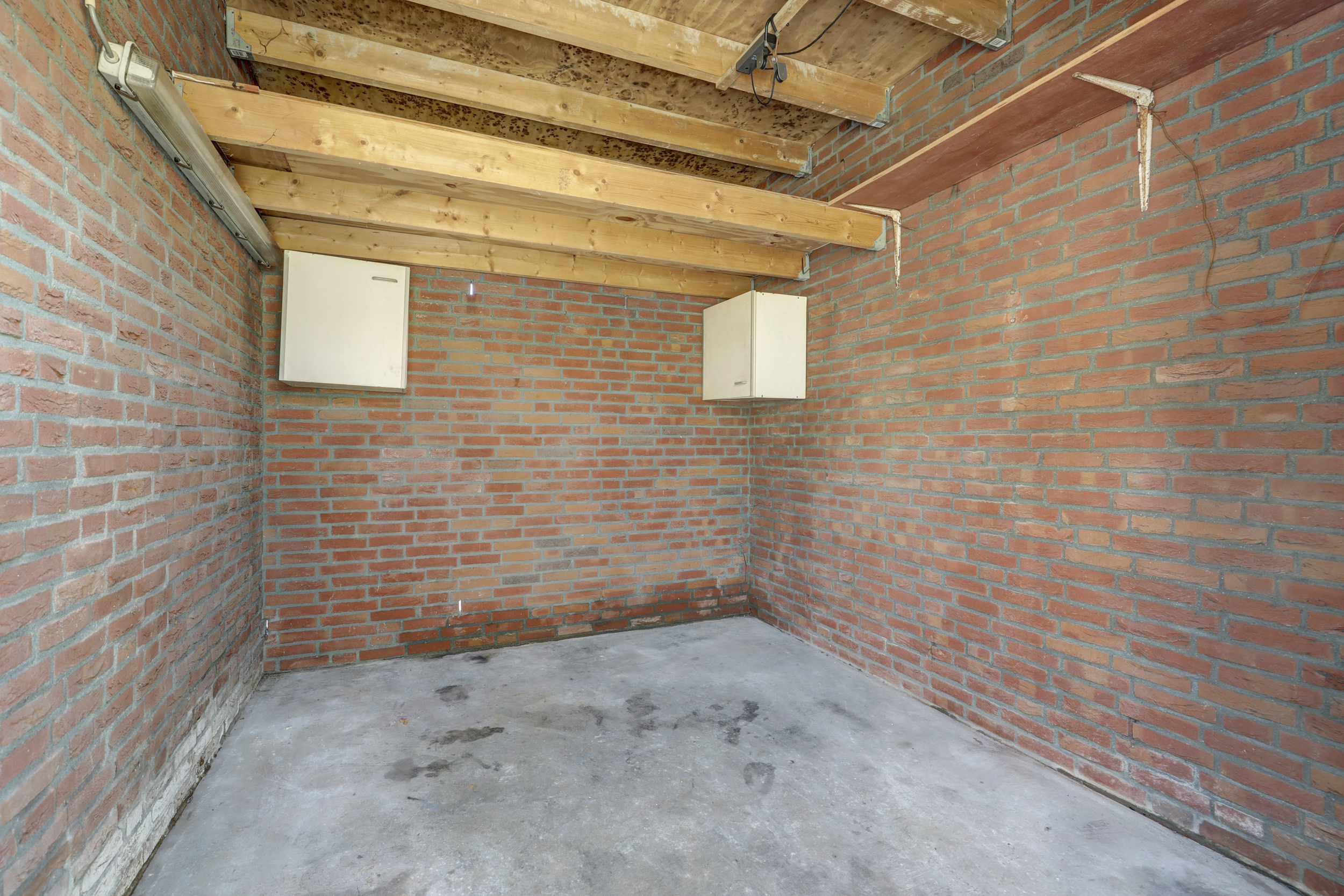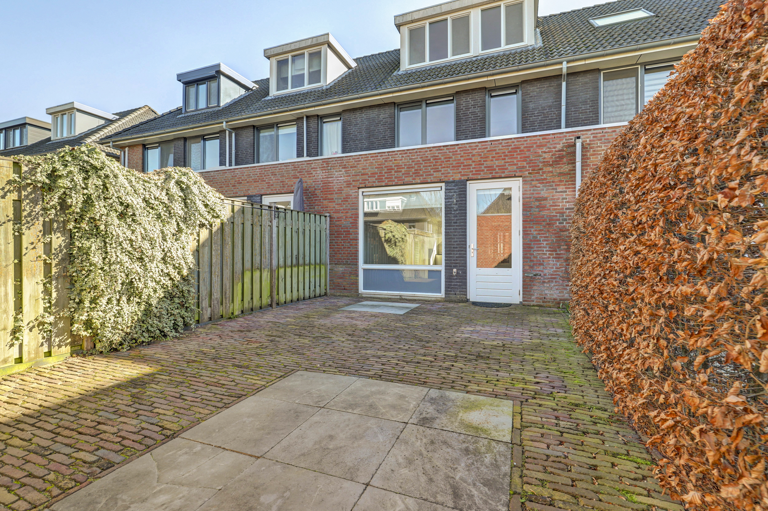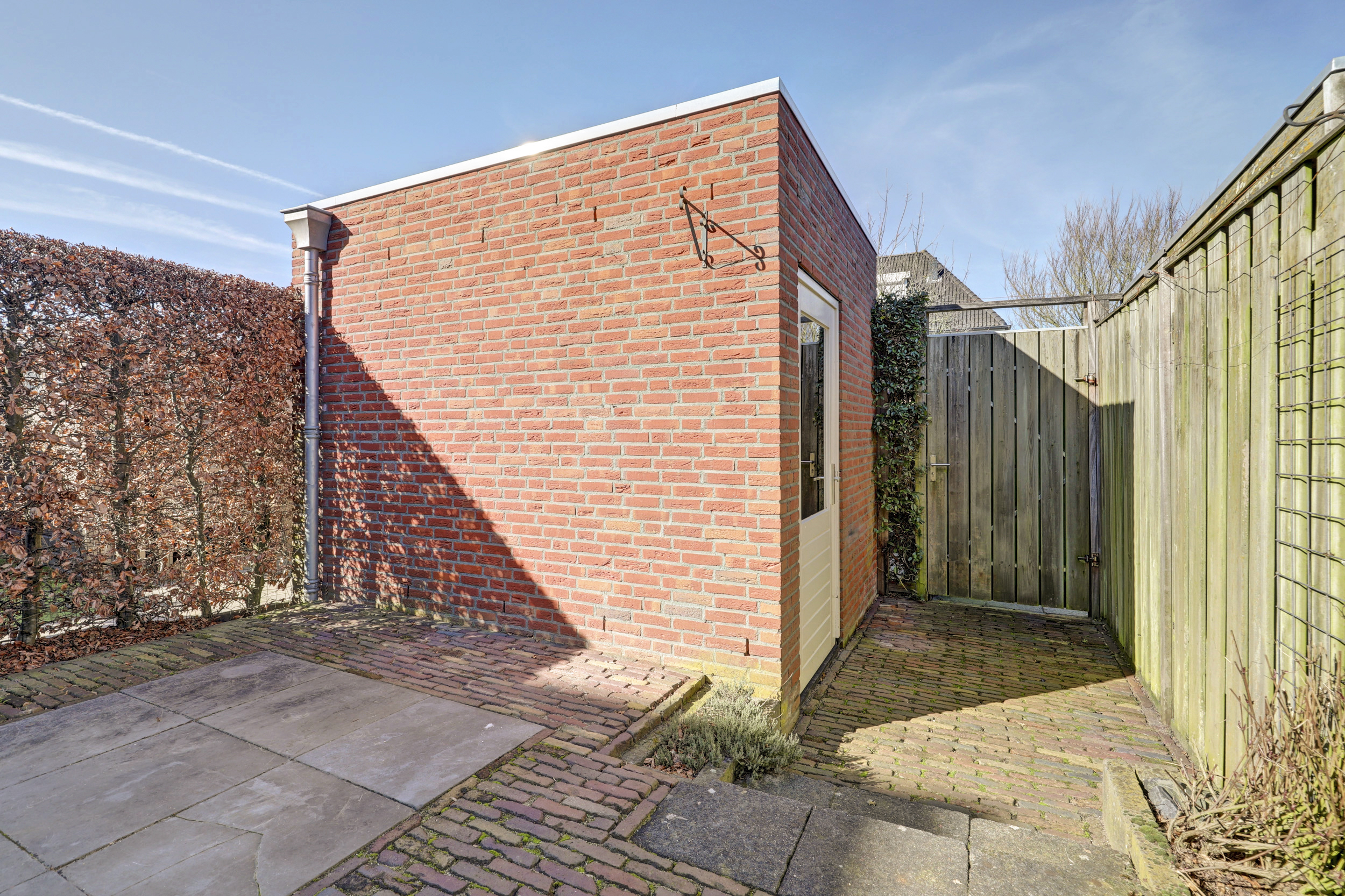 Aan de voorzijde ligt een onderhoudsvriendelijke voortuin. De achtertuin is volledig onderhoudsvrij aangelegd en biedt ruimte om comfortabel buiten te zitten. Achter in de tuin staat een stenen berging, ideaal voor fietsen en tuingereedschap. Via de achterom is de tuin ook eenvoudig bereikbaar.
