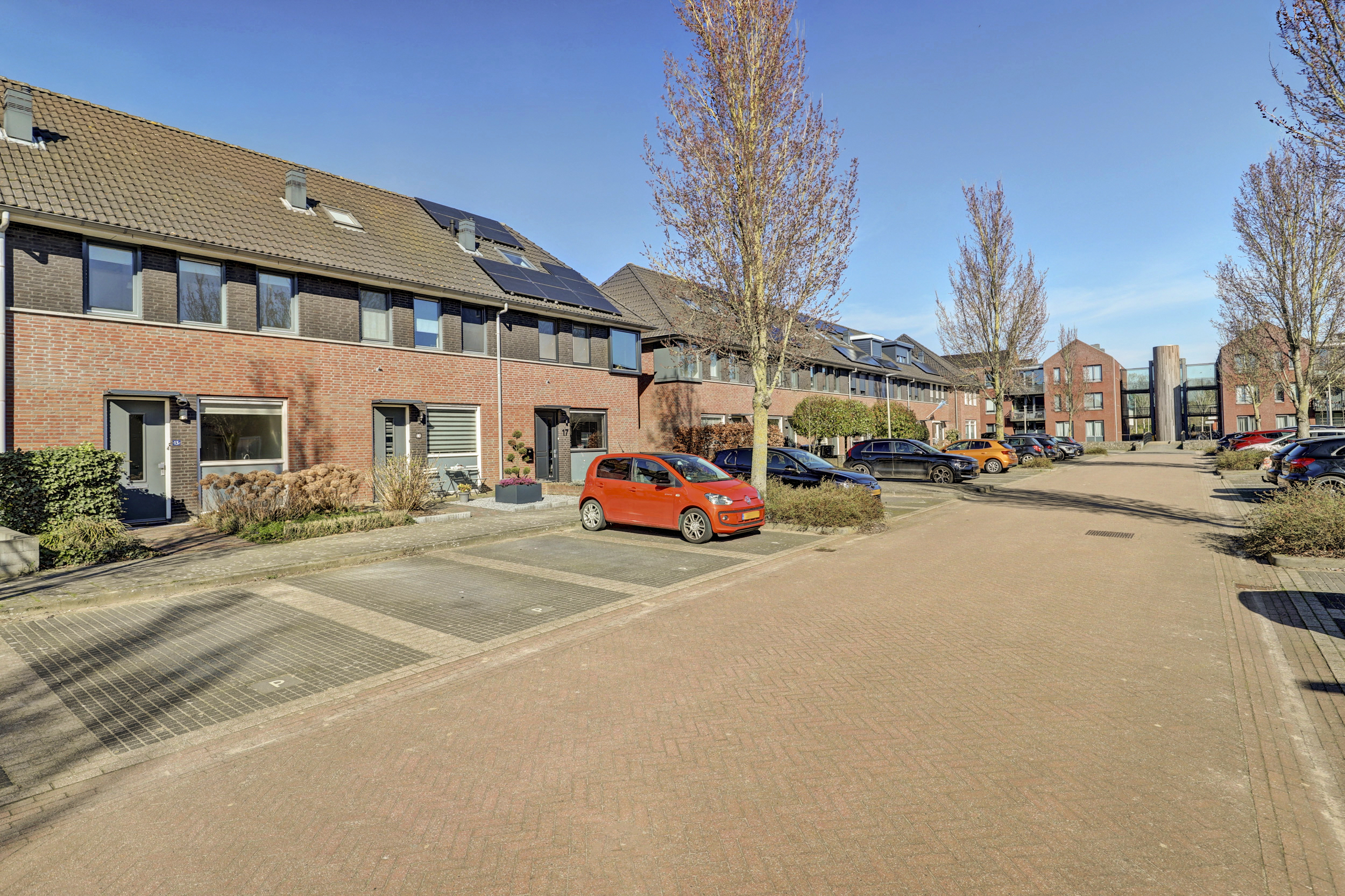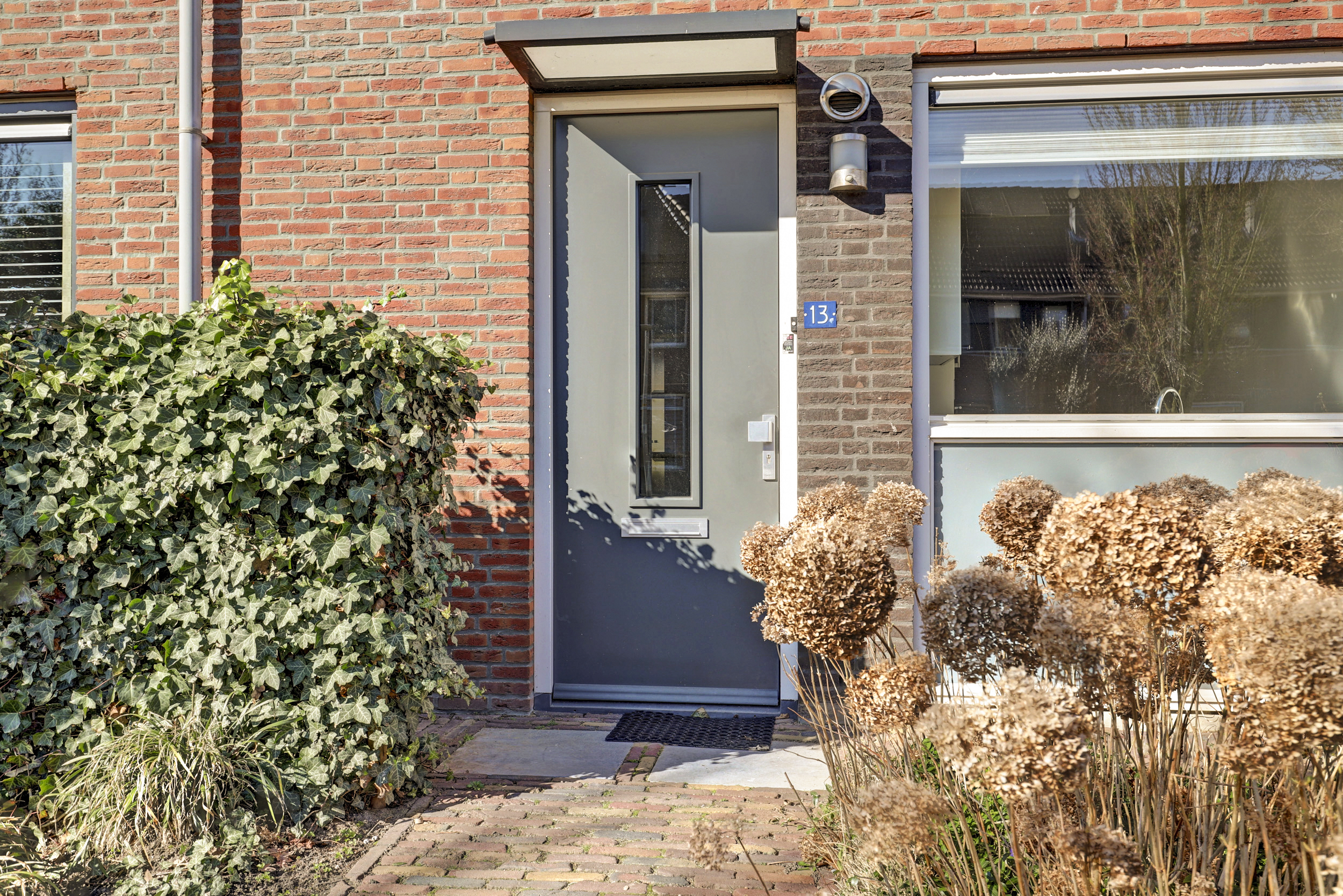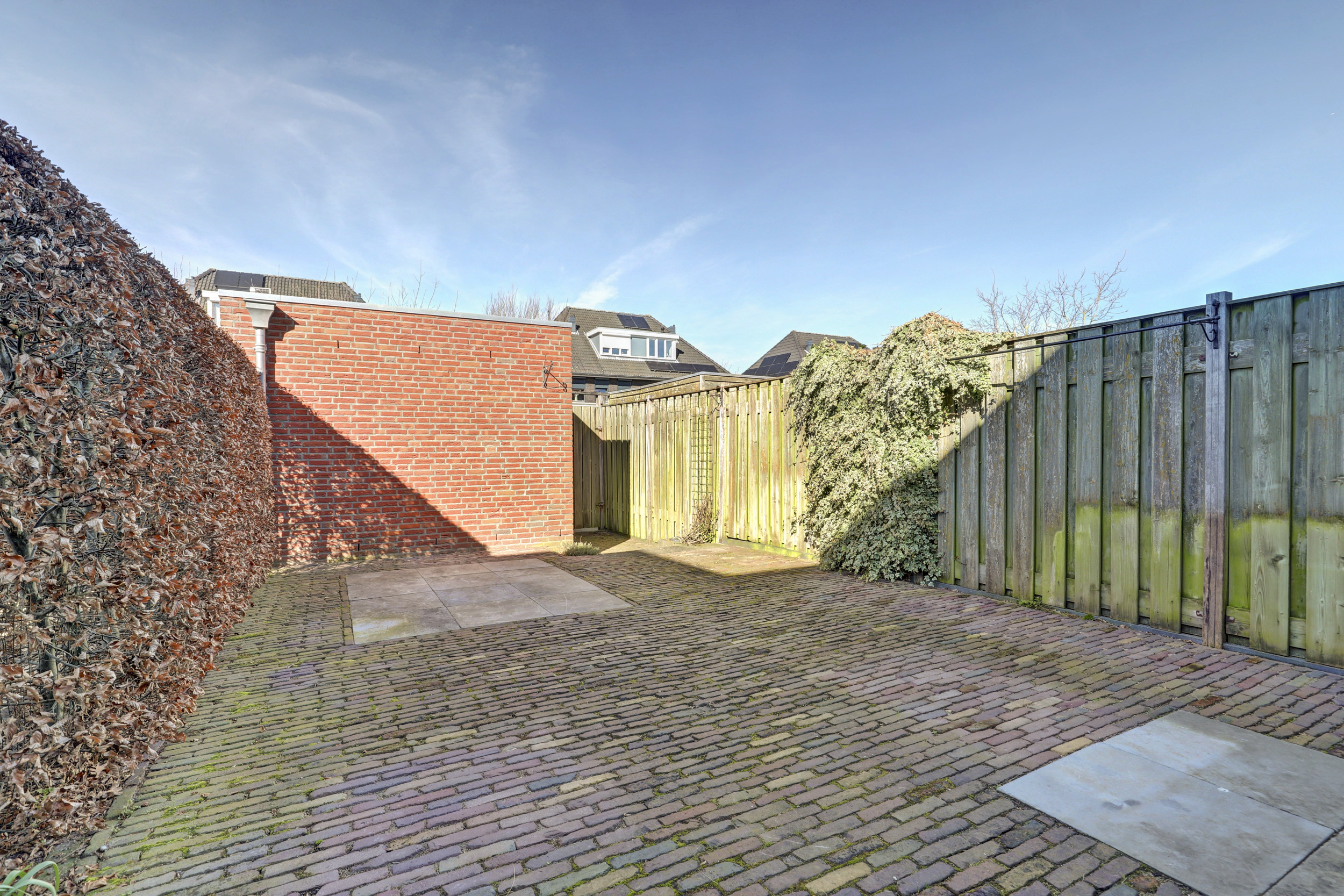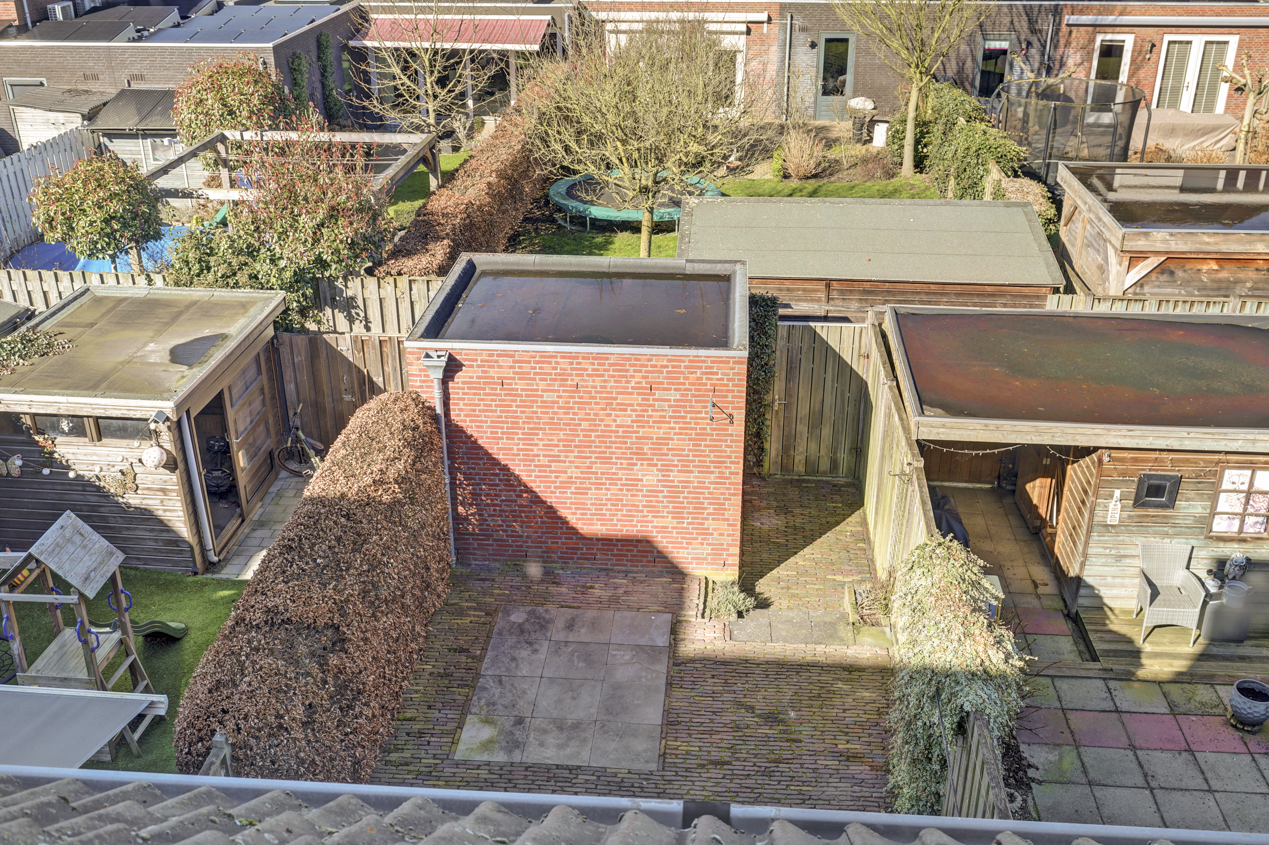 Aan de voorzijde ligt een onderhoudsvriendelijke voortuin. De achtertuin is volledig onderhoudsvrij aangelegd en biedt ruimte om comfortabel buiten te zitten. Achter in de tuin staat een stenen berging, ideaal voor fietsen en tuingereedschap. Via de achterom is de tuin ook eenvoudig bereikbaar.