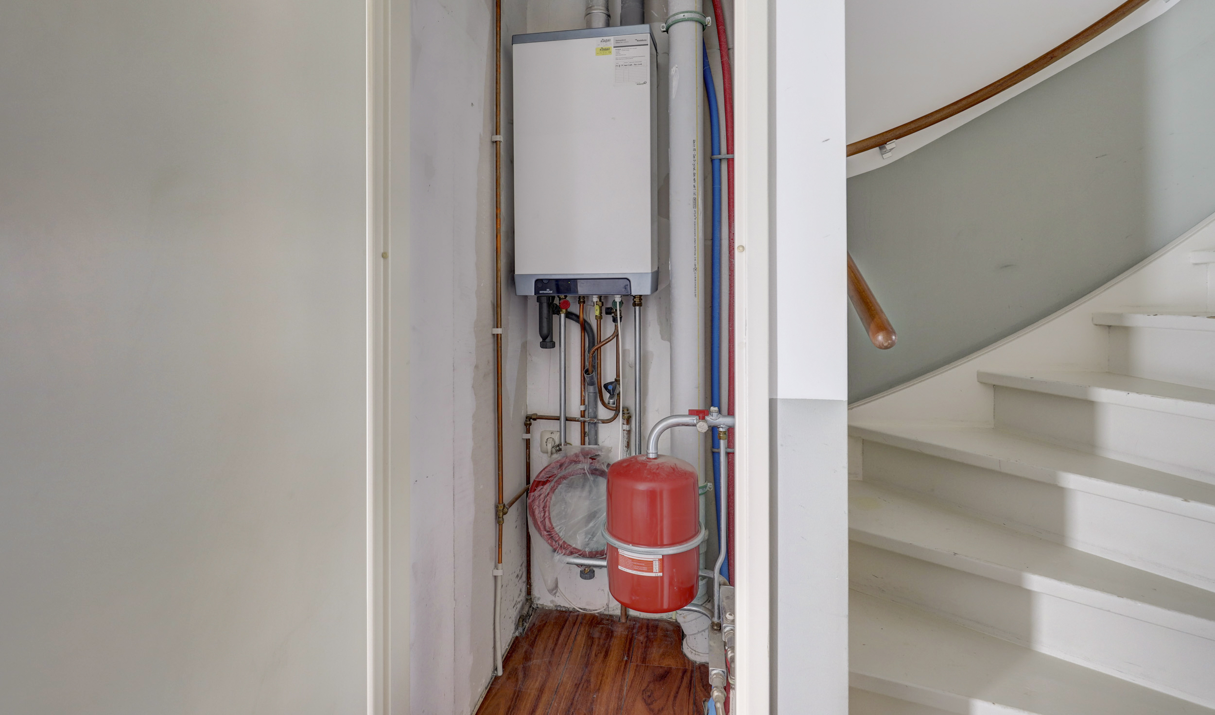 Achter de slaapkamer is extra bergruimte gecreëerd. Daarnaast bevinden zich hier de witgoedaansluiting en de mechanische ventilatie-unit.