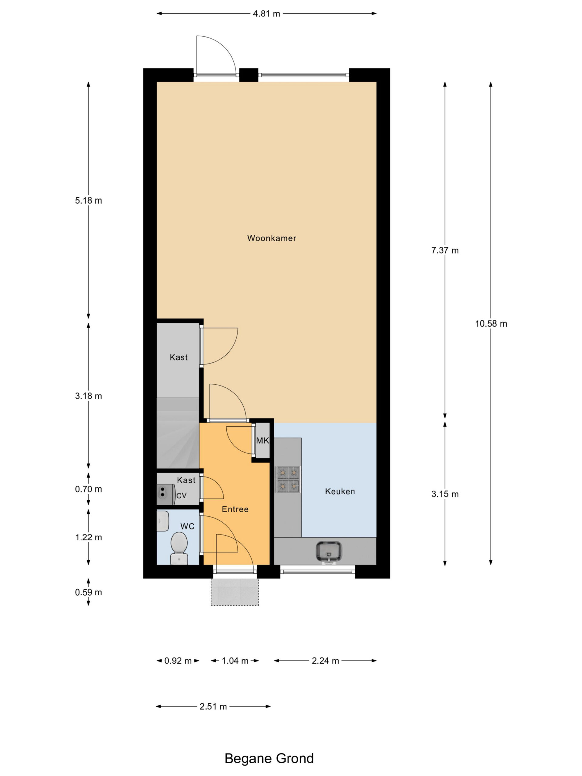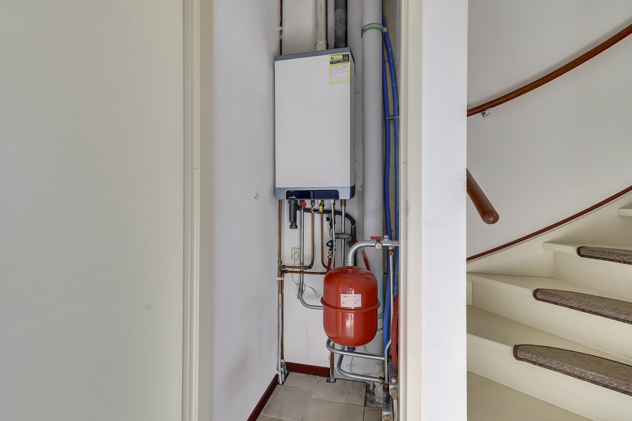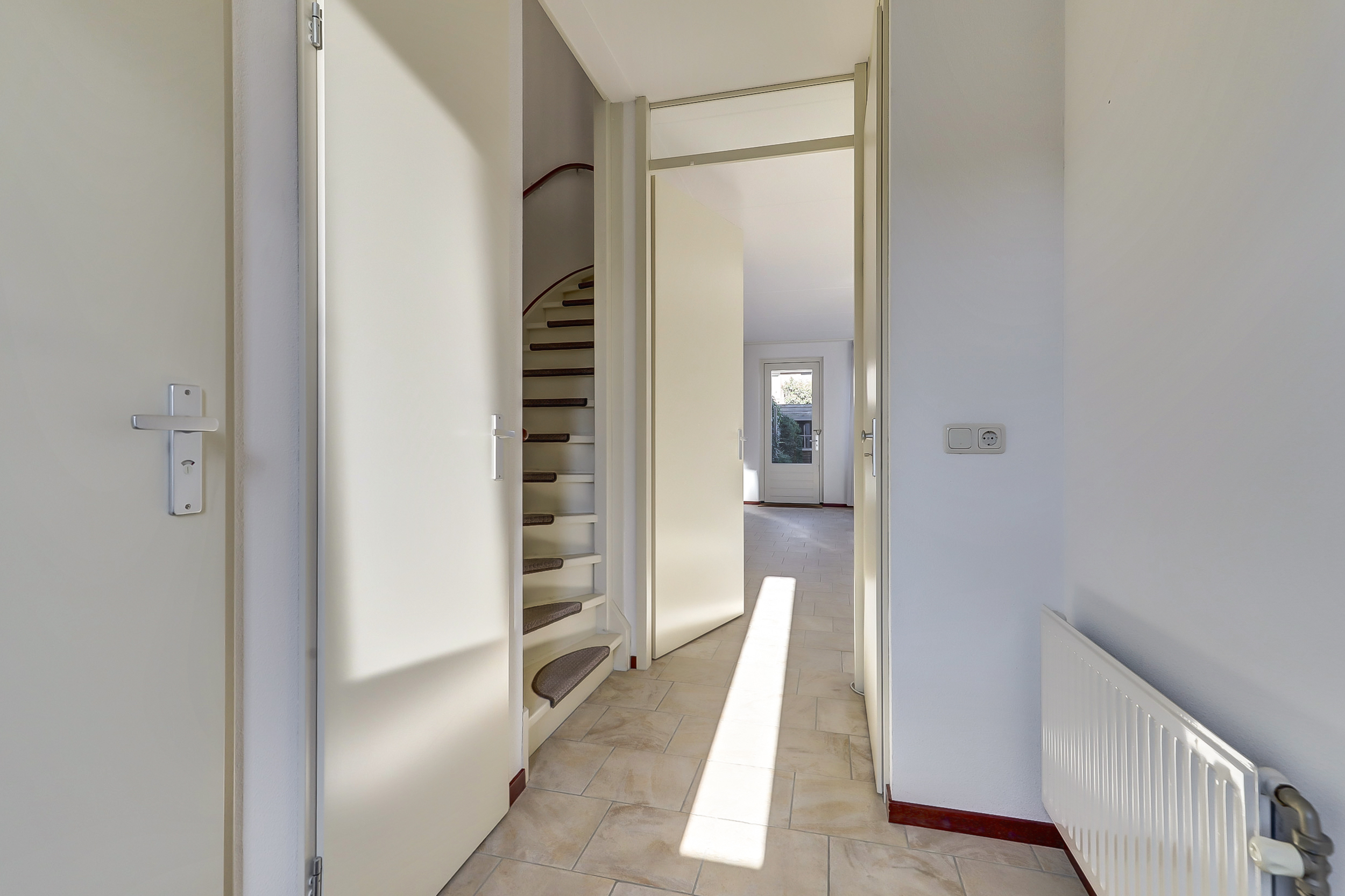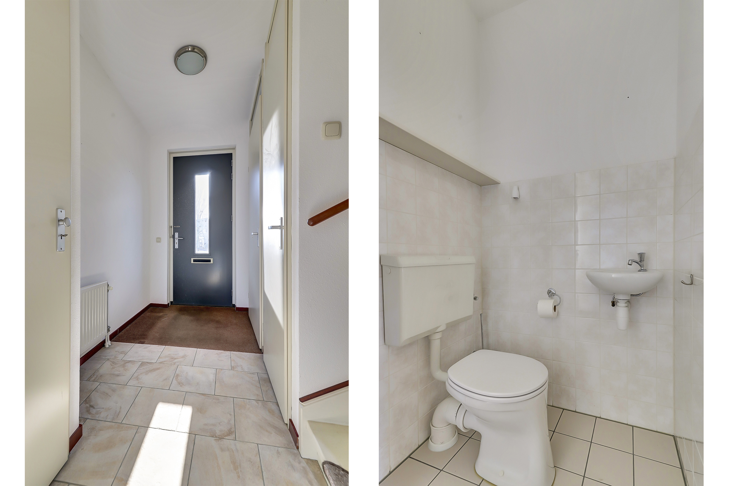 Je komt binnen in de entree/hal met meterkast, garderobekast met cv-ketel (Intergas 2008), moderne toiletruimte met toilet en fonteintje en de trapopgang naar boven.