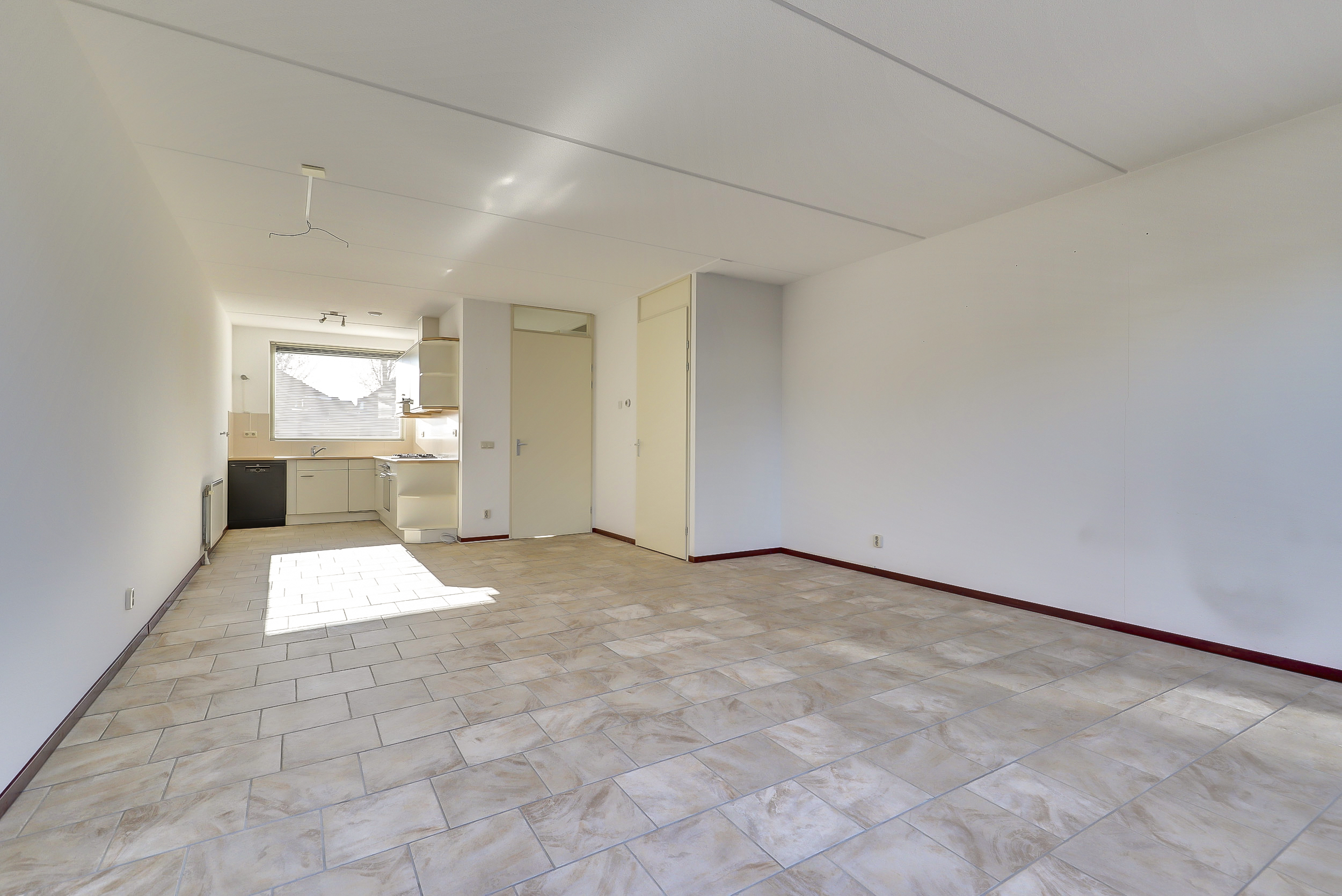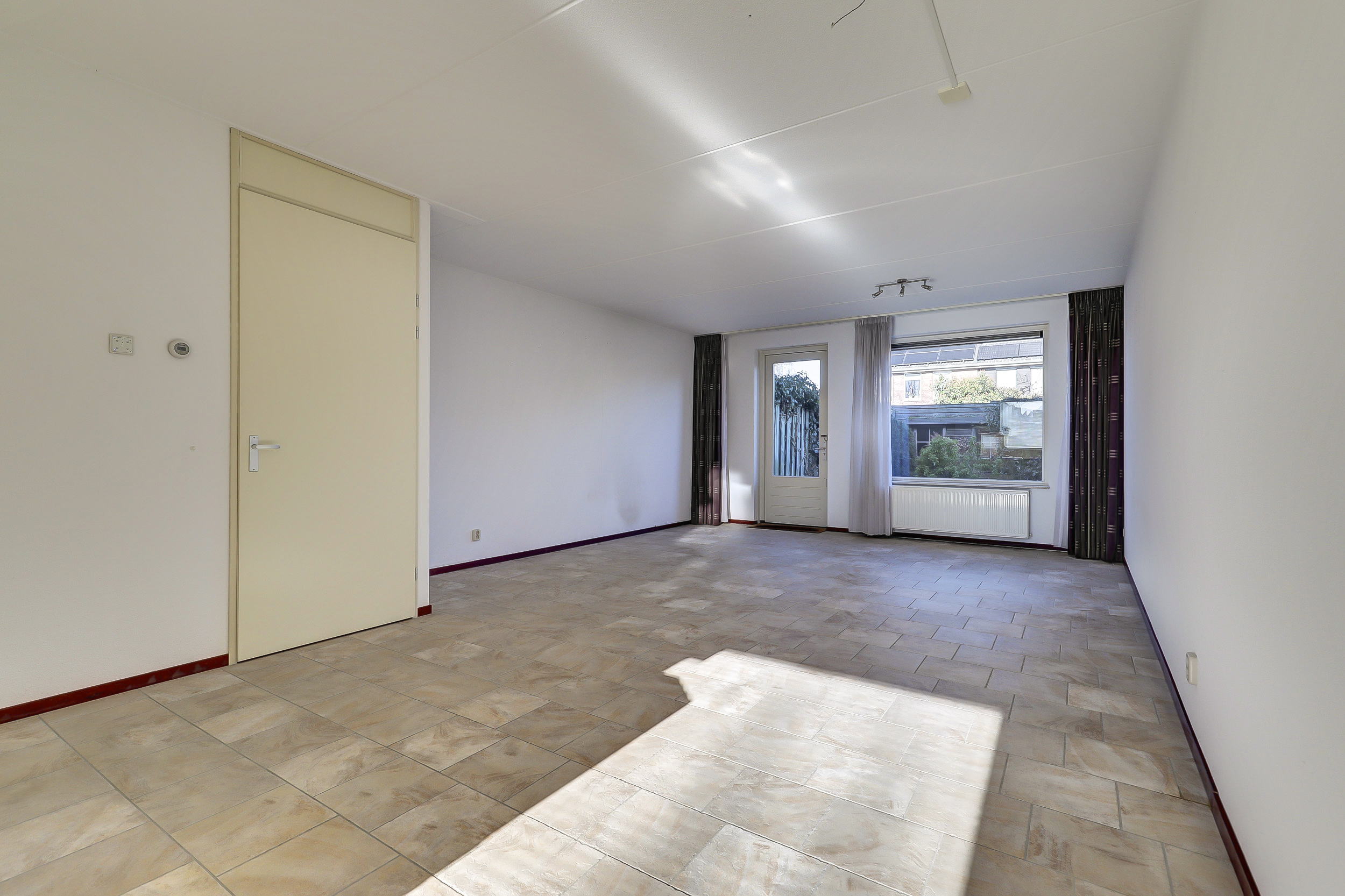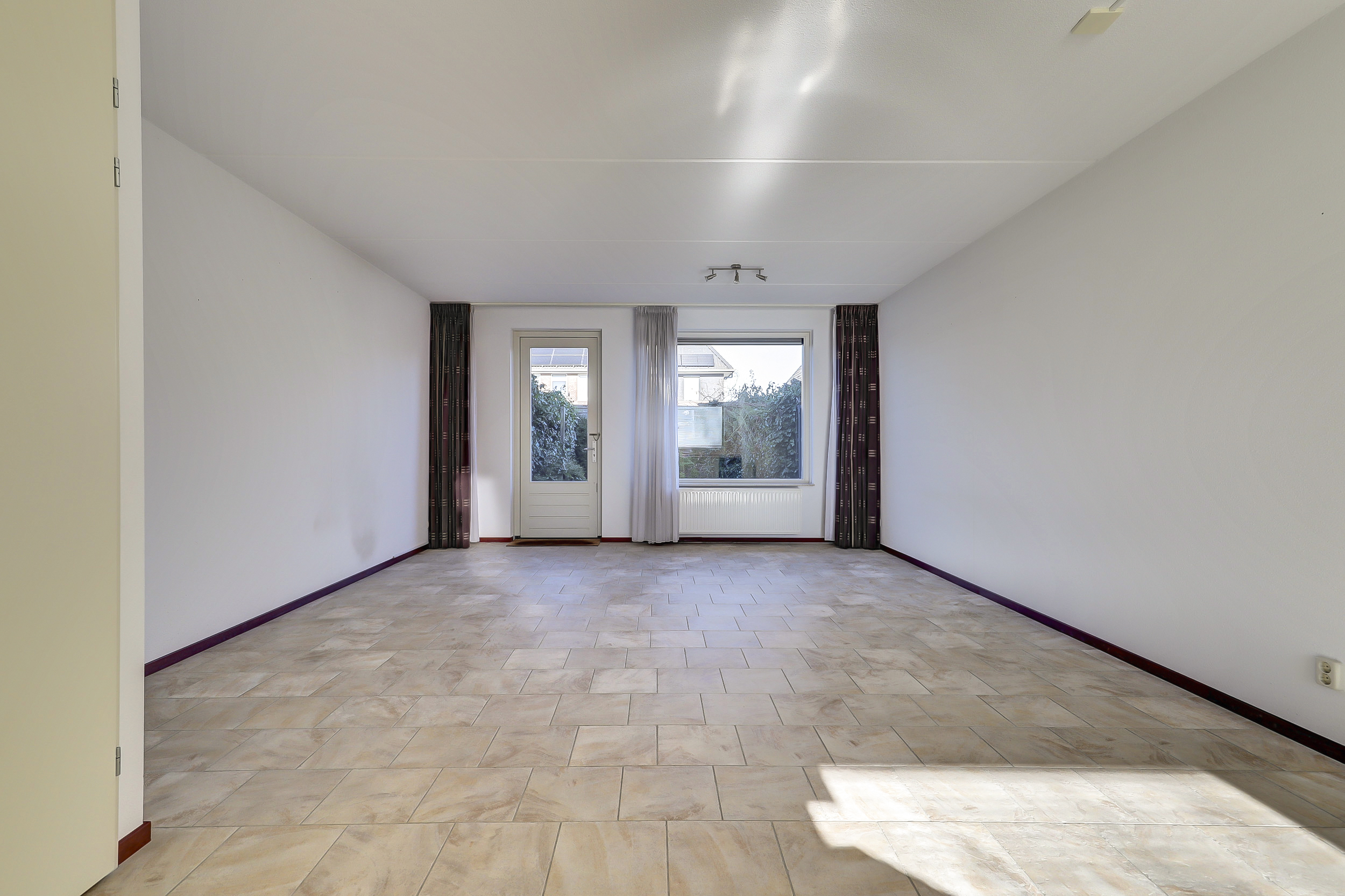 Vanuit de hal loop je door naar de ruime woonkamer van circa 35 m². Hier opent de leefruimte zich direct naar de achtertuin en laat het grote raam veel daglicht binnen. Via de achterdeur stap je zo het terras op en de tuin in.