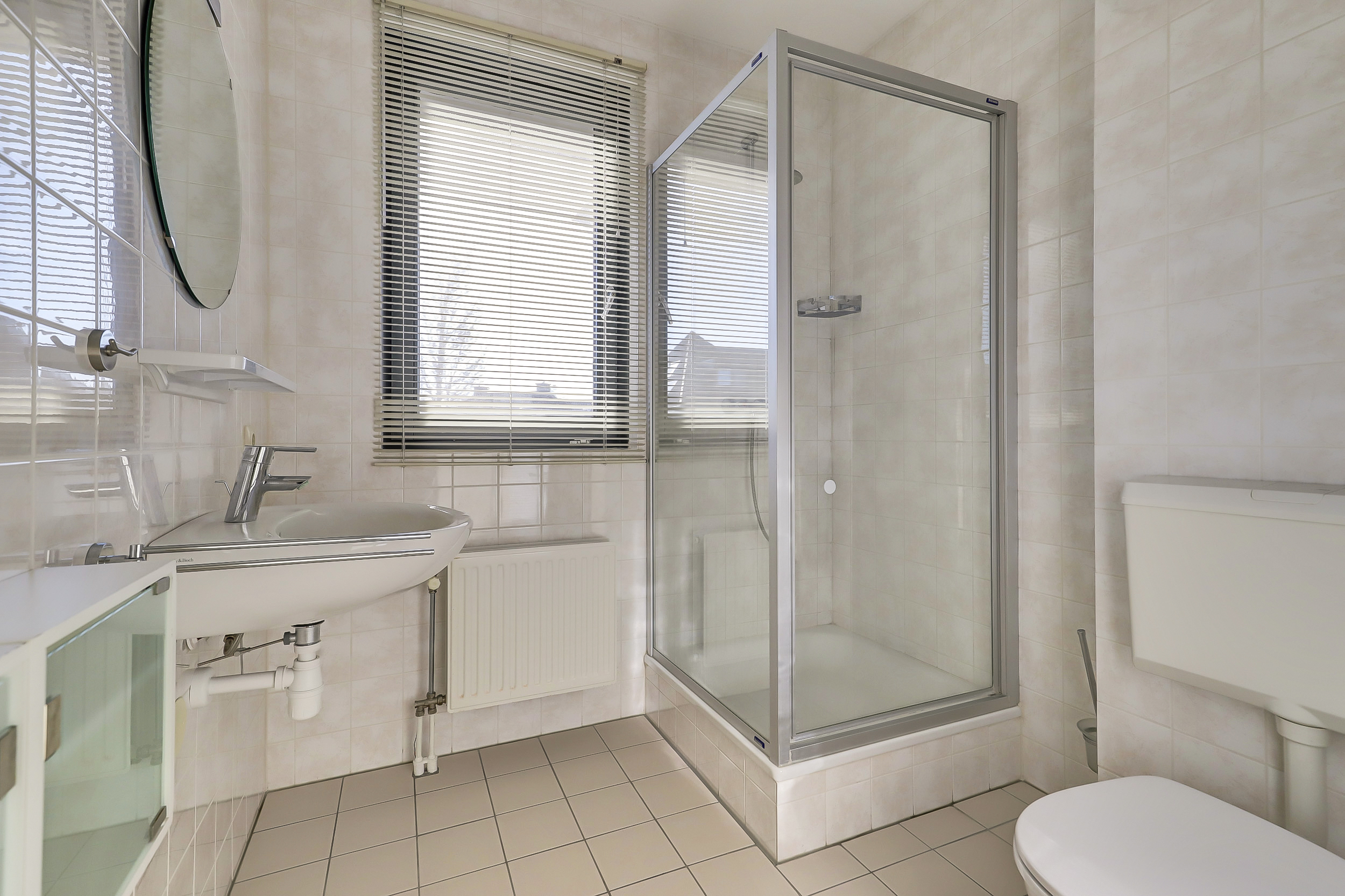 De overloop geeft toegang tot twee ruime slaapkamers van circa 18 m² en 11 m². Beide kamers zijn netjes afgewerkt met een laminaatvloer, radiatoren en houten draai-kiepramen met ventilatieroosters. De badkamer is volledig betegeld en voorzien van een douchecabine, wastafel en toilet.