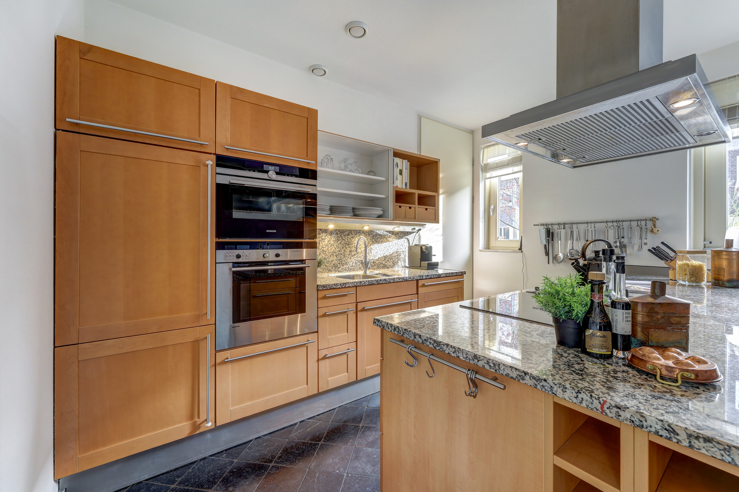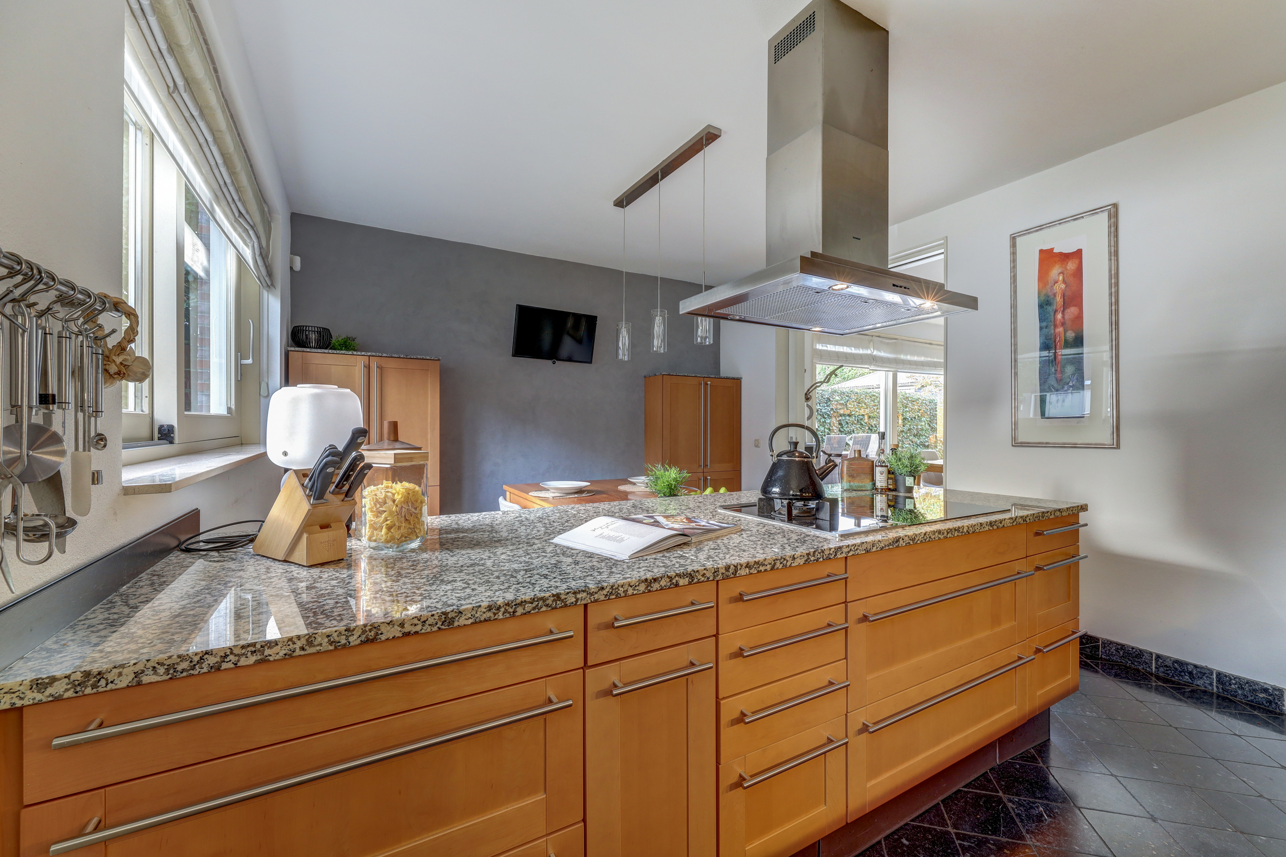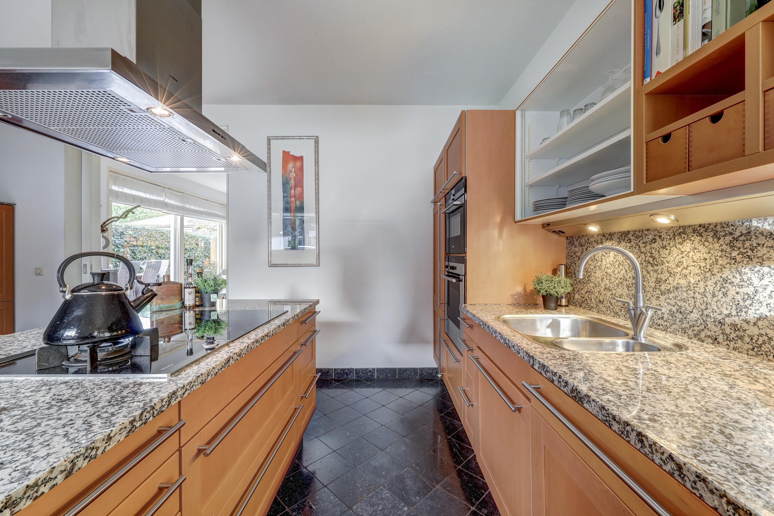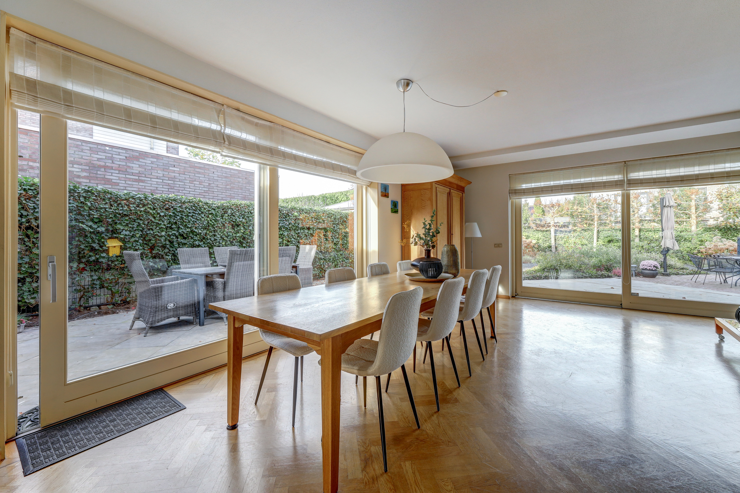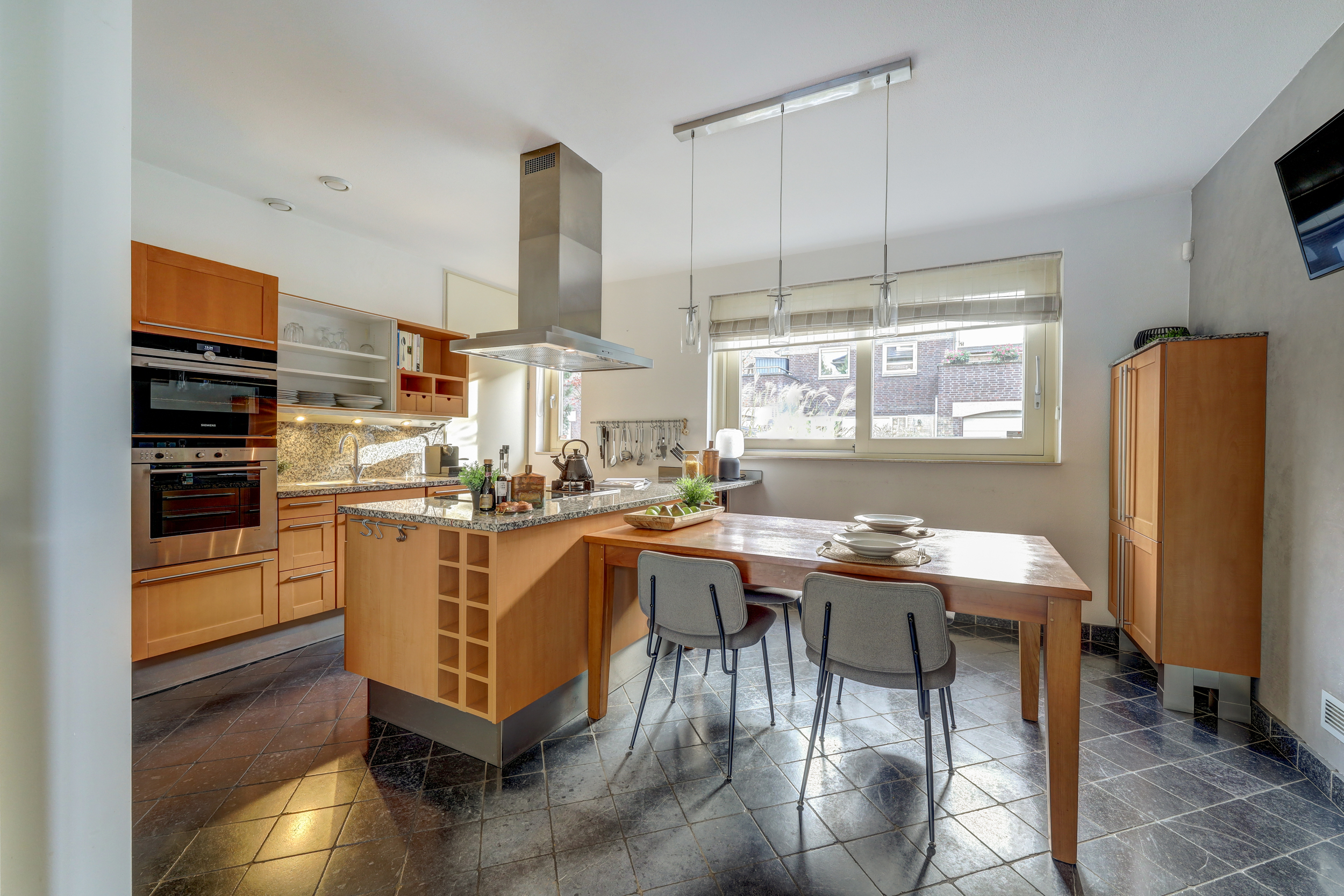 Binnenkomend via de ruim opgezette entree/hal met sfeervolle vide, mooie Belgisch hardsteen vloer, praktische schuifkastenwand en toegang tot de 2 woonkamers, bijkeuken en de trapopgang naar de verdiepingen. In de hal bevinden zich tevens een praktische schuifkastenwand, de meterkast (klikgroepen, alarmsysteem en glasvezel) en de toiletruimte met wandcloset en fontein. De royale uitgebouwde woon-/eetkamer met visgraat parketvloer, spuitwerk wand- en plafondafwerking biedt dankzij de grote ramen en 2 schuifpuien een prachtige lichtinval en directe verbinding met de zij- en achtertuin. Een sfeervolle gashaard zorgt voor extra gezelligheid, terwijl de tuin op zonnige dagen een verlengstuk van de woonkamer vormt. Via de schuifdeuren is de multifunctionele 2de woonkamer te bereiken. Ook deze ruimte is netjes afgewerkt en voorzien van schuifpui. De ruime woonkeuken is tevens vanuit de woonkamer via schuifdeuren te bereiken en is gelegen aan de voorzijde van de woning. De keuken is volledig uitgerust, heeft veel kastruimte/lades, natuursteen aanrechtblad, ruimte voor 4-persoons eettafel, Belgisch hardsteen vloer en voorzien van diverse inbouwapparatuur, o.a. 4-pits inductie kookplaat met wok brander, afzuigkap, oven, combioven, koelkast en vaatwasser. Aangrenzend vind je een praktische bijkeuken met wasmachine en droger aansluiting. De gehele begane grond is voorzien van heteluchtverwarming.