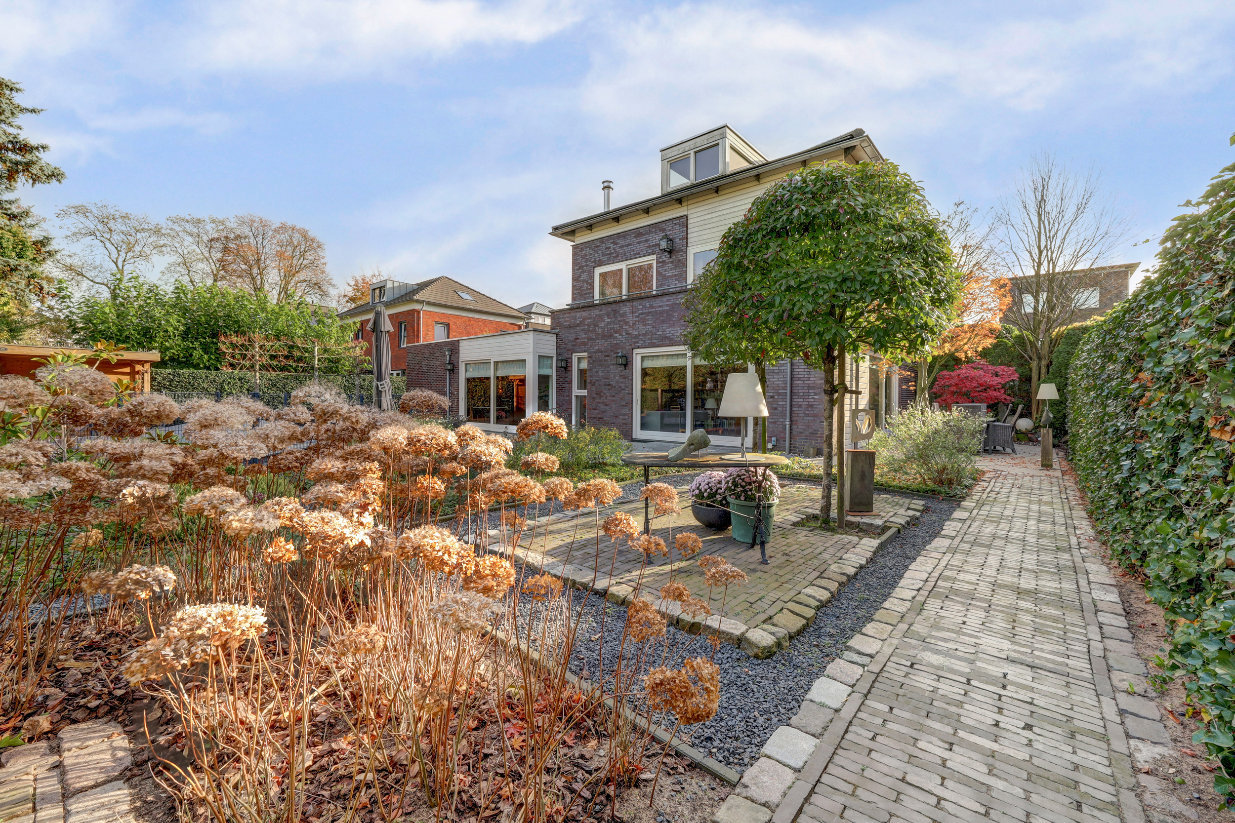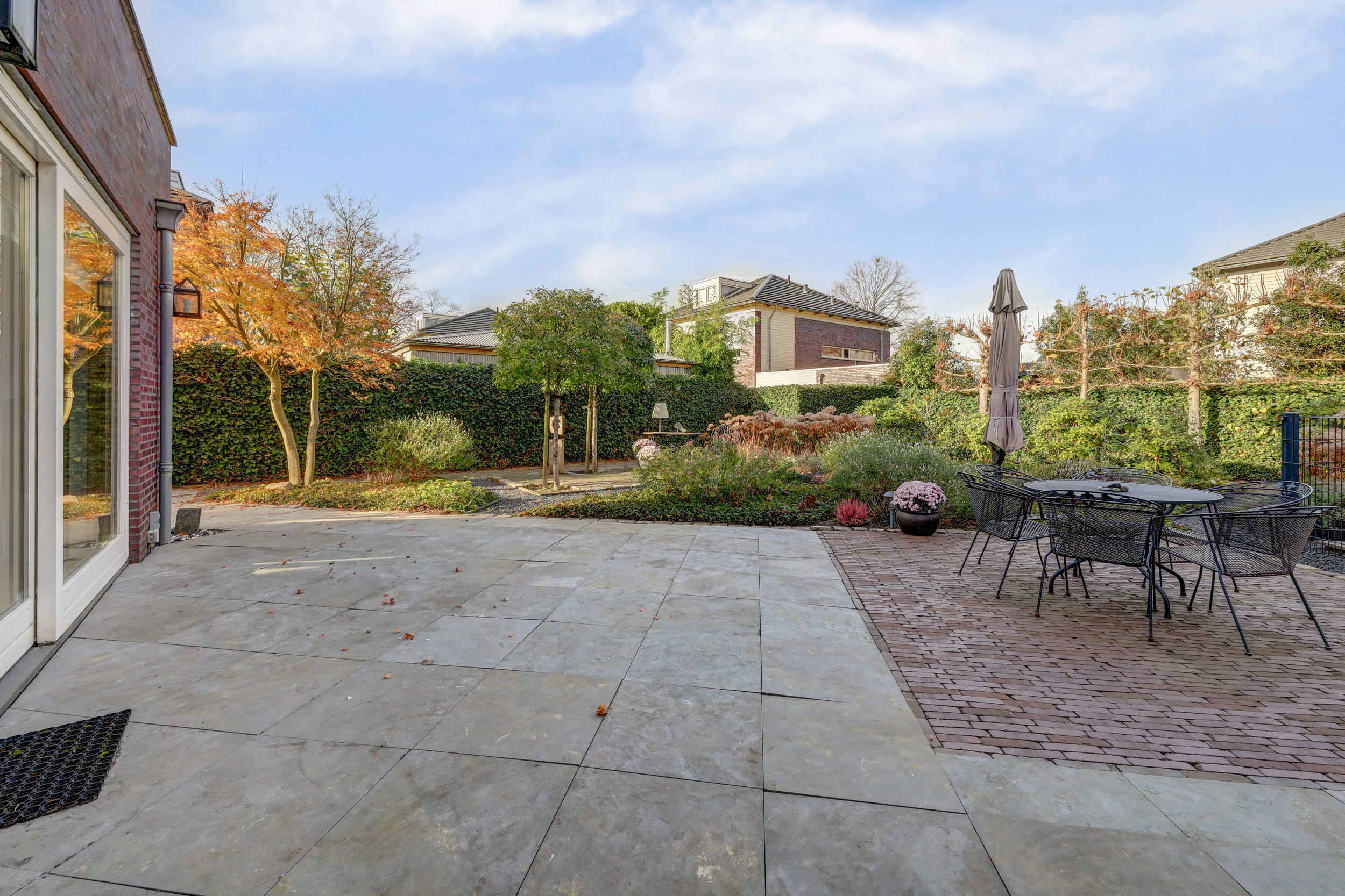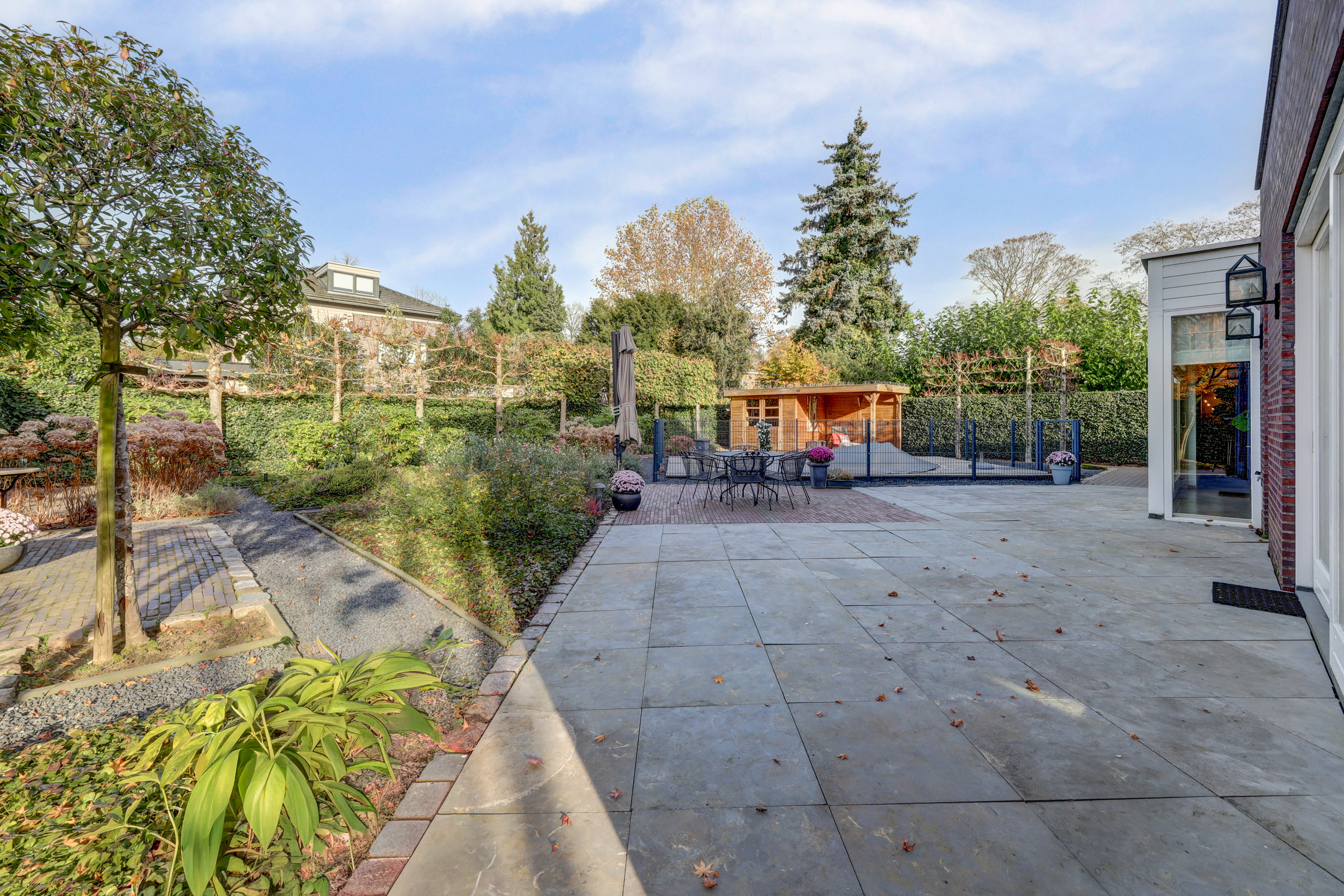 De achtertuin op het noorden, is verzorgd aangelegd en biedt volop ruimte om te ontspannen en te genieten van de zon of de schaduw. Door de ligging heb je veel vrijheid en privacy. Het ruime perceel, meerdere terrassen (boven het zijterras bevindt zich een zonnescherm), het zwembad (ca. 1,50 m diep), de houten berging met overkapping, sproei installatie, elektrapunten, buitenkraan en achterom via poort maken dit een fijne plek om te genieten. De houten berging van ca. 6 m² met elektra en opstelplaats voor de pomp van de sproei installatie en de pomp en het filter van het zwembad. Voor de garage kun je op de eigen oprit met meerdere auto’s naast elkaar parkeren. De voortuin is netjes en onderhoudsvriendelijk aangelegd.