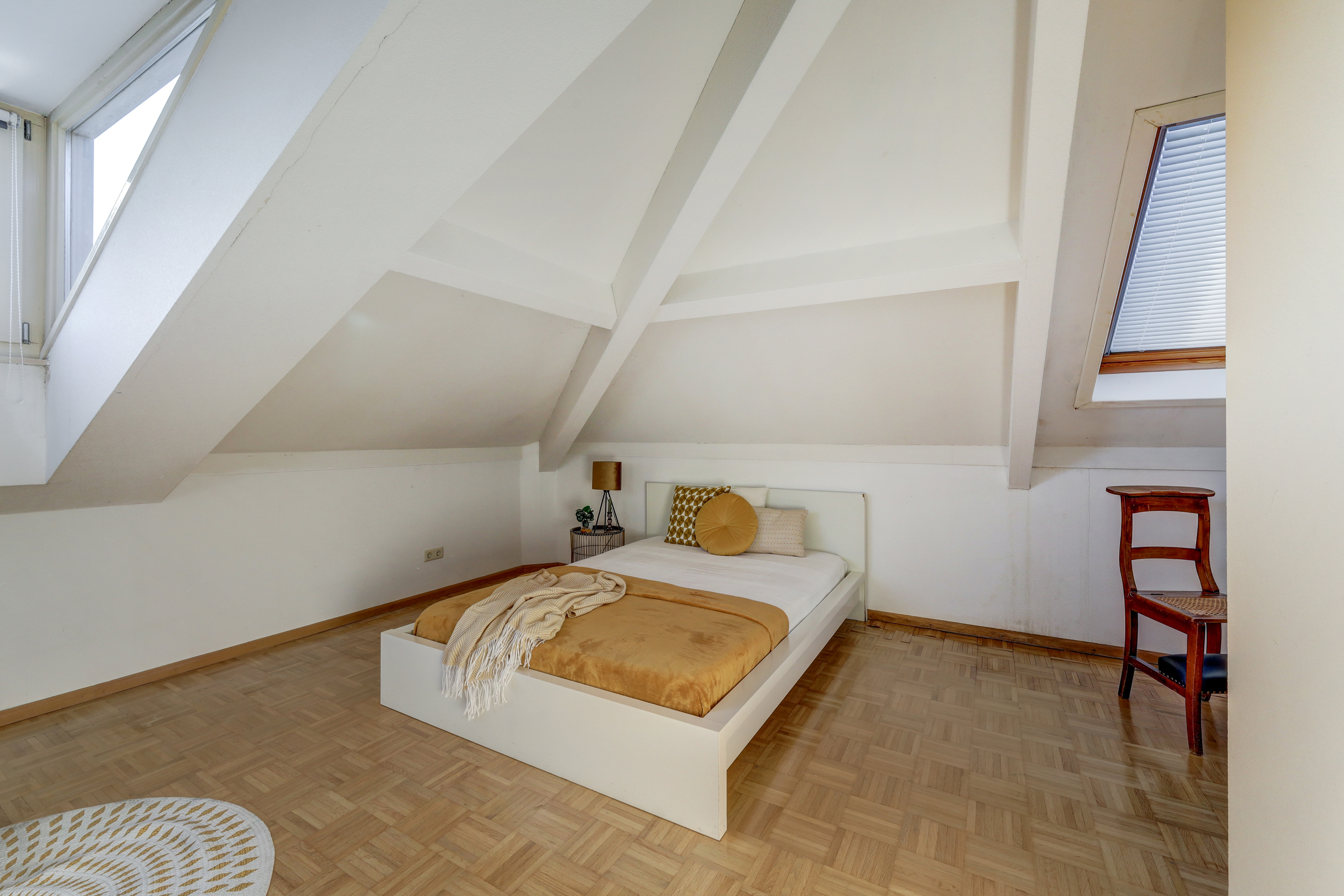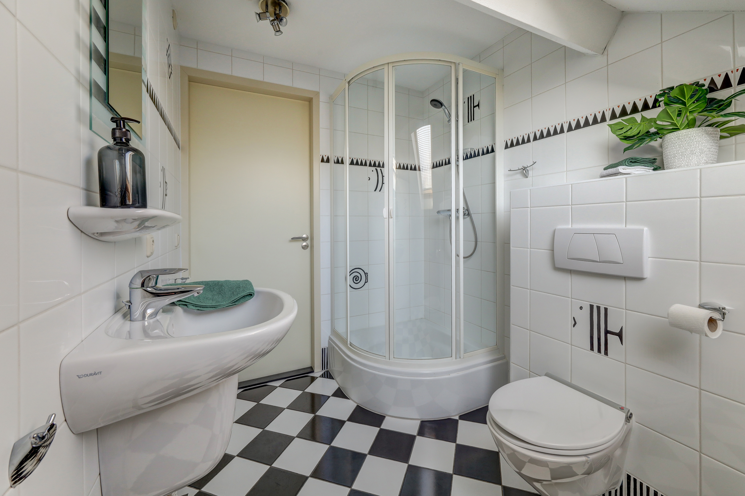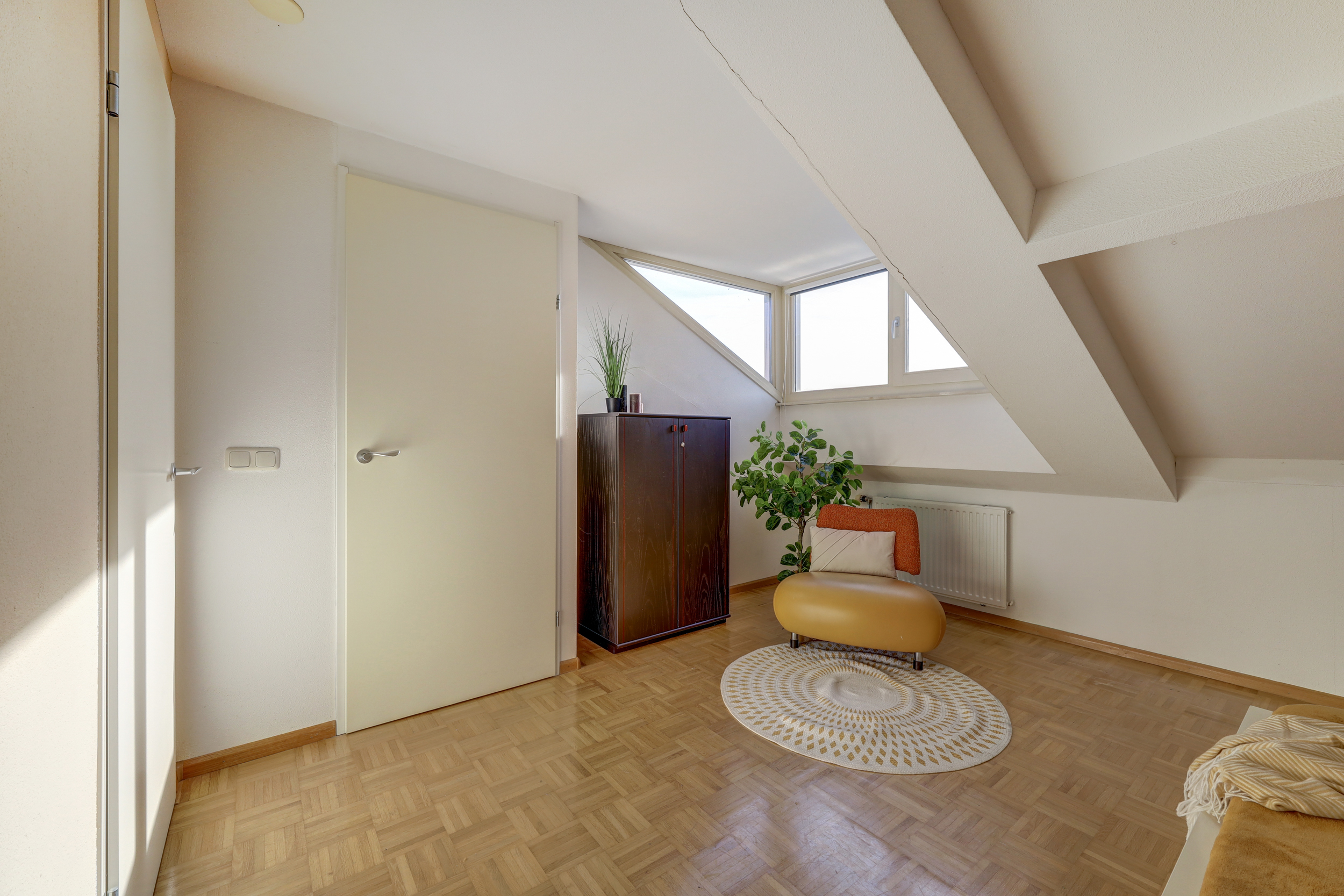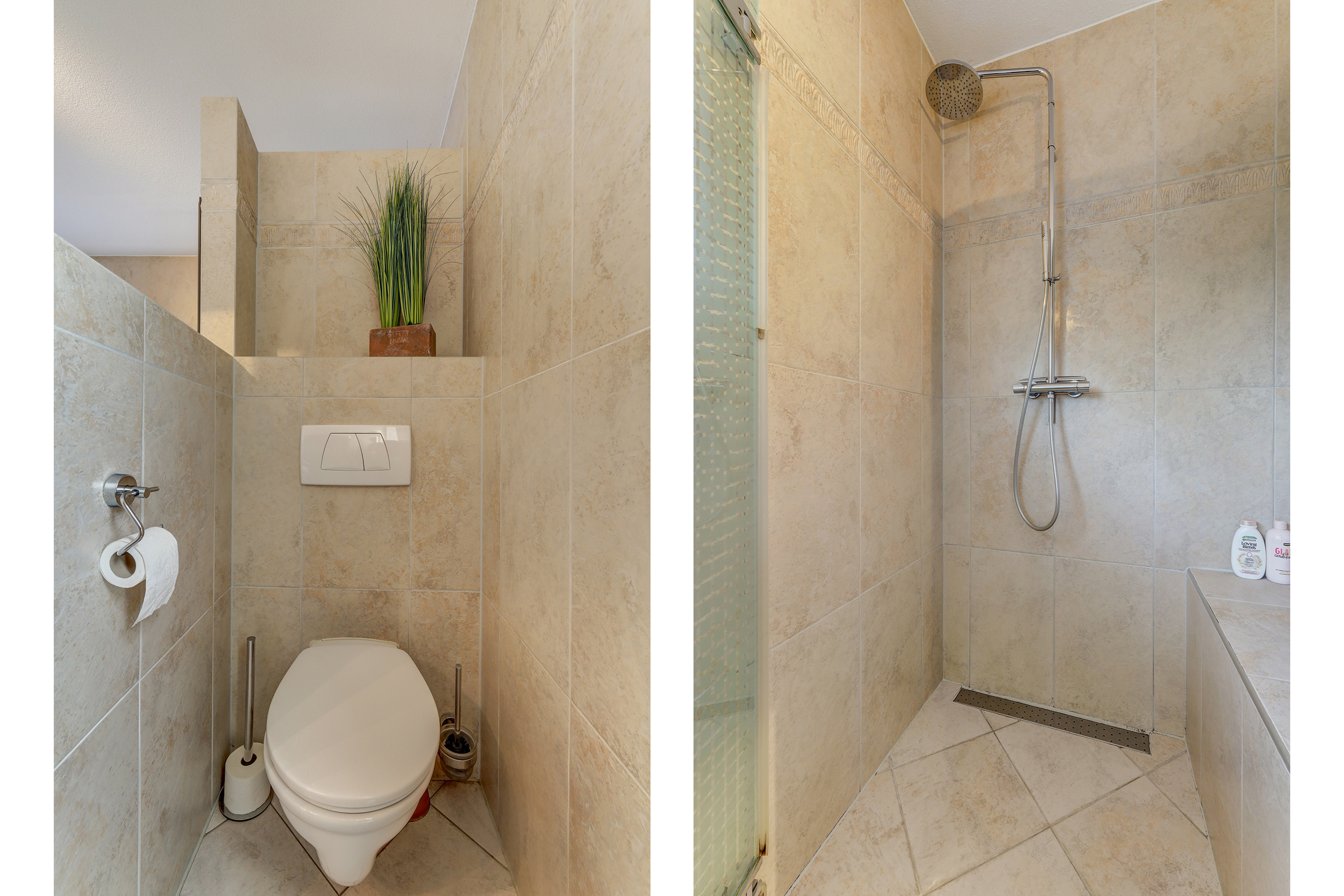 Via de trapgang kom je op de overloop. Vanuit de overloop zijn de 2 slaapkamers, de badkamer en de technische ruimte te bereiken. De 2 slaapkamers zijn ruim en beide voorzien van parketvloer, spuitwerk wand- en plafondafwerking , dakkapel, dakvenster en een vaste kast voor extra bergruimte of als kledingkast. De badkamer heeft een douche cabine, wandcloset, wastafel, verwarming, dakvenster en is geheel betegeld. In de technische ruimte/berging bevinden zich de Cv-ketel (Itho Daalderop, 2014) en de mechanische ventilatie box.