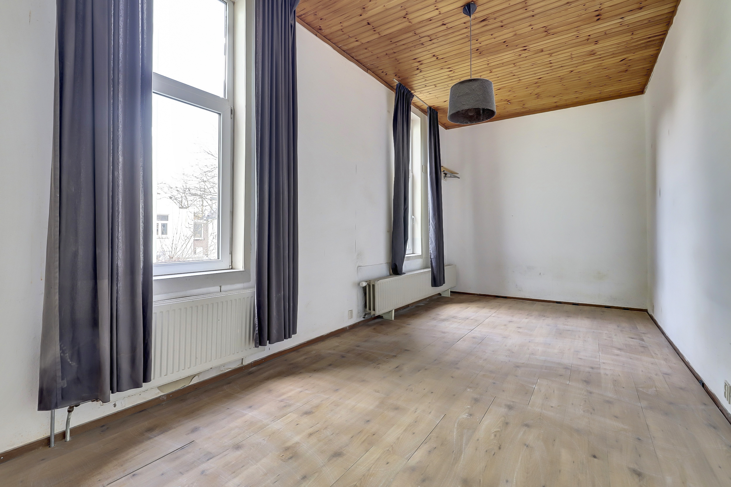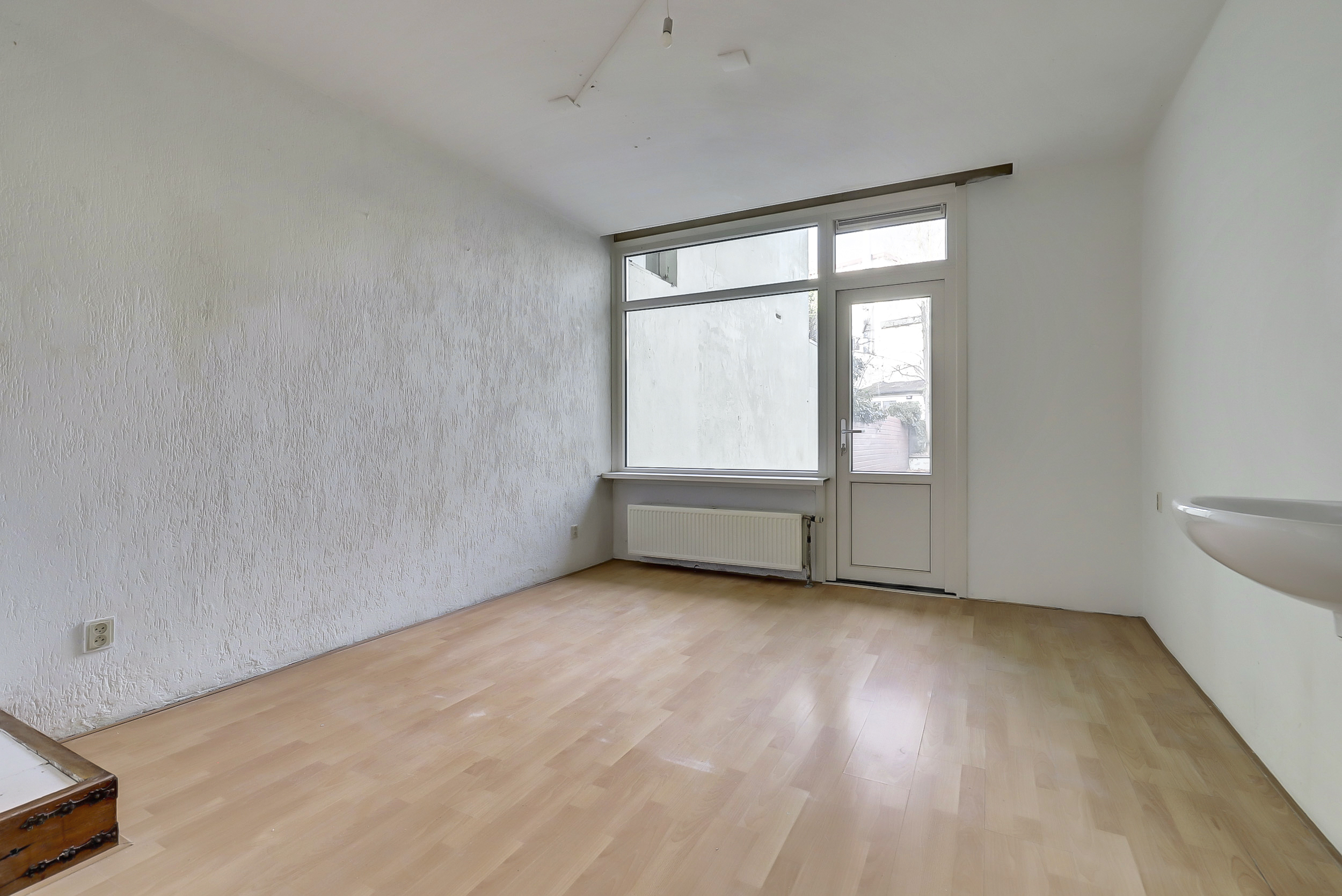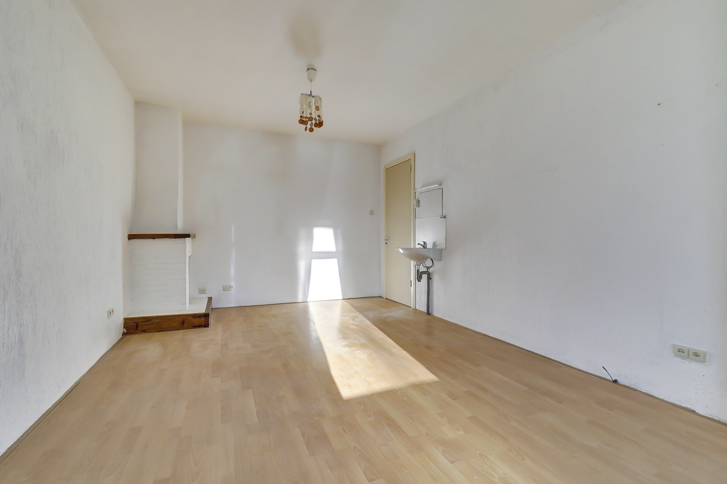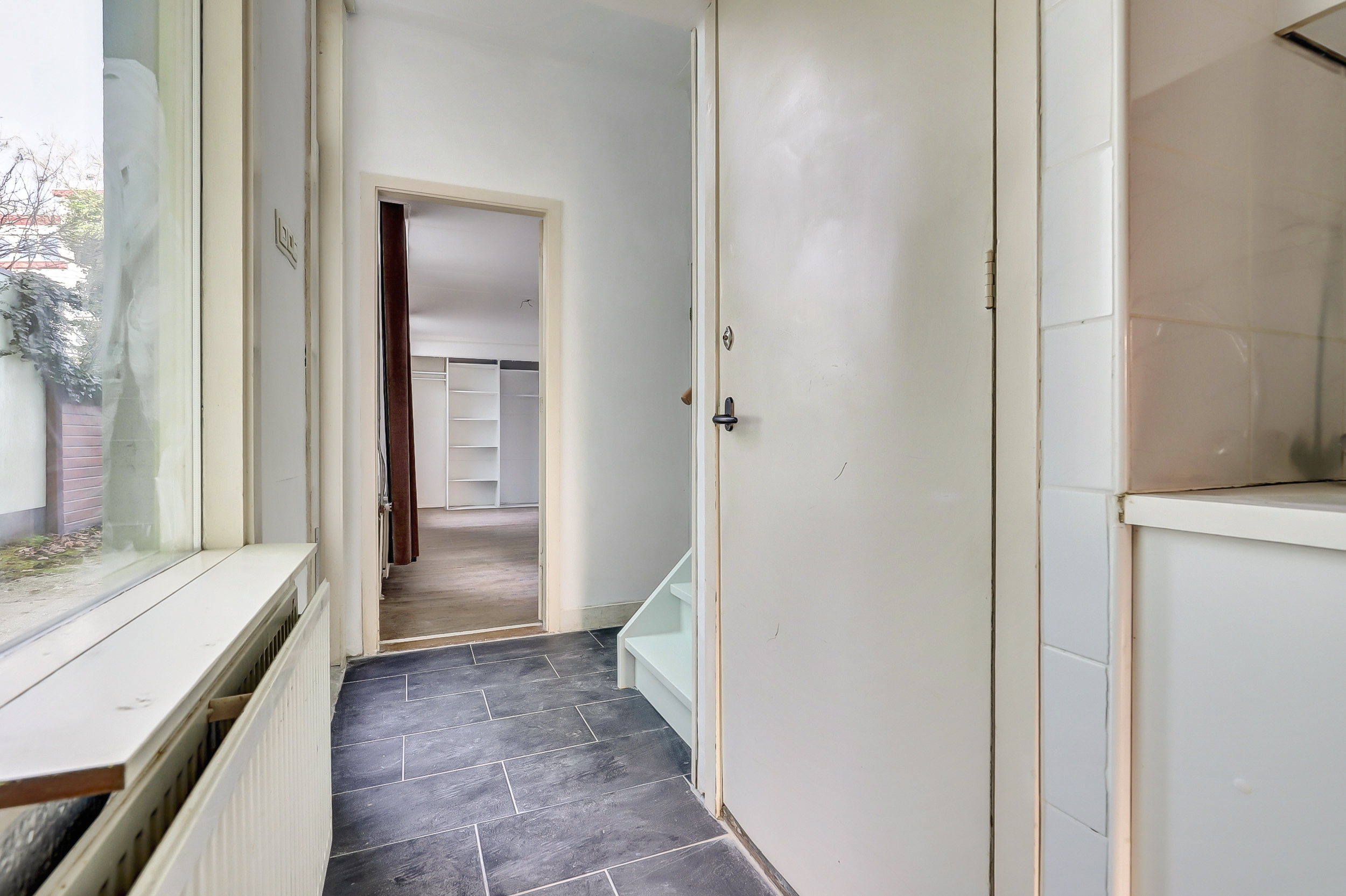 Je komt binnen in de hal die direct toegang geeft tot het toilet met fontein, de meterkast en de woonkamer. Aan de voorzijde opent de woonkamer zich met een karakteristieke erker, hoge raampartijen met praktische rolluiken. Hier valt het daglicht royaal binnen en ervaar je direct de sfeer van het bouwjaar.