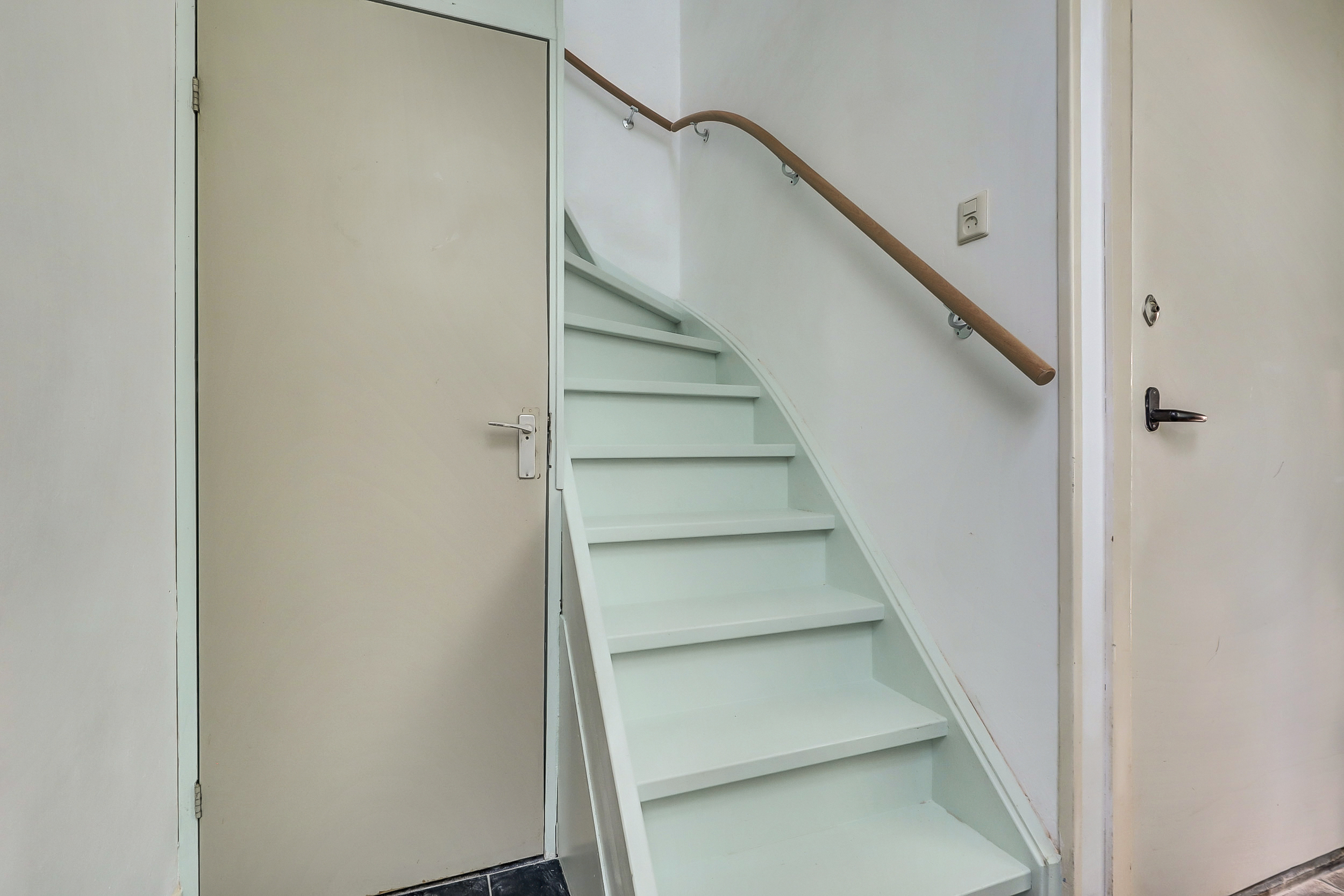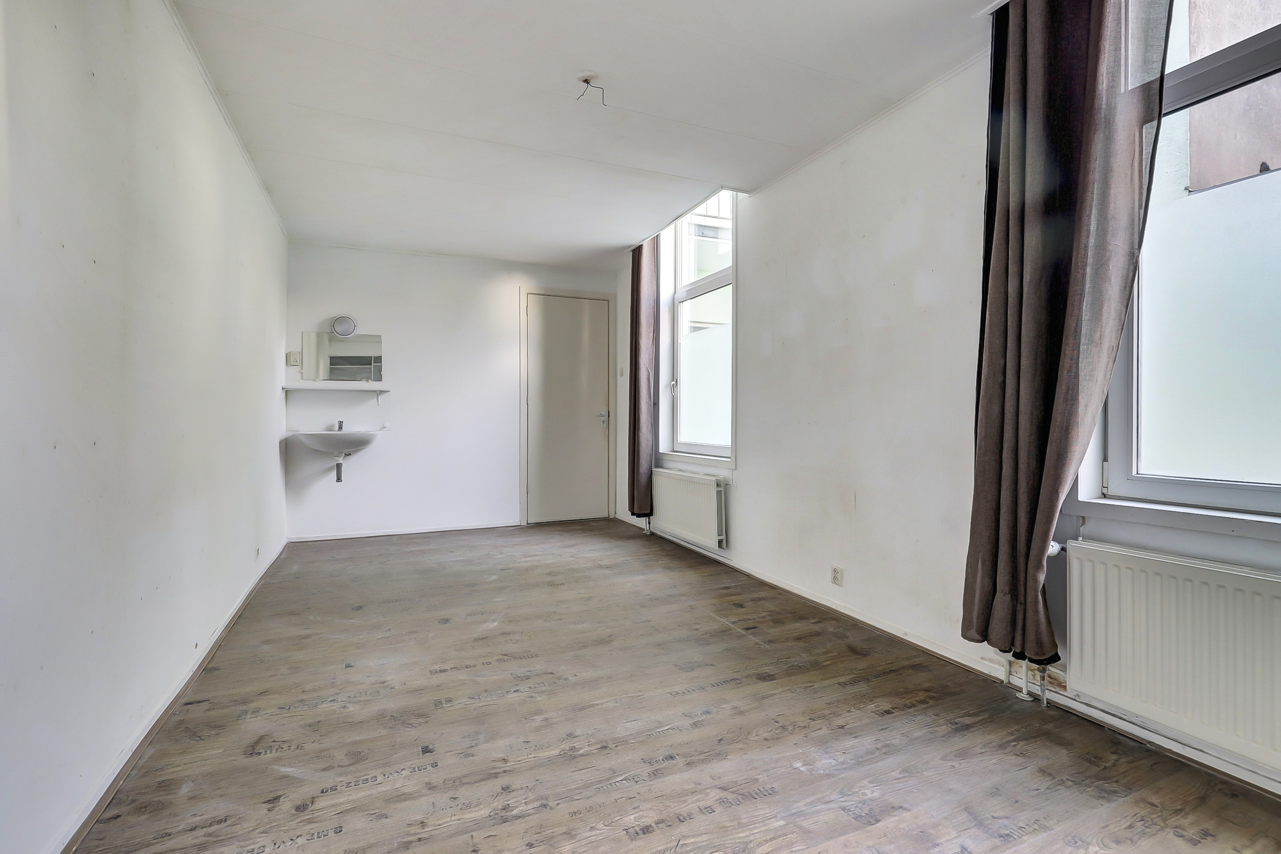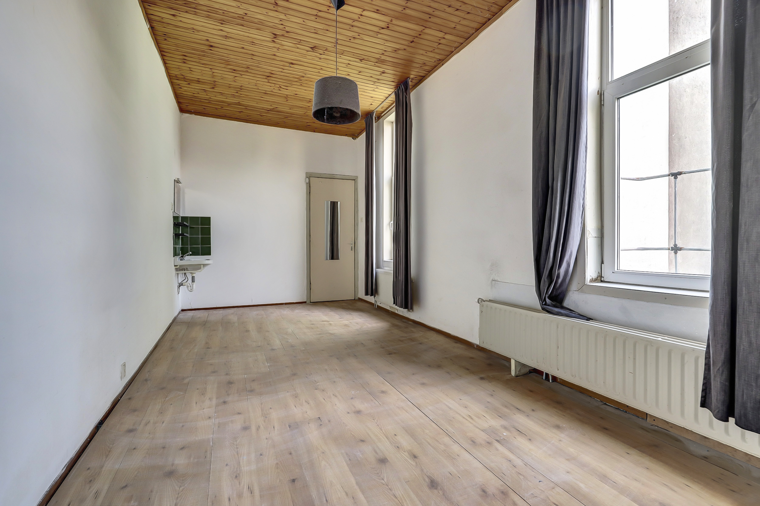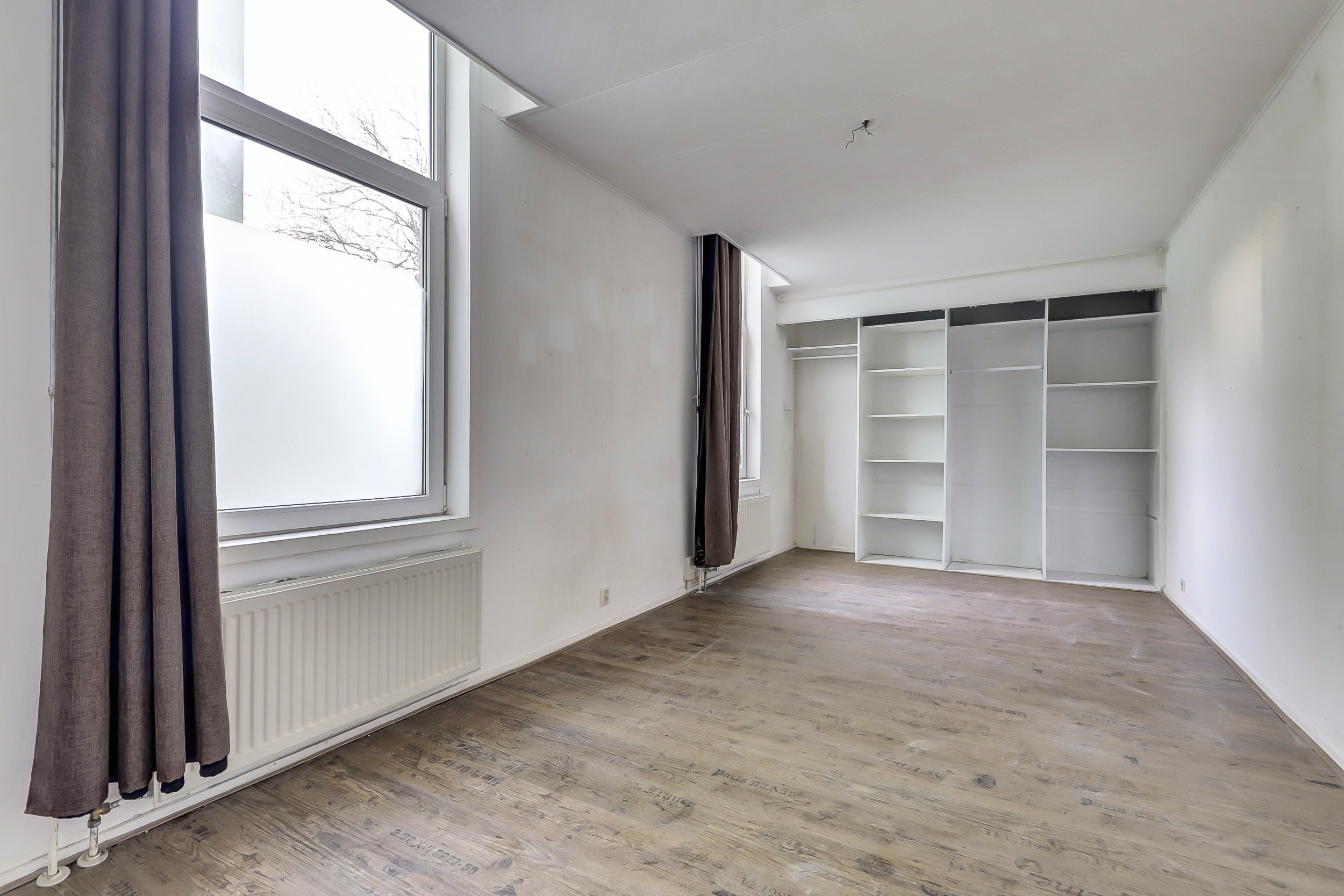 Je komt binnen in de hal die direct toegang geeft tot het toilet met fontein, de meterkast en de woonkamer. Aan de voorzijde opent de woonkamer zich met een karakteristieke erker, hoge raampartijen met praktische rolluiken. Hier valt het daglicht royaal binnen en ervaar je direct de sfeer van het bouwjaar.