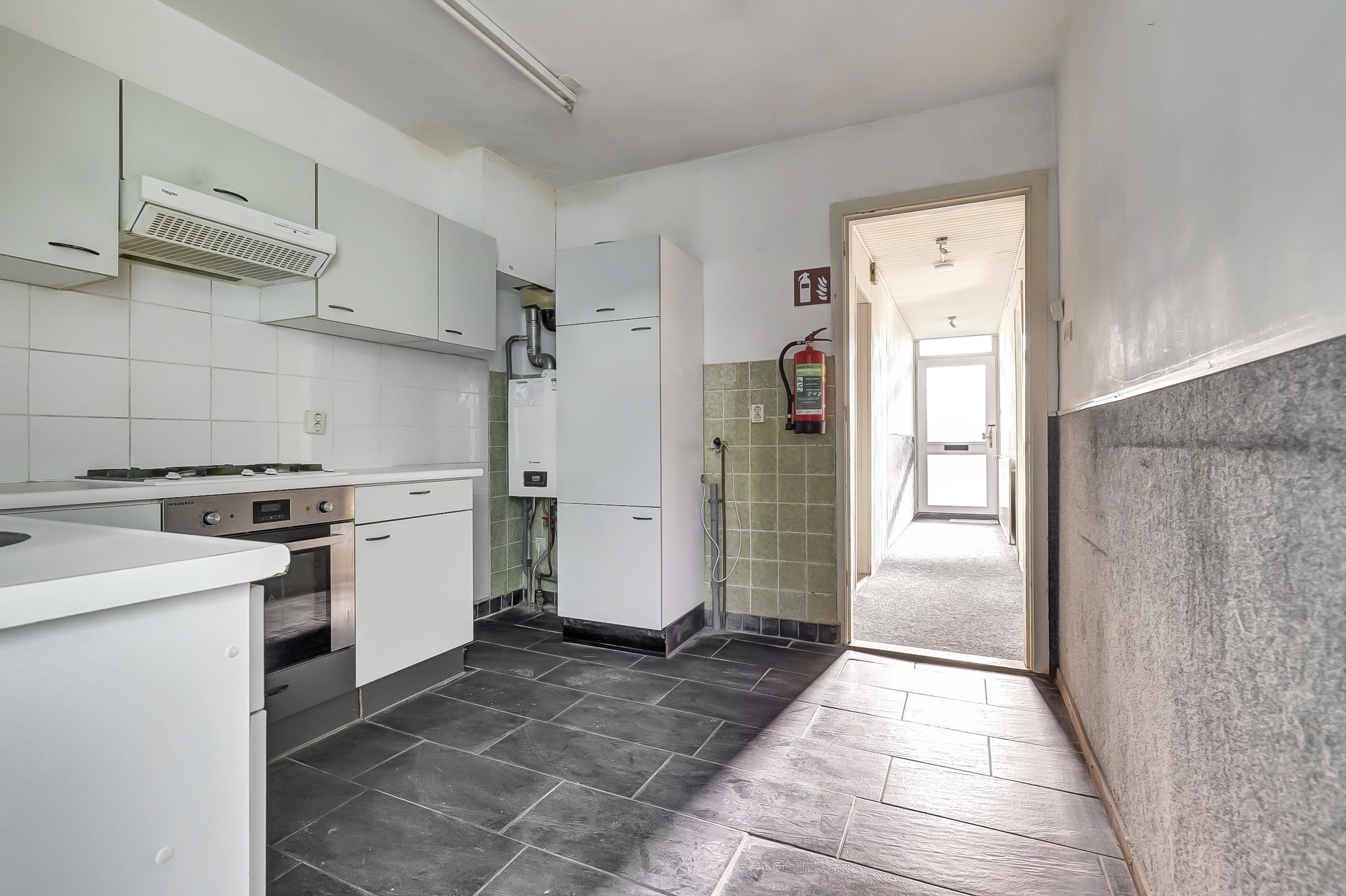 De L-vormige keuken is praktisch ingericht met een 4-pits gasfornuis, koelkast en spoelbak. Hier bevindt zich ook de cv-installatie (2022). Aangrenzend aan de keuken bevindt zich de doucheruimte.