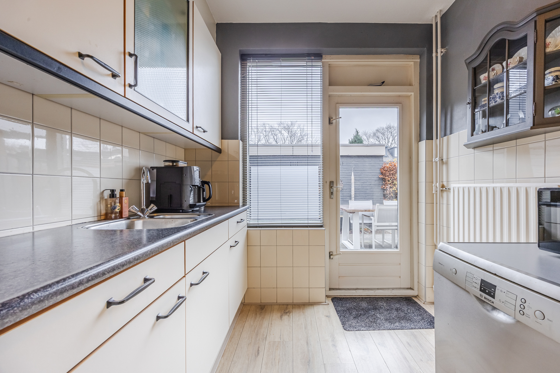 De woonkamer is lekker licht en heeft een mooie laminaatvloer en deur naar de achtertuin. De dichte keuken heeft een 5-pits gasfornuis, afzuigkap, een vaatwasser en toegang tot de achtertuin. Nette laminaatvloer op deze verdieping.