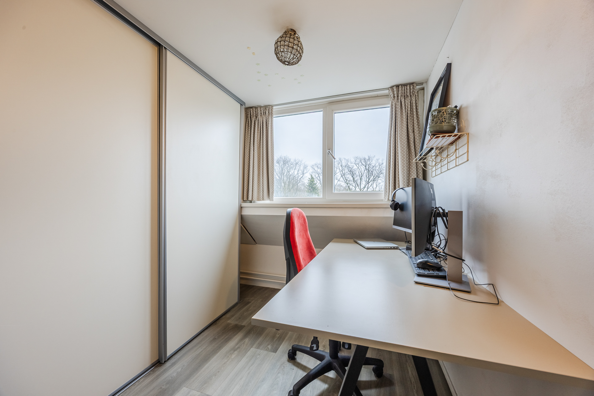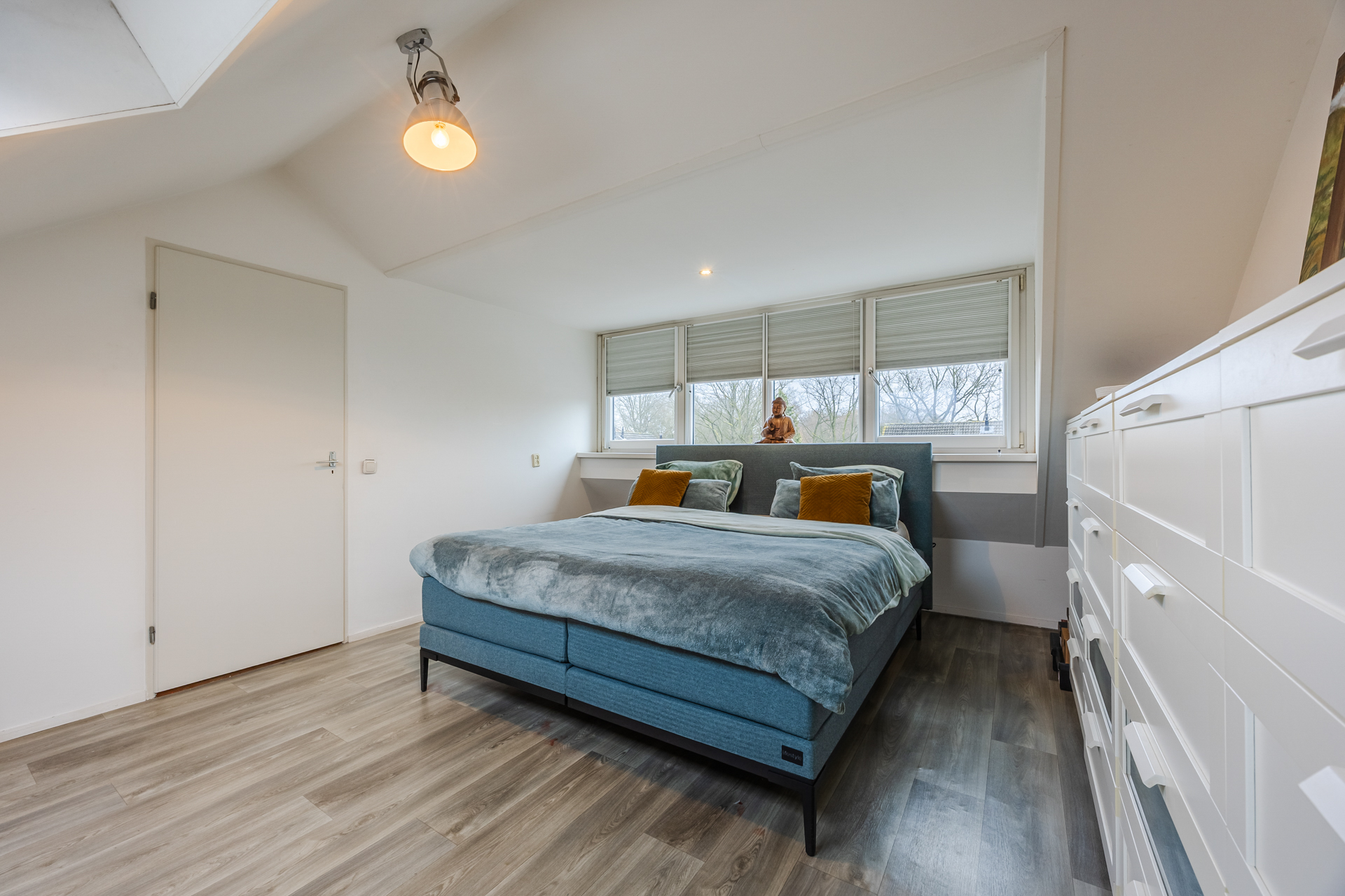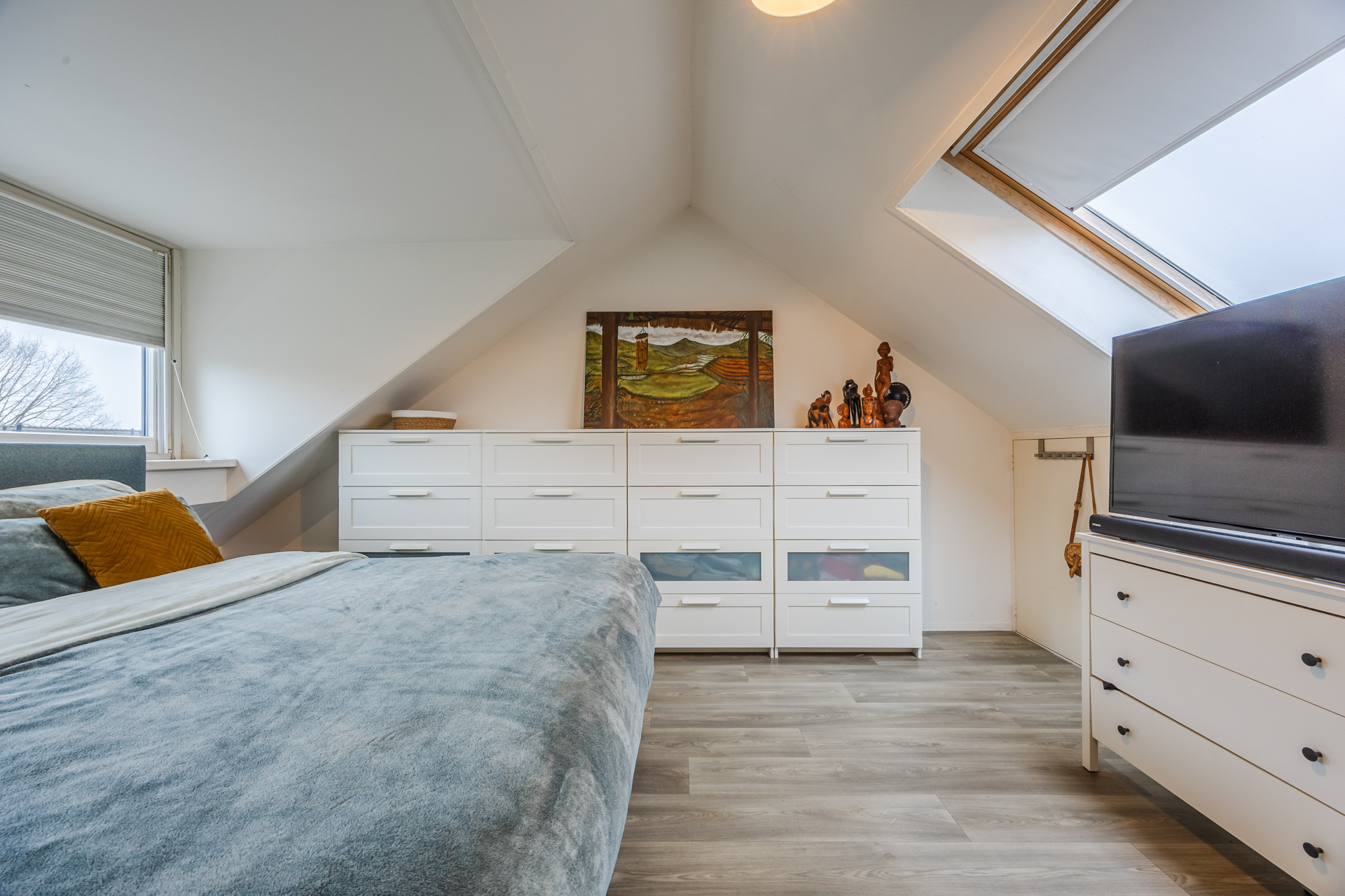 Ruime vierde slaapkamer met grote dakkapel (2012), vijfde slaapkamer met schuifwandkast en voorzolder met C.V.-ketel (Intergas 2012) en witgoedaansluitingen.