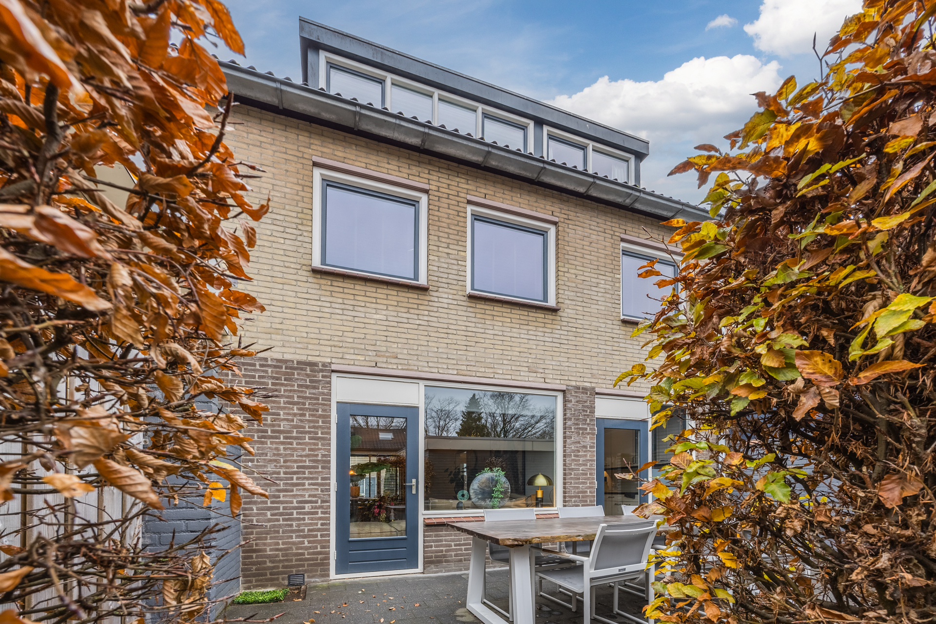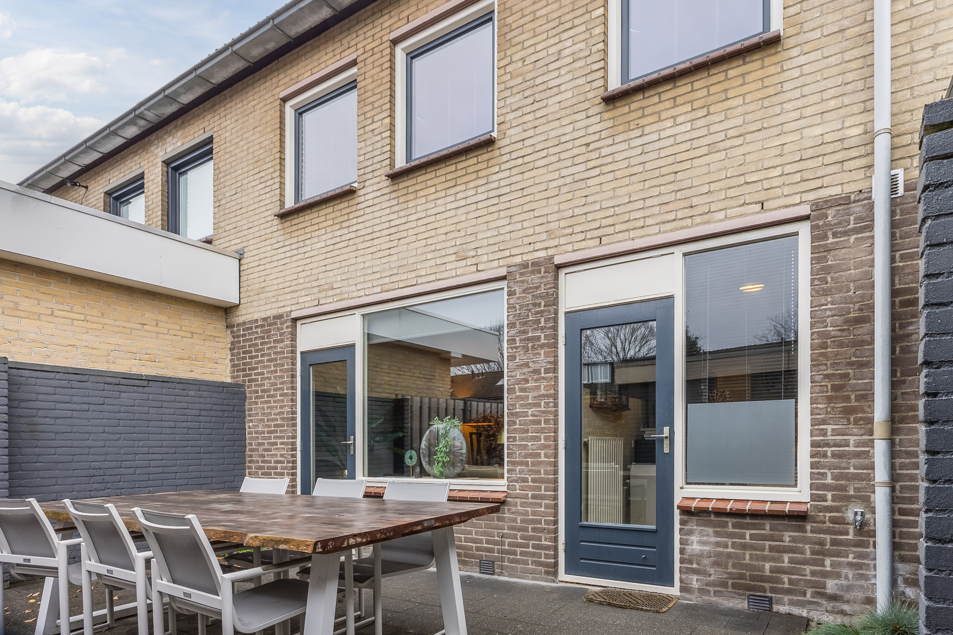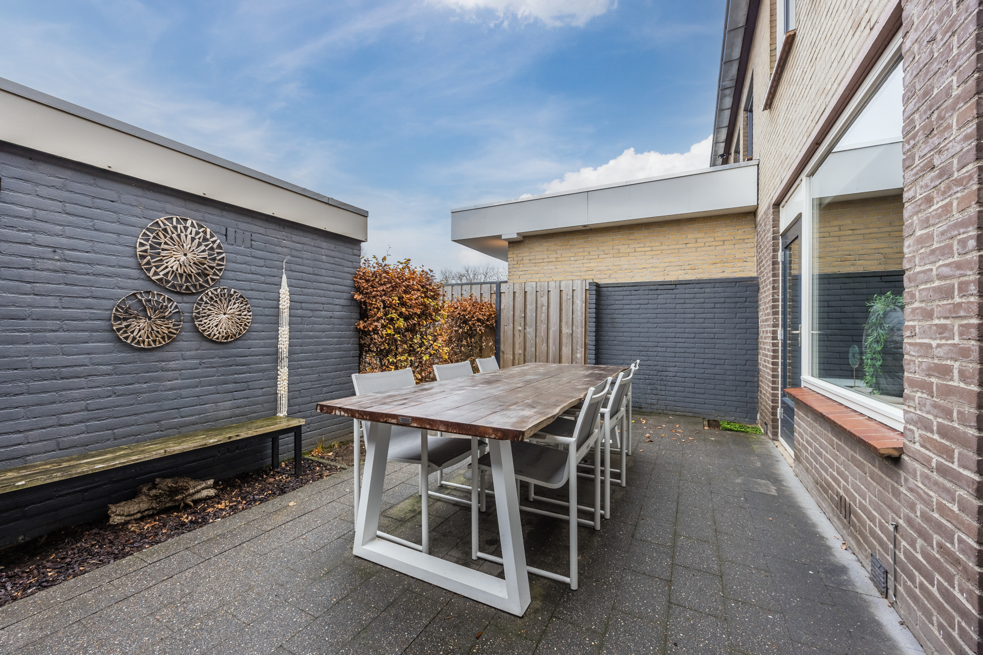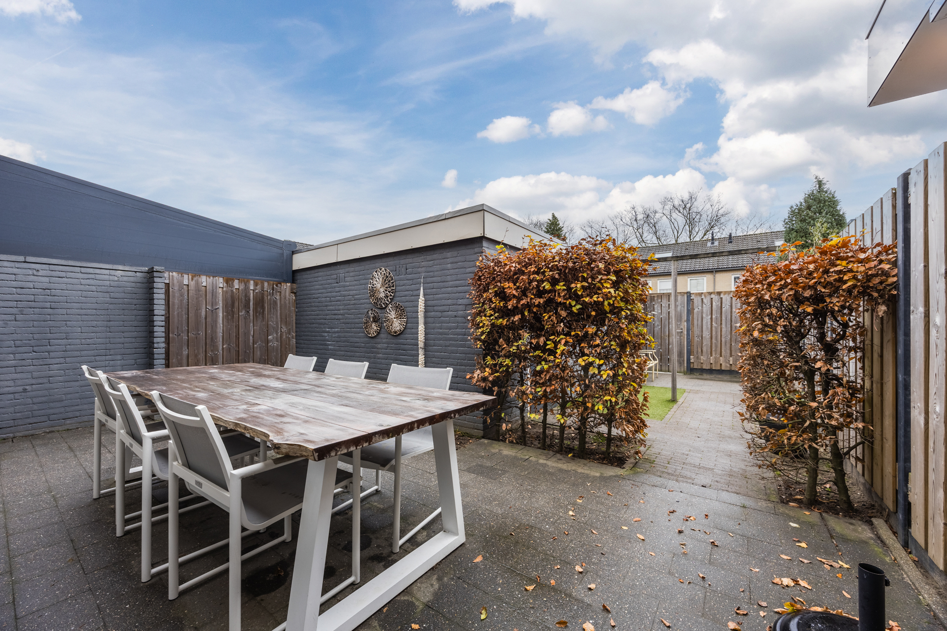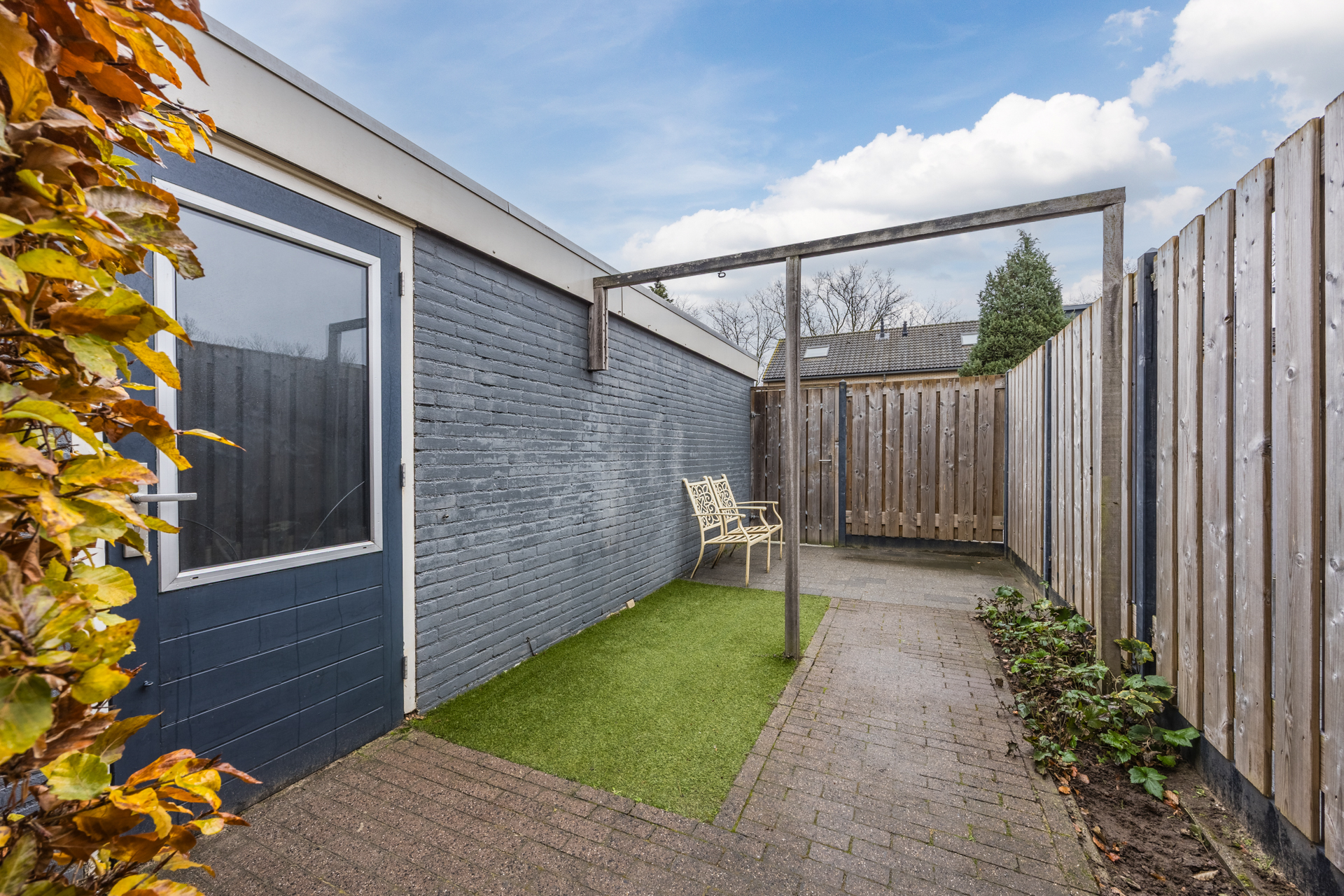 De nette achtertuin met achterom ligt op het oosten en krijgt door de L-vorm ook ’s middags nog zon.