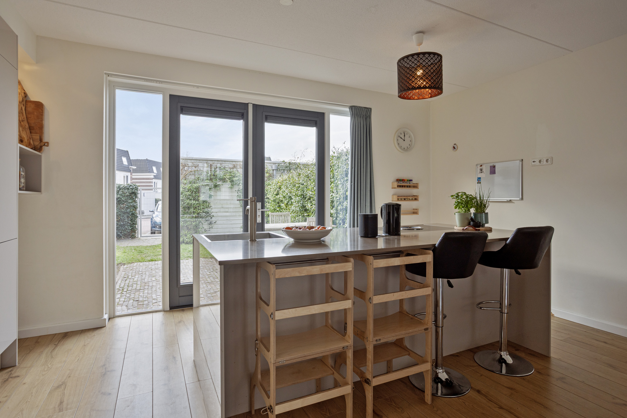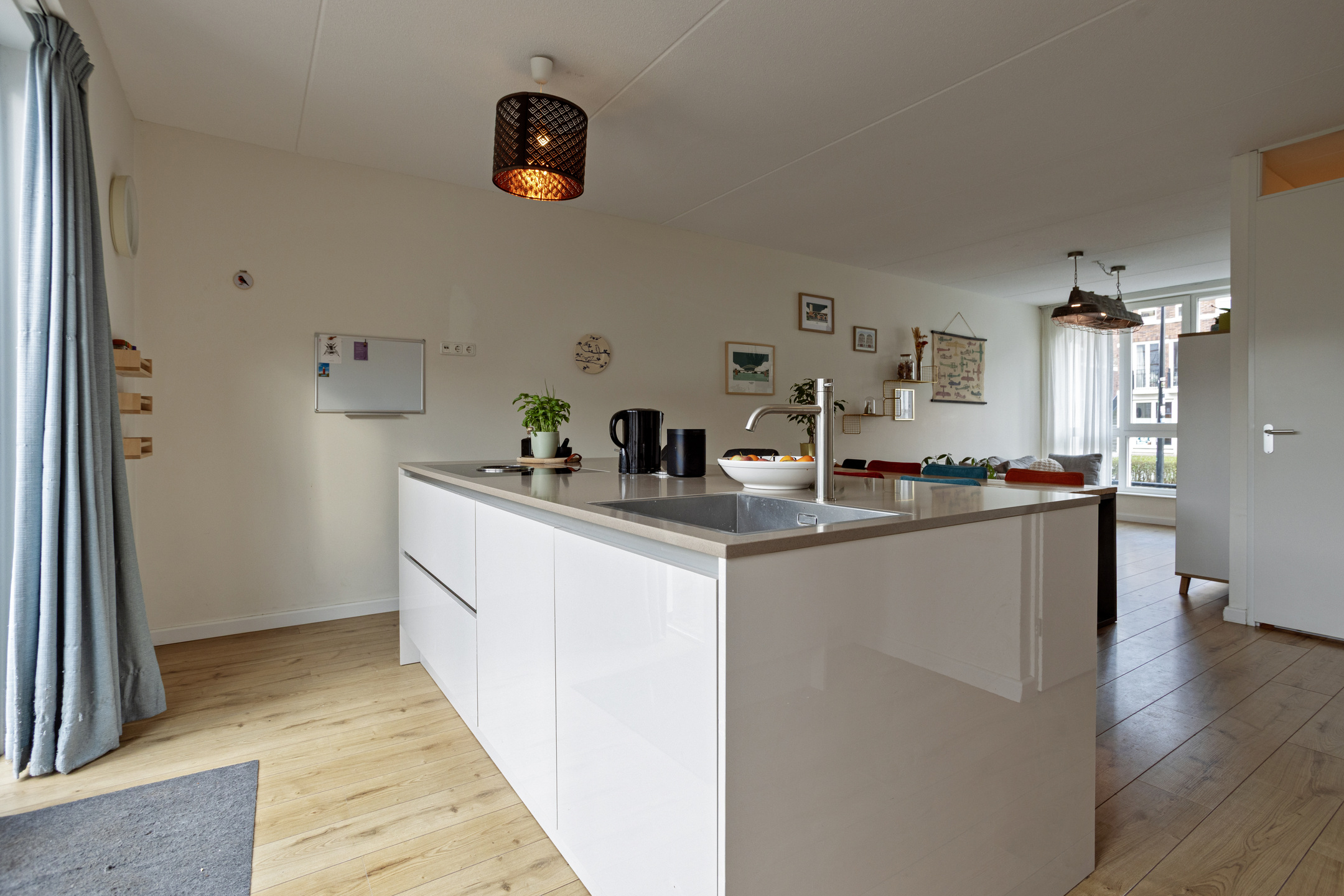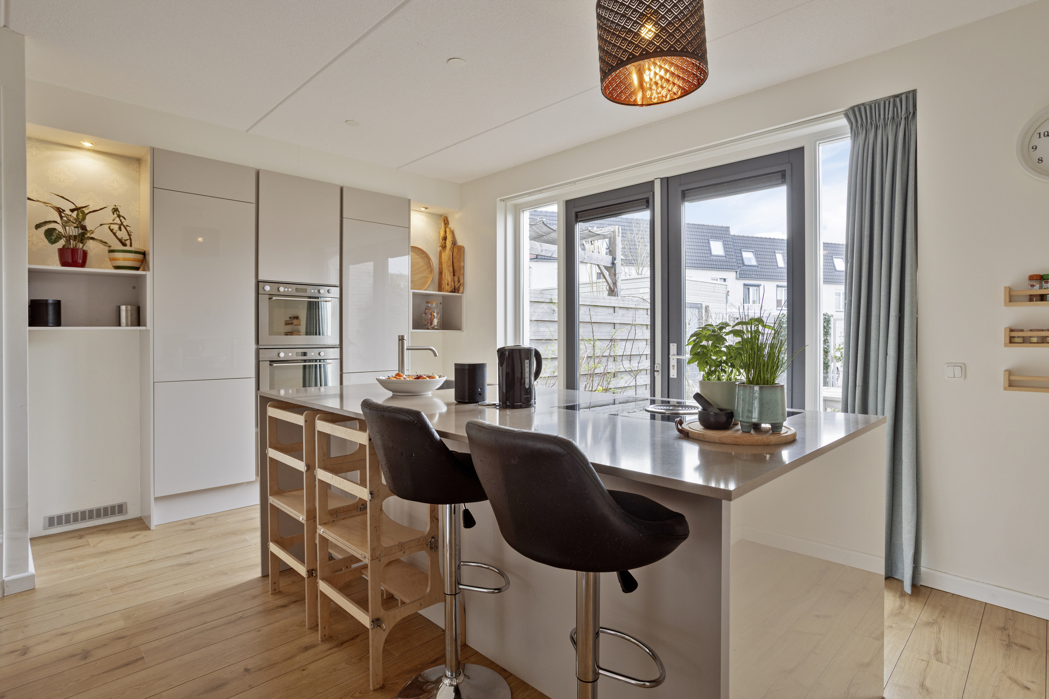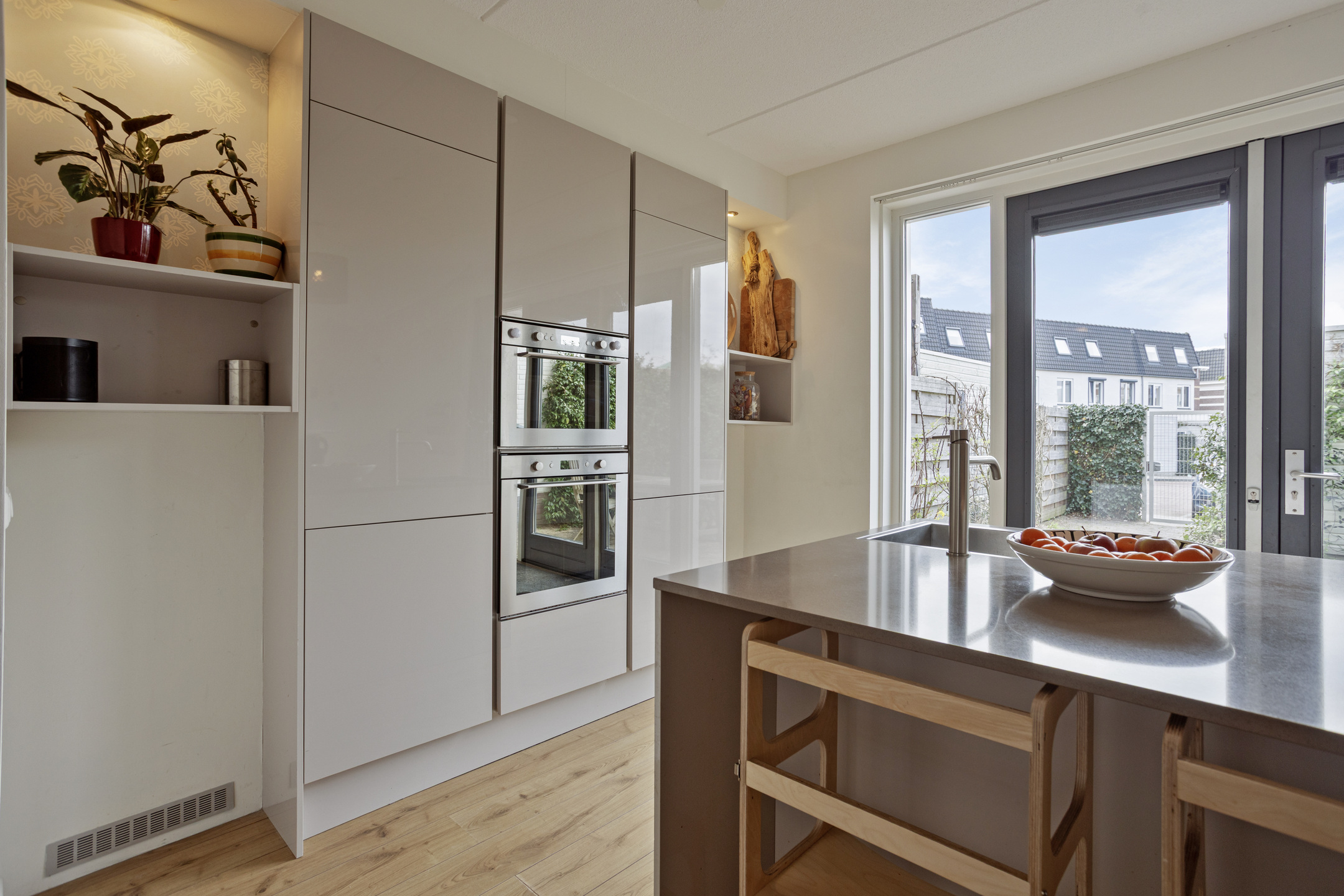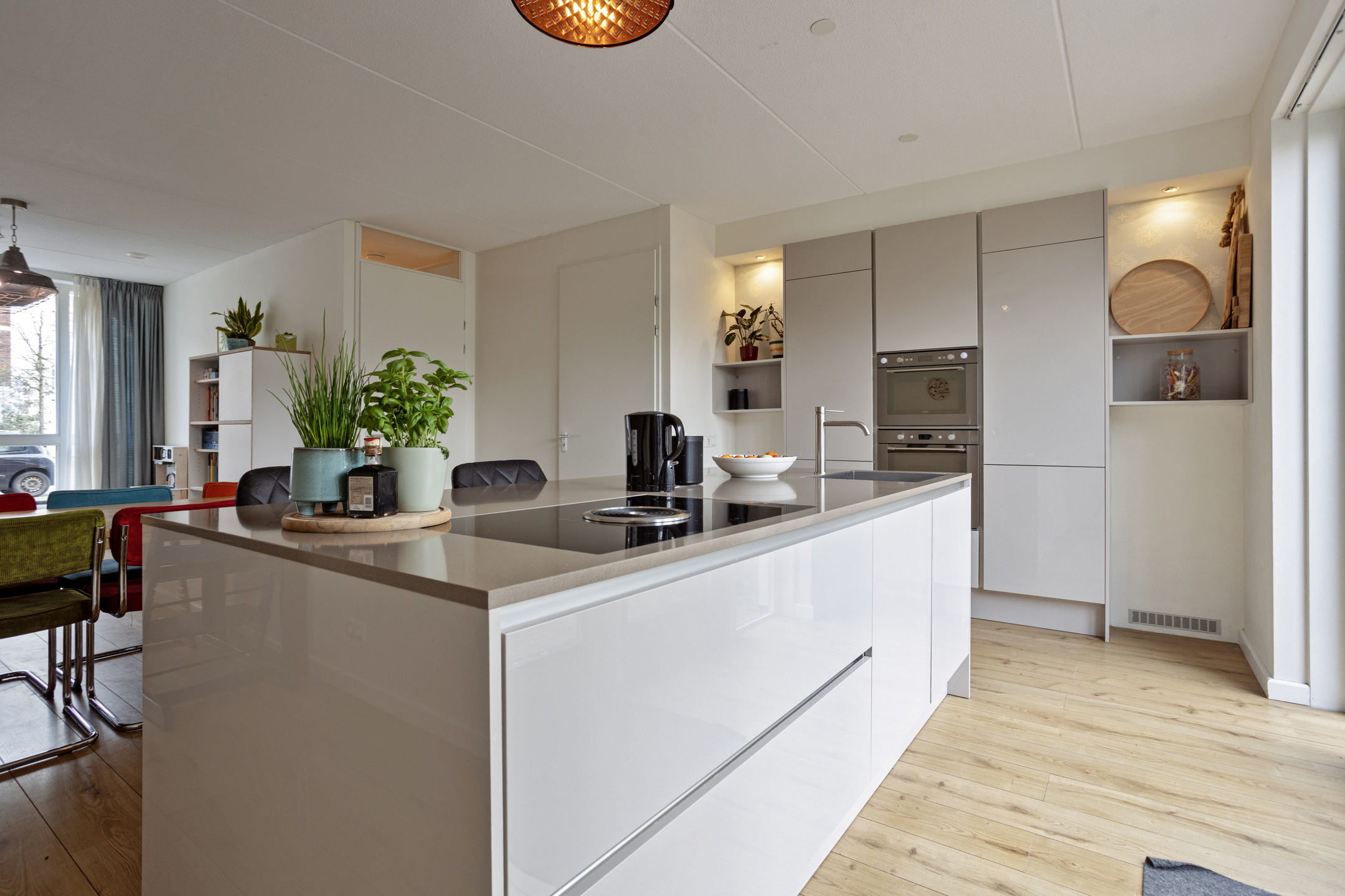 entree, hal, toilet, meterkast en moderne woonkeuken met inbouwkeuken met inbouwapparatuur, eiland en composiet grijsblad. Apparatuur: vaatwasser, oven, combi, inductie met bora, koelkast en vriezer