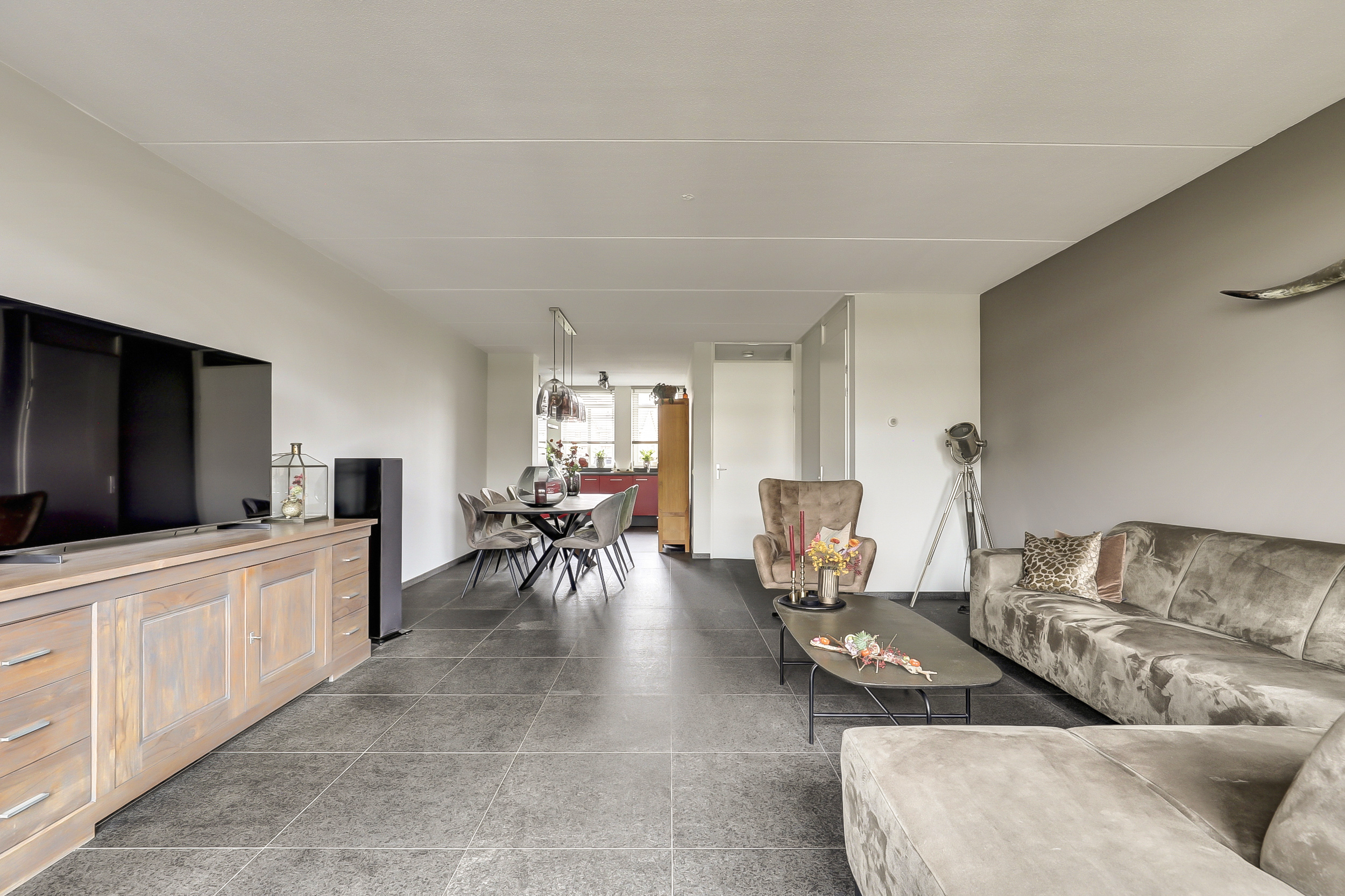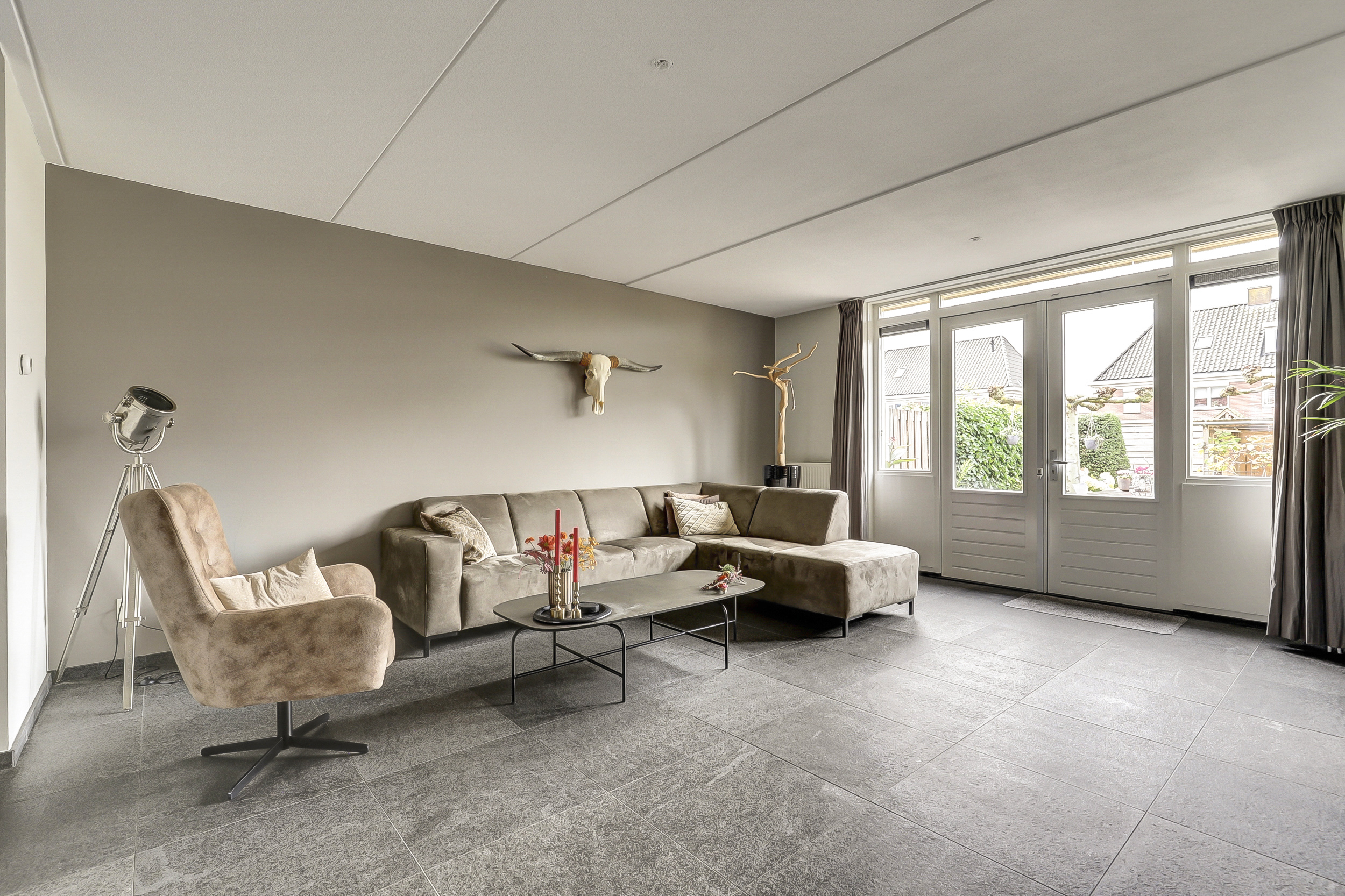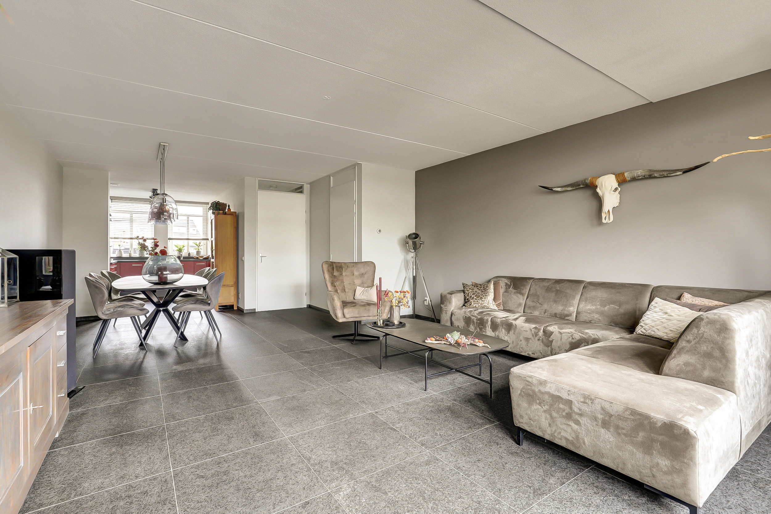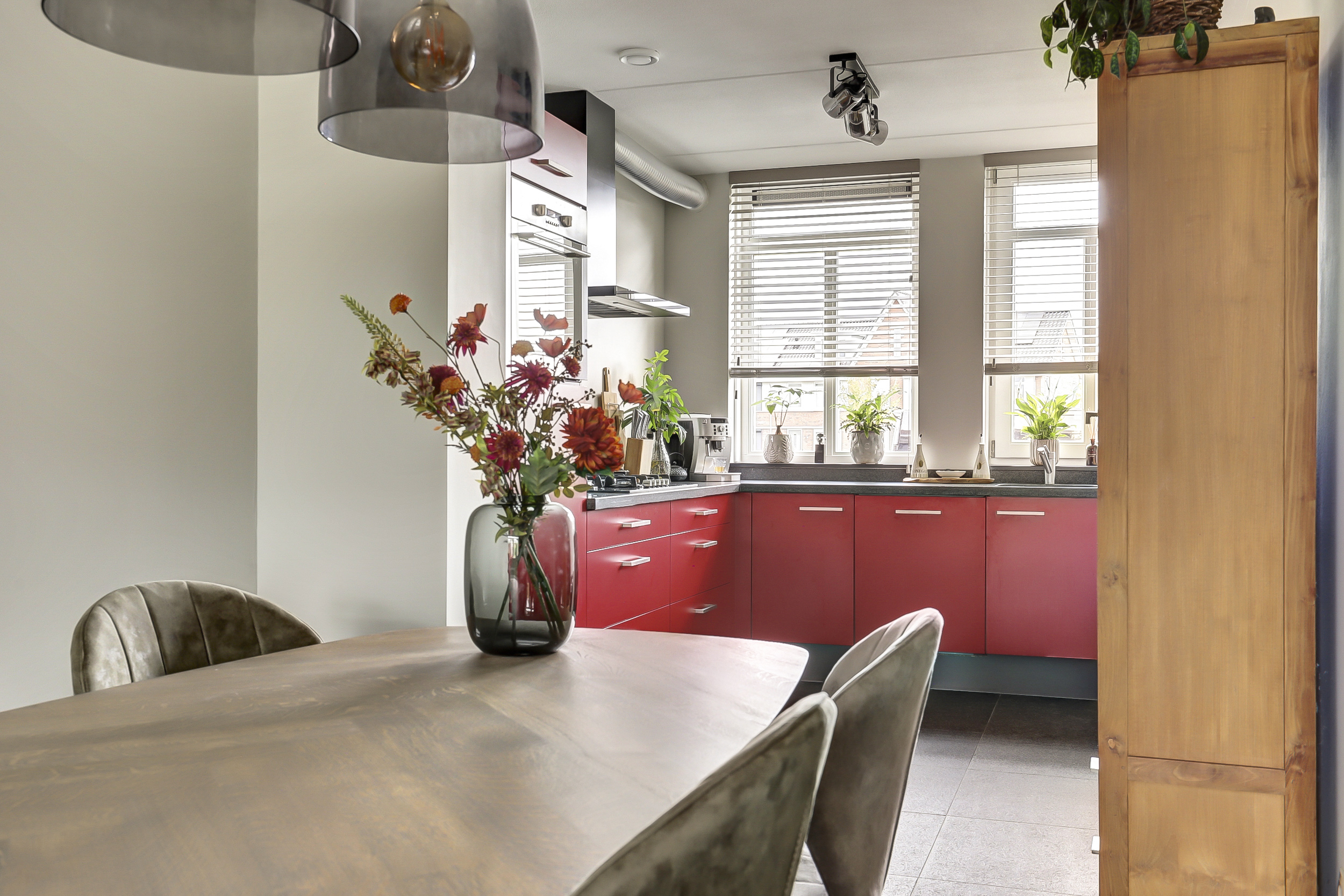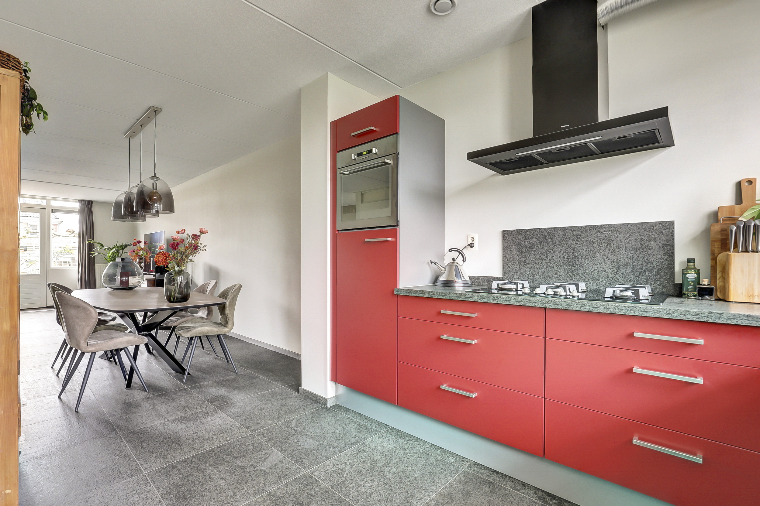 De woning is aan de achterzijde uitgebouwd, wat direct voelbaar is zodra je de woonkamer binnenkomt. De extra diepte zorgt voor een royale leefruimte, met openslaande deuren naar het zonneterras. De basaltvloer op de begane grond geeft het geheel een stoere, moderne uitstraling. Aan de voorzijde ligt de open keuken, met zicht op de singel en het wandelpad. De keuken is modern uitgevoerd en voorzien van een 5-pits gasfornuis met afzuigkap (2023), oven, koelkast, vaatwasser (2023) en een natuurstenen werkblad.
