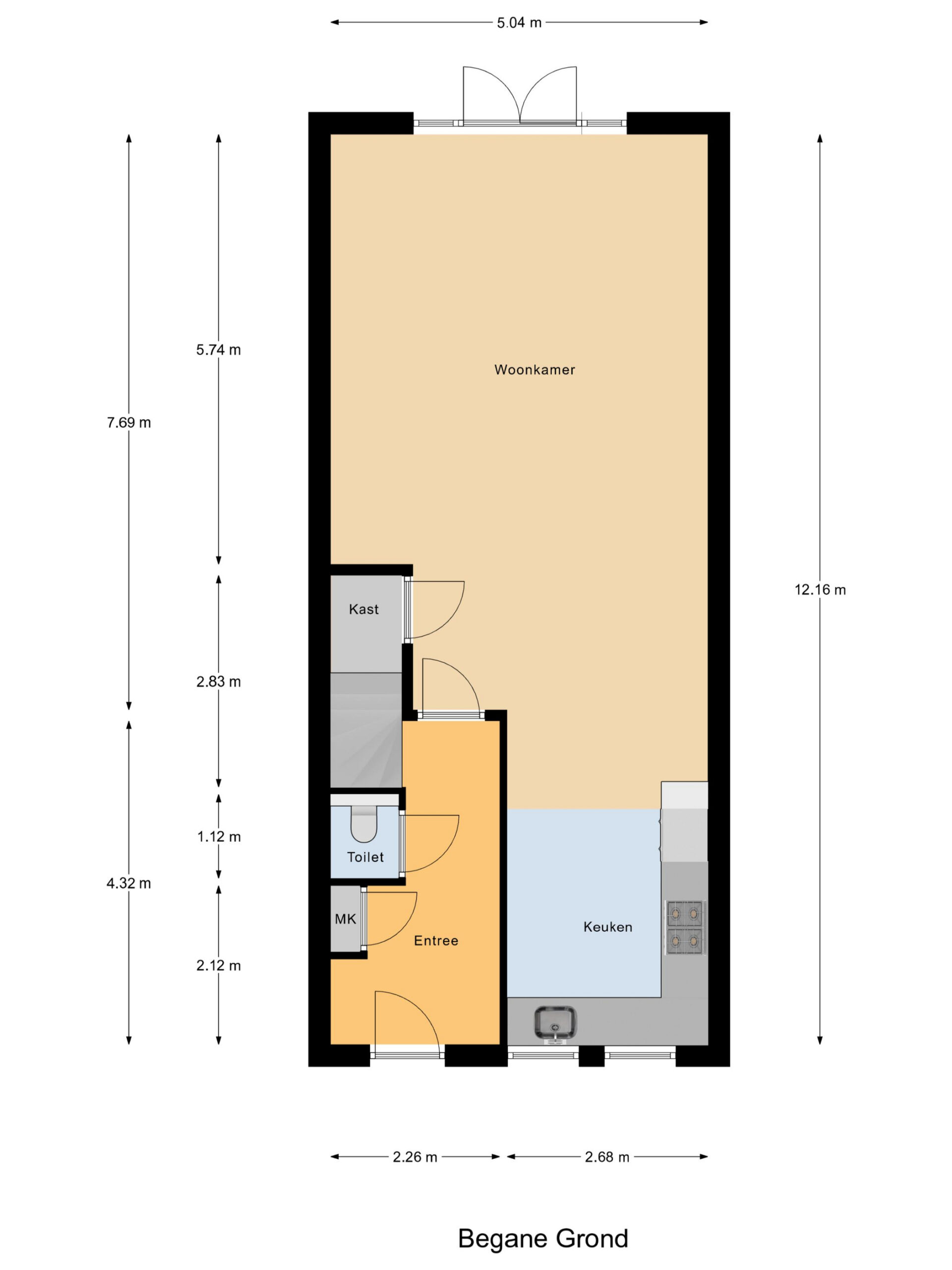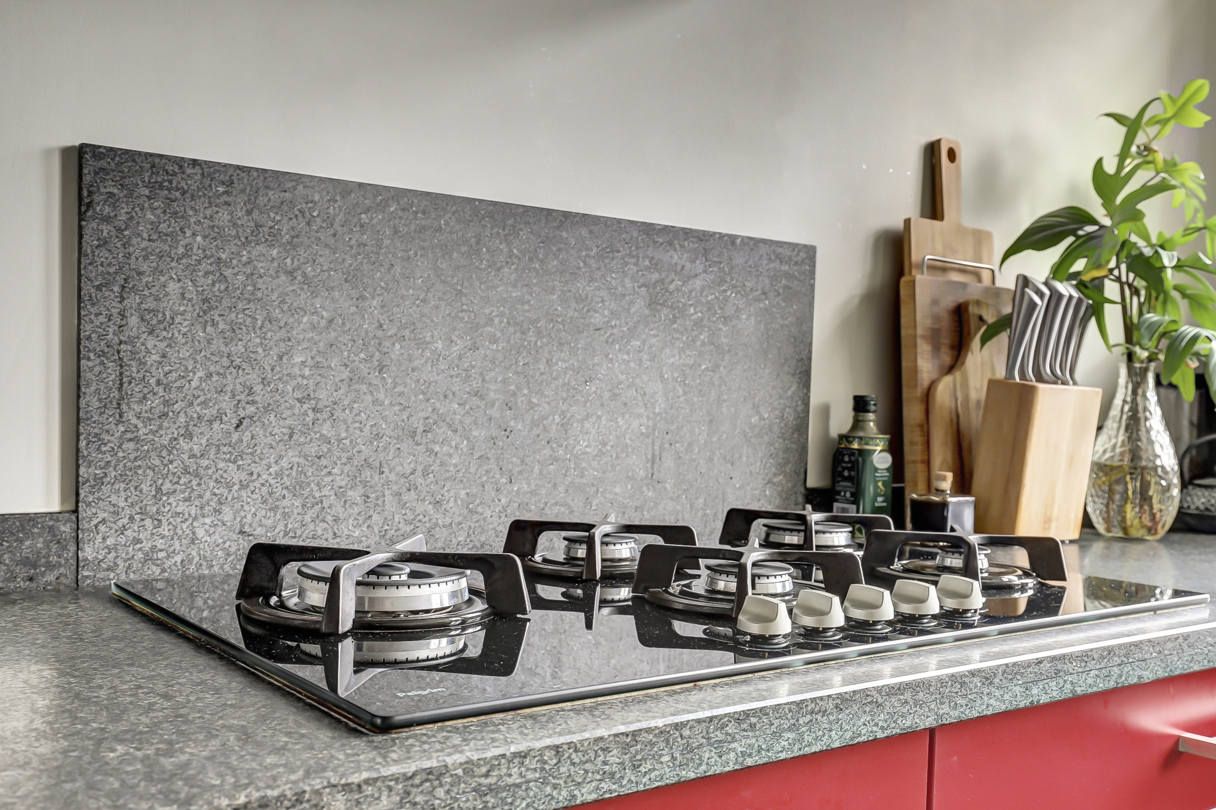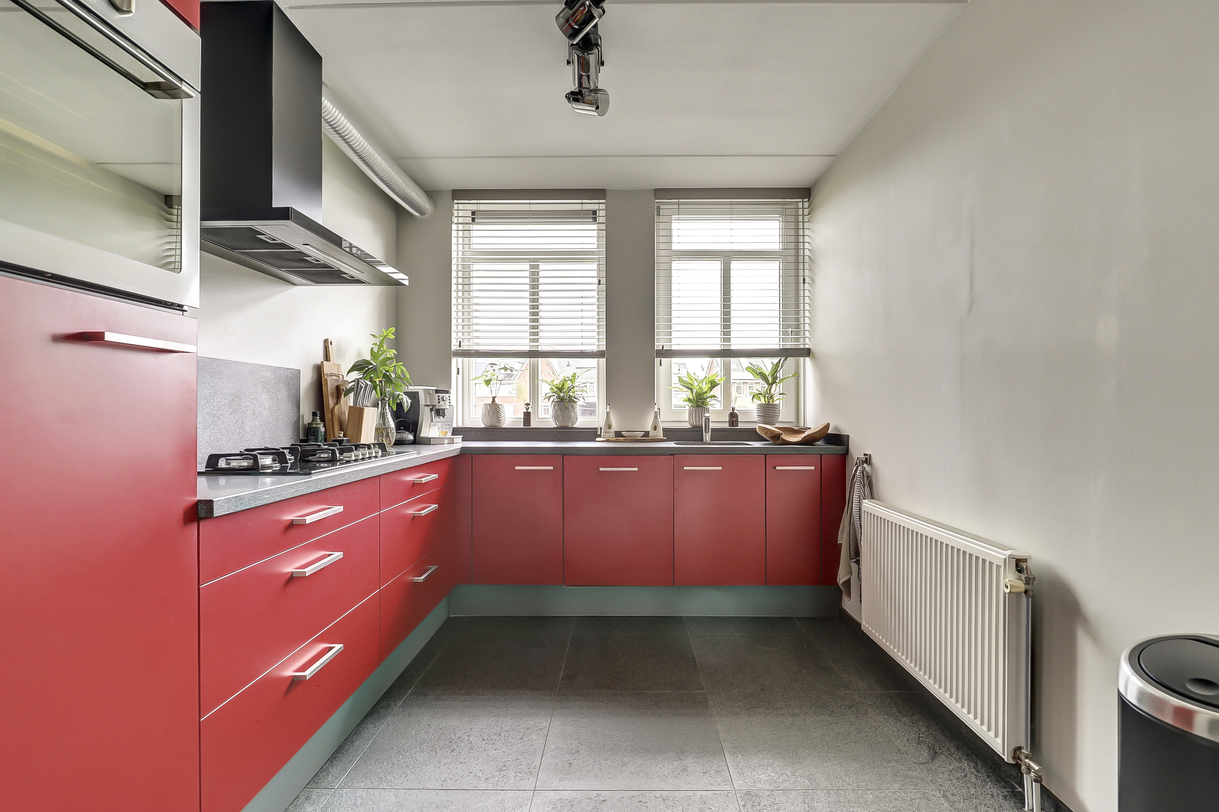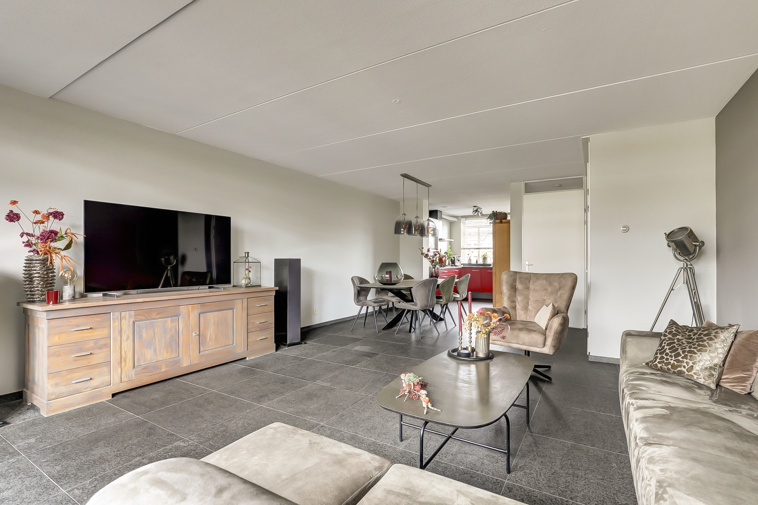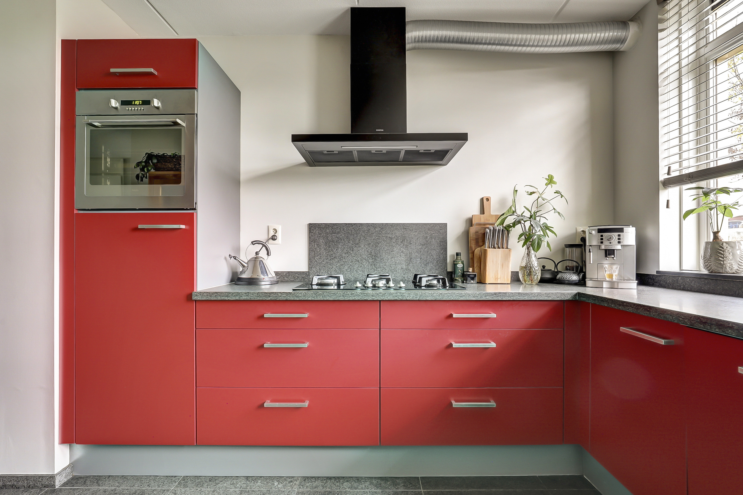 De woning is aan de achterzijde uitgebouwd, wat direct voelbaar is zodra je de woonkamer binnenkomt. De extra diepte zorgt voor een royale leefruimte, met openslaande deuren naar het zonneterras. De basaltvloer op de begane grond geeft het geheel een stoere, moderne uitstraling. Aan de voorzijde ligt de open keuken, met zicht op de singel en het wandelpad. De keuken is modern uitgevoerd en voorzien van een 5-pits gasfornuis met afzuigkap (2023), oven, koelkast, vaatwasser (2023) en een natuurstenen werkblad.