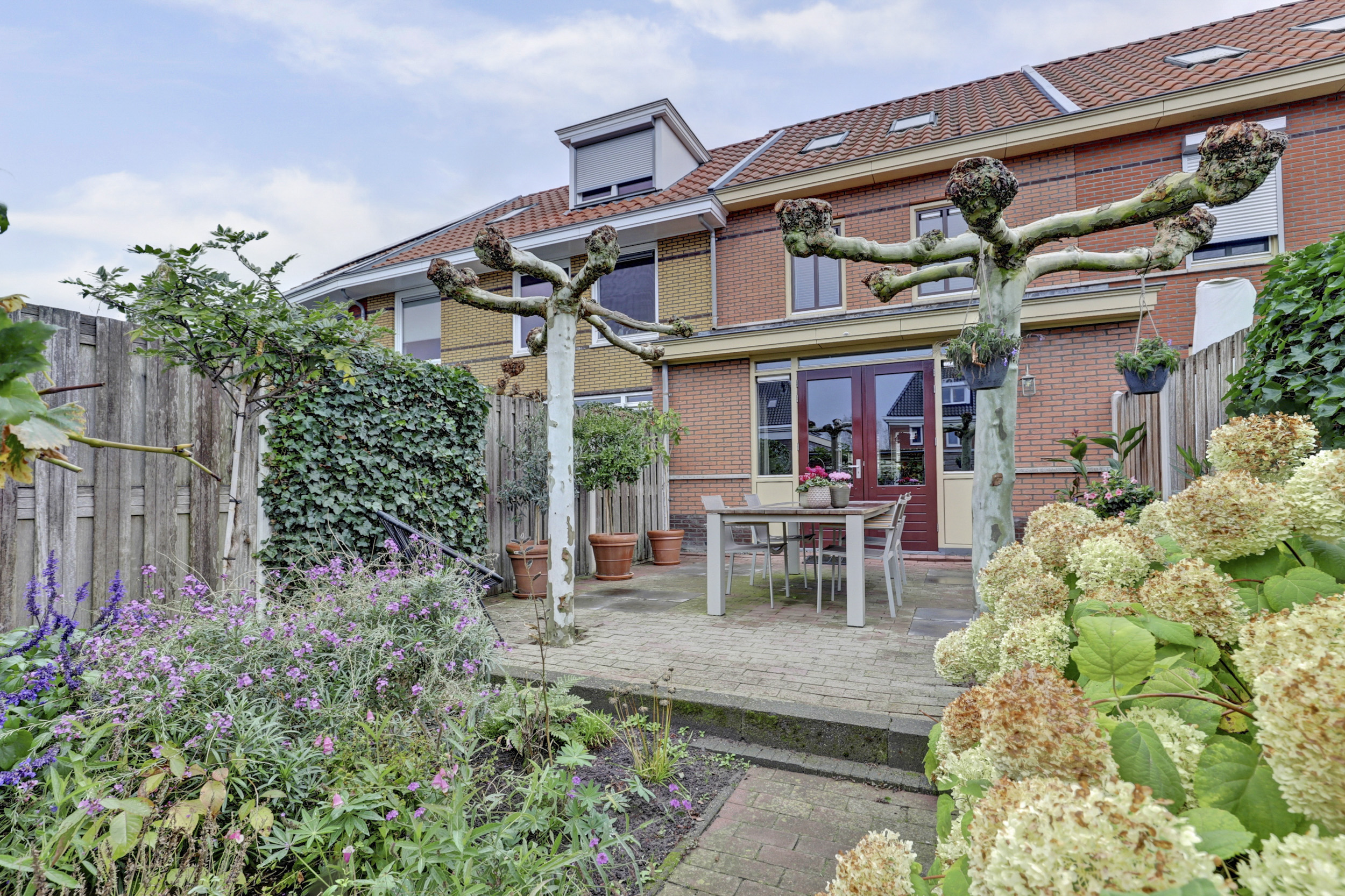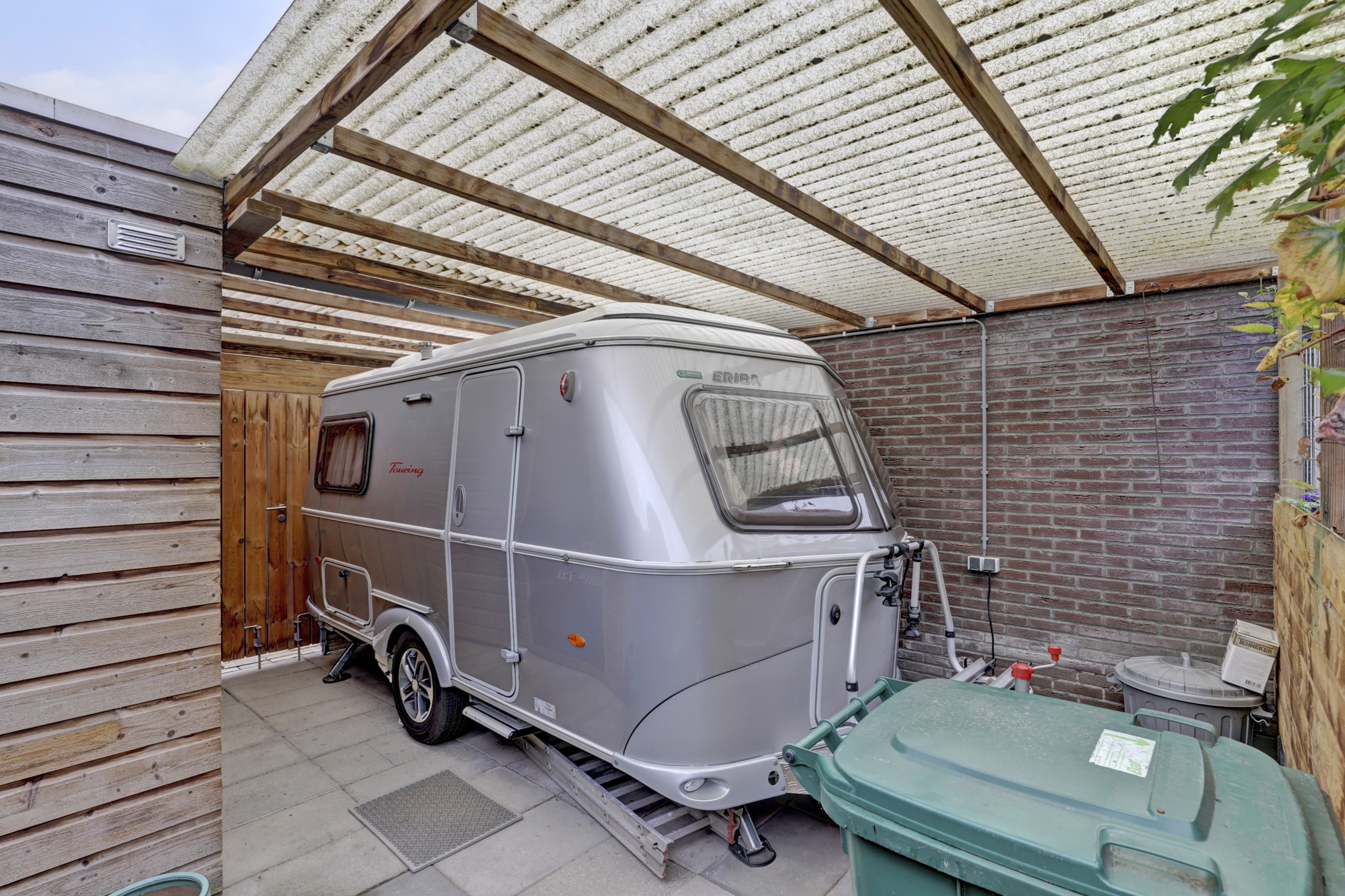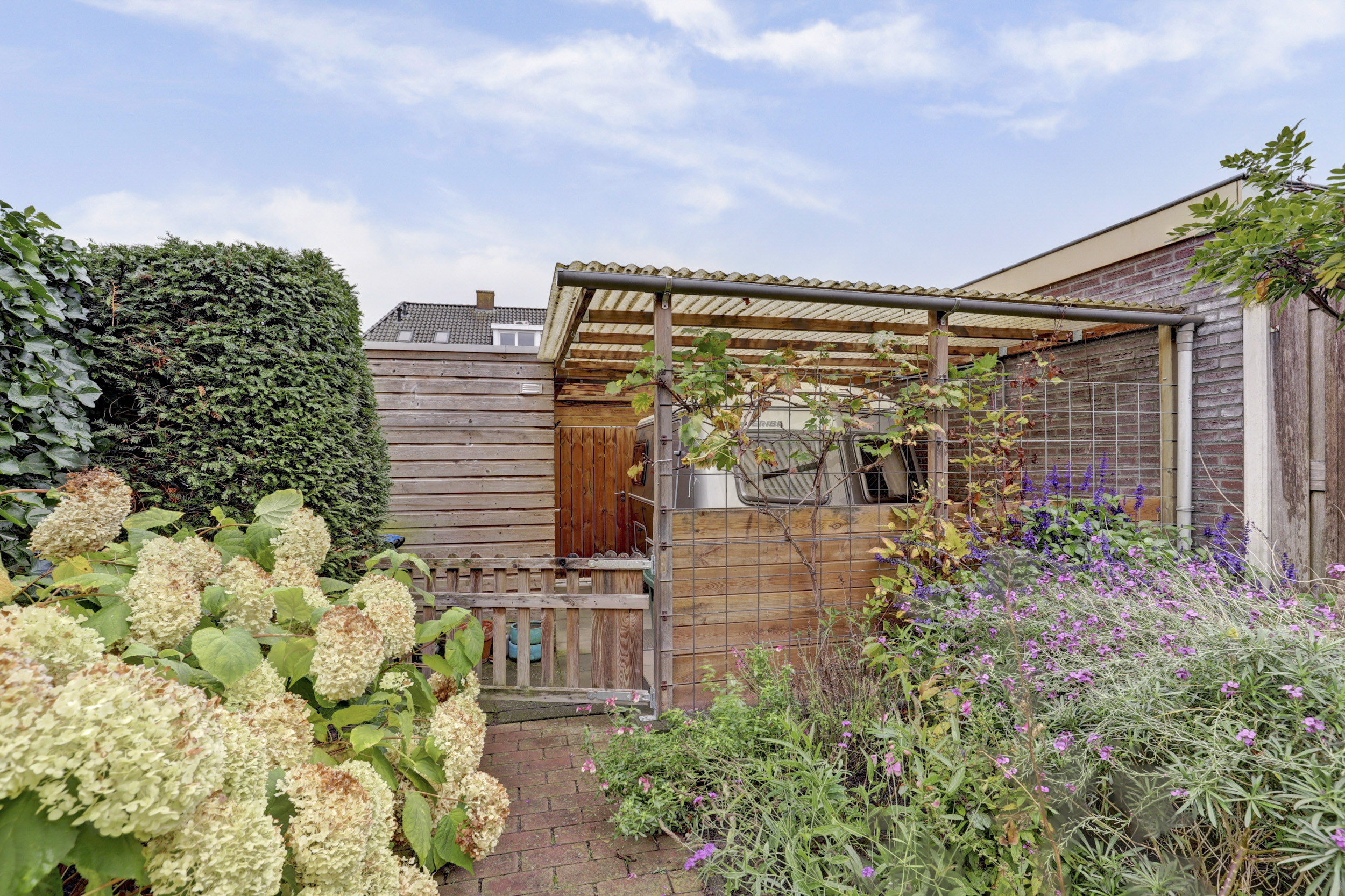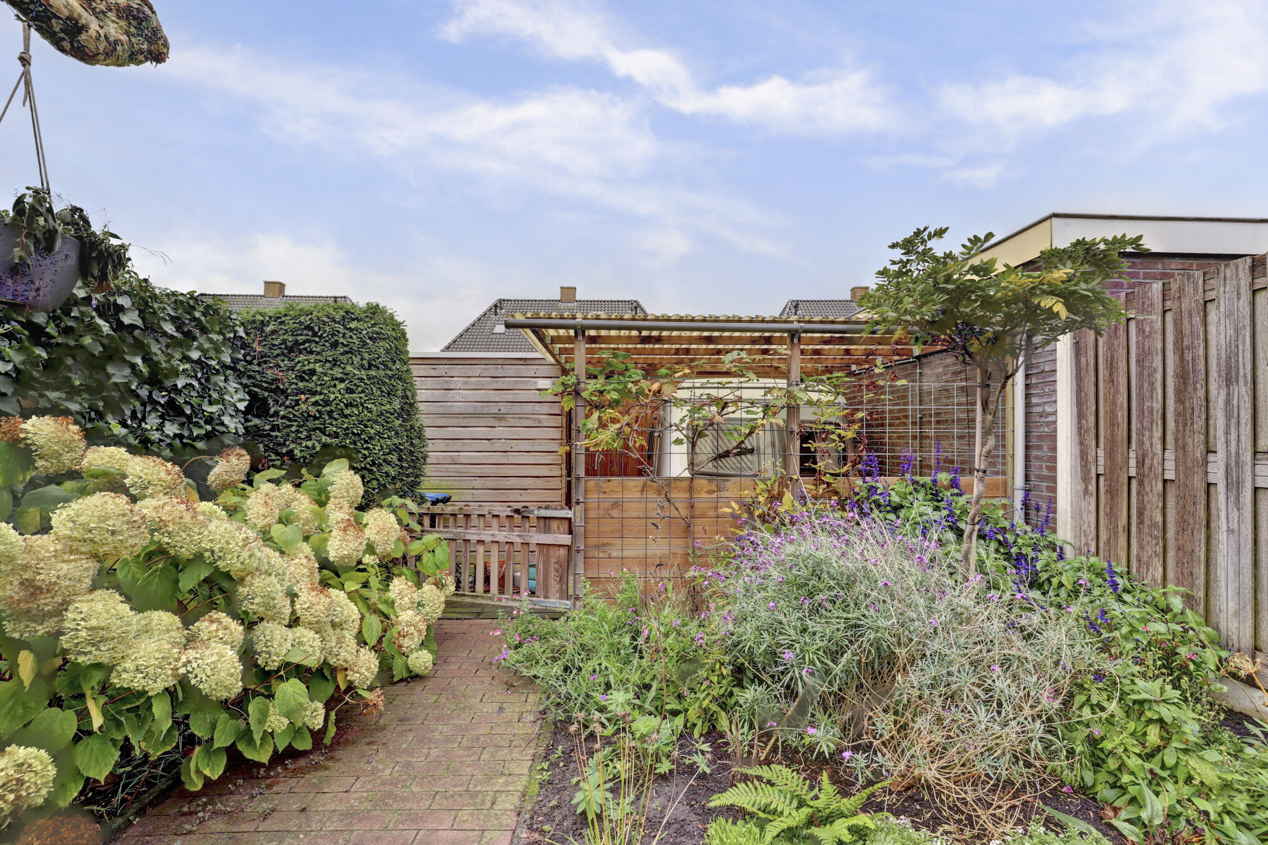 De achtertuin is verzorgd aangelegd met groot terras en bestrating, ideaal voor lange zomerdagen. Dankzij de ligging op het zuid/zuidwesten heb je hier volop middag- en avondzon. Achter in de tuin staat een berging, een carport en een poort naar de mandelige straat: een veilige, autoluwe speelruimte voor kinderen.