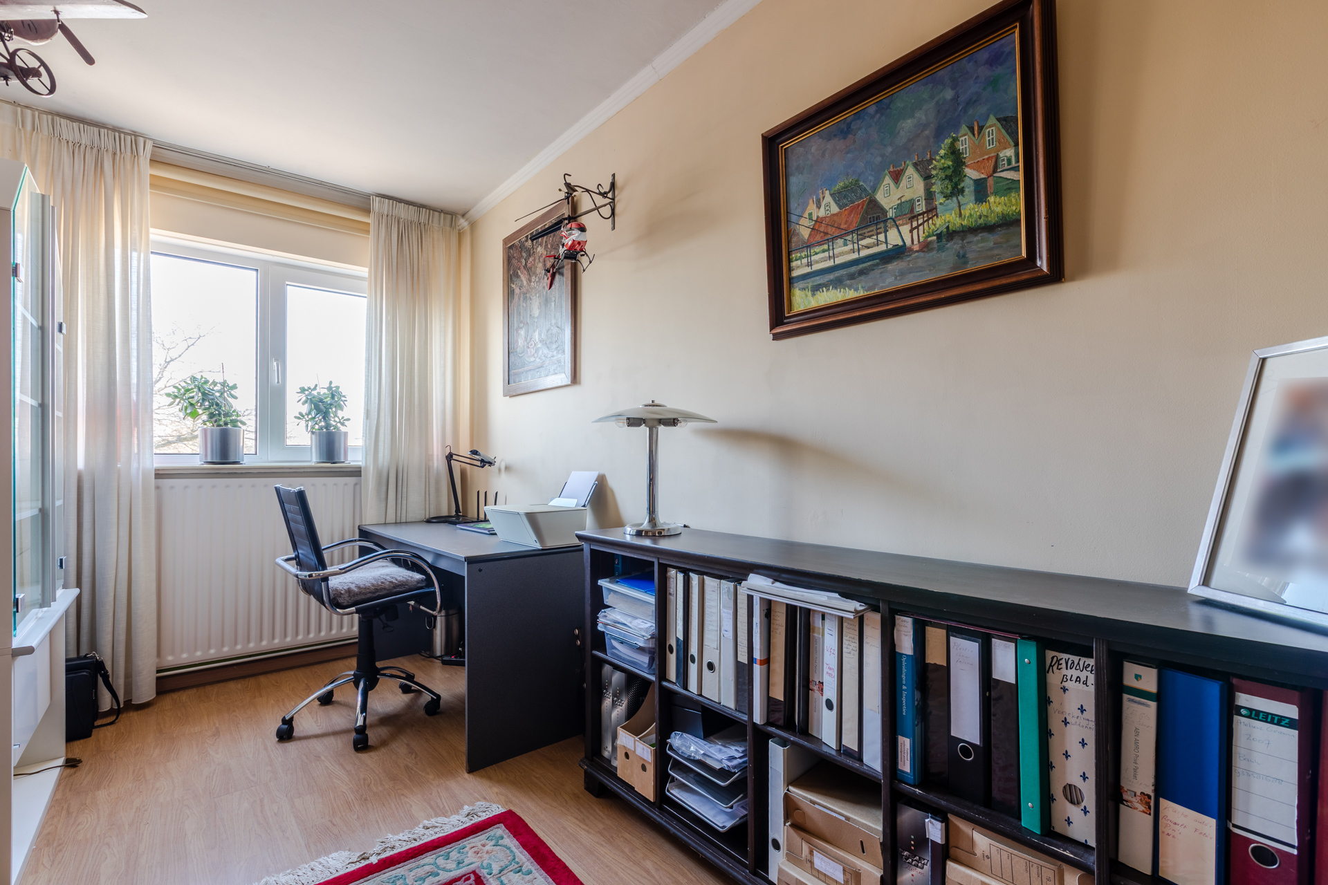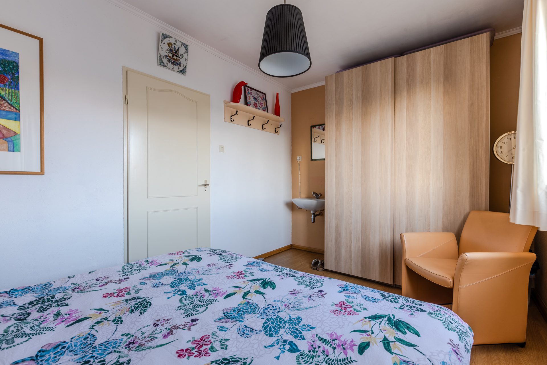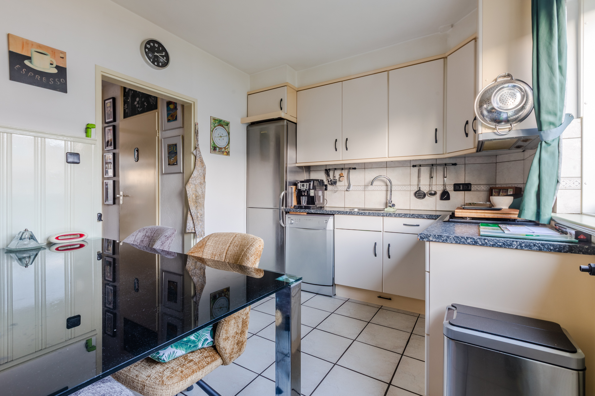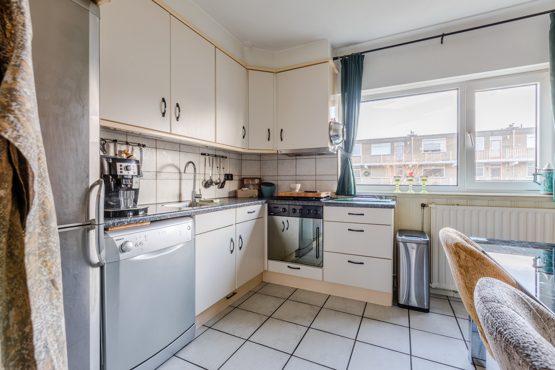Op de overloop vind je een ruim toilet met fonteintje en heb je toegang tot de lichte woonkamer met een massief houten vloer, elektrische kachel en toegang tot het balkon, gelegen op het noordwesten. De dichte keuken is voorzien van verschillende apparatuur, waaronder een 4-pits gaskookplaat, afzuigkap, oven, vaatwasser en een koel-/vriescombinatie. De keuken is afgewerkt met een tegelvloer.