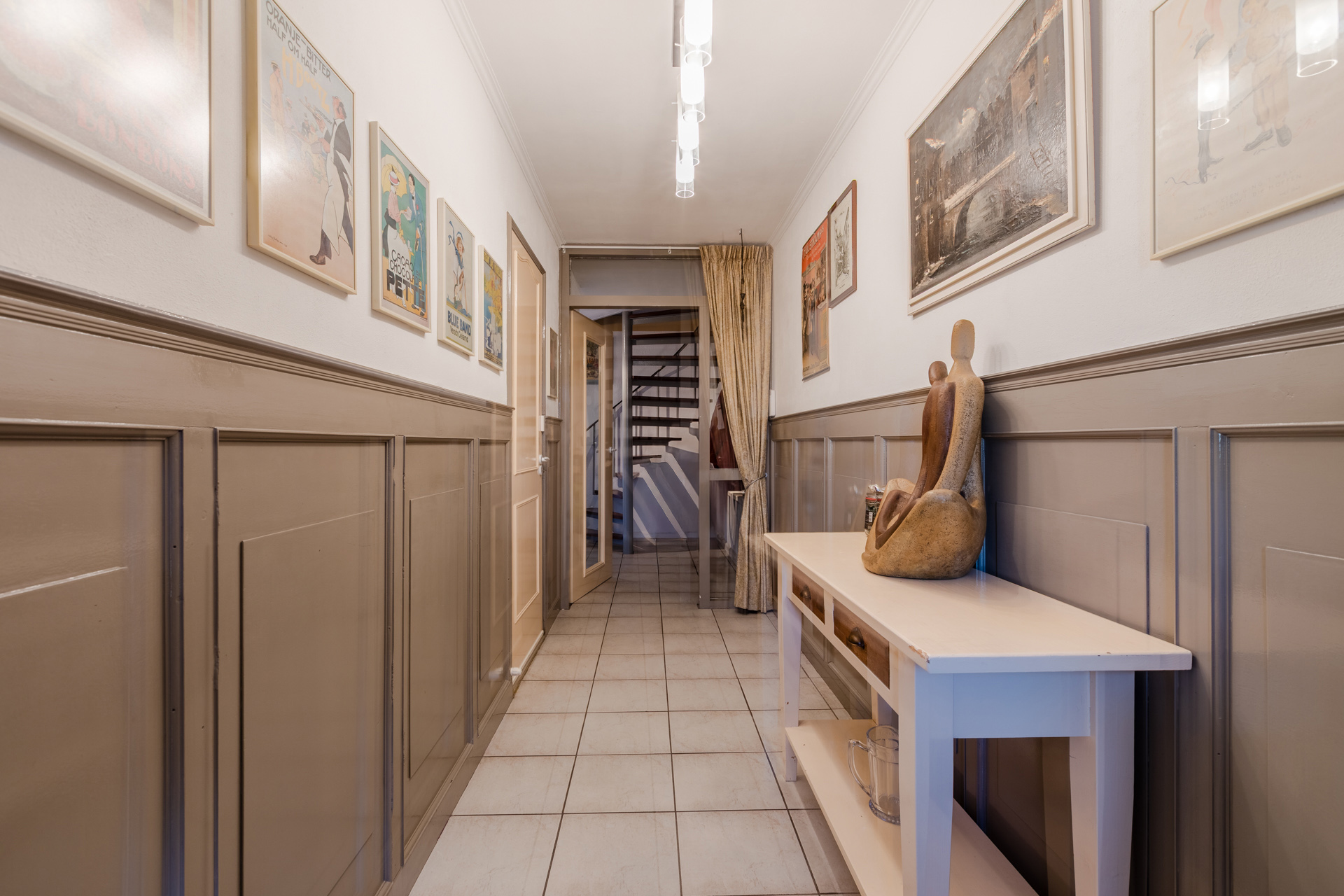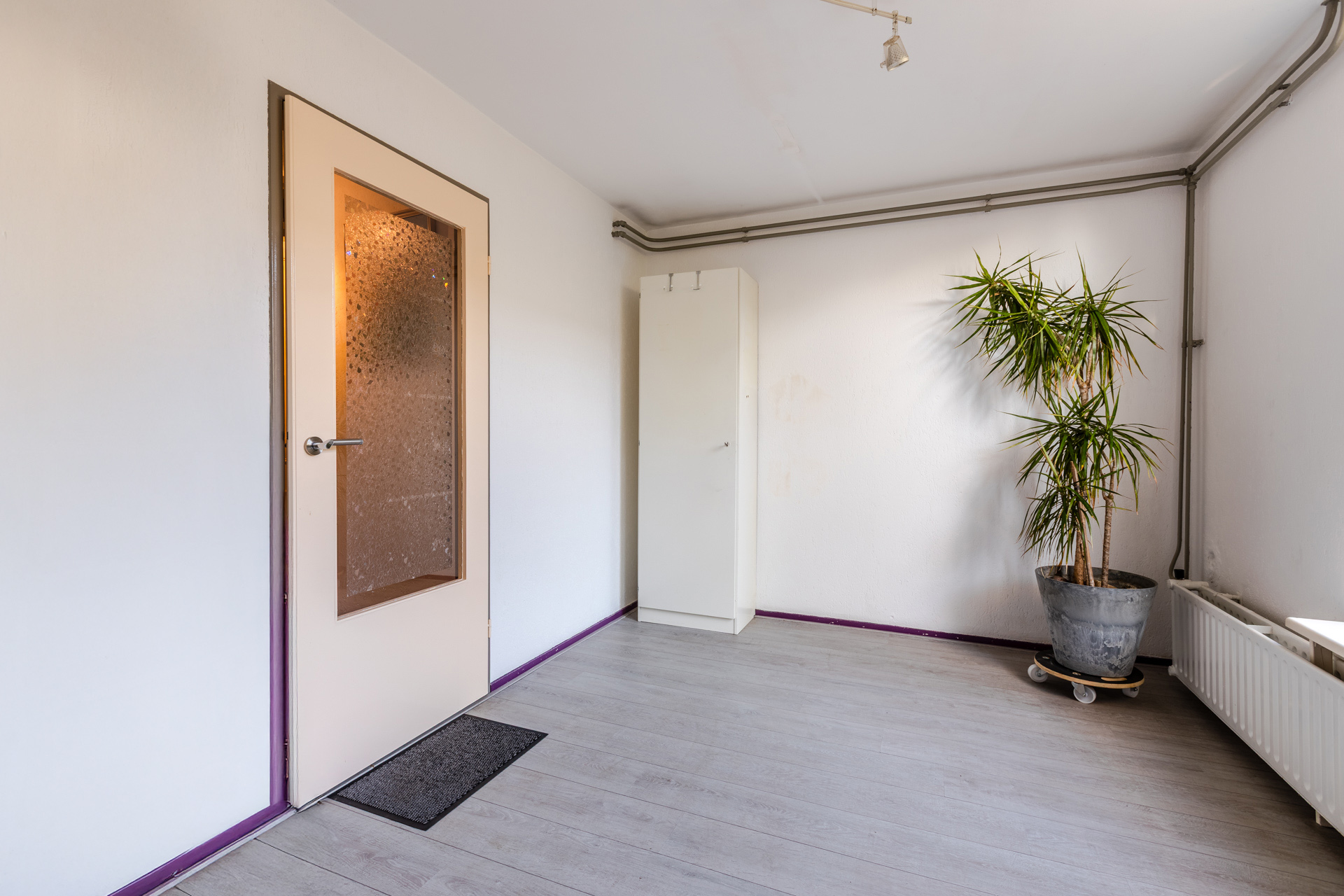 Bij binnenkomst kom je in een lange gang met tegelvloer en meterkast. Vanuit de gang heb je toegang tot de inpandige garage met witgoedaansluitingen en een elektrische deur, een provisiekast en een multifunctionele tuin-/werk-/slaapkamer met toegang tot de achtertuin.