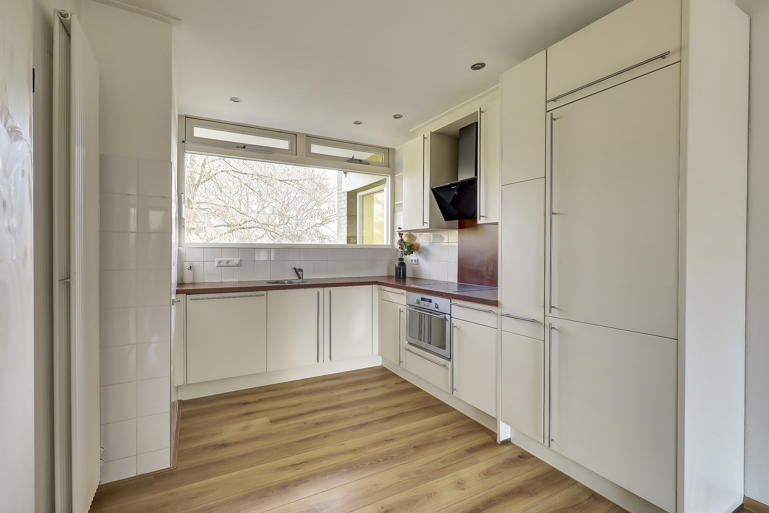 De ruime woonkamer vormt het hart van het appartement en biedt volop plek voor zowel een comfortabele zithoek als een eethoek. , De open keuken sluit hier direct op aan en is uitgevoerd in een hoekopstelling met inbouwapparatuur, waardoor koken en wonen prettig samenkomen.