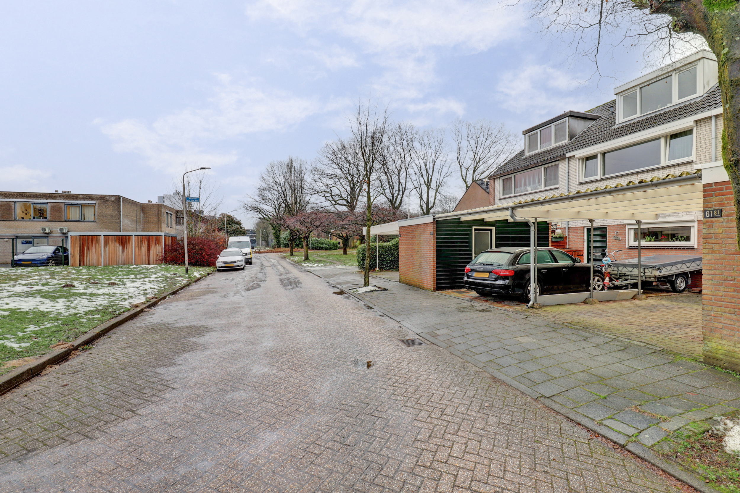 Aan de voorzijde is er een voortuin. Parkeren kan openbaar en op eigen terrein door middel van de carport.