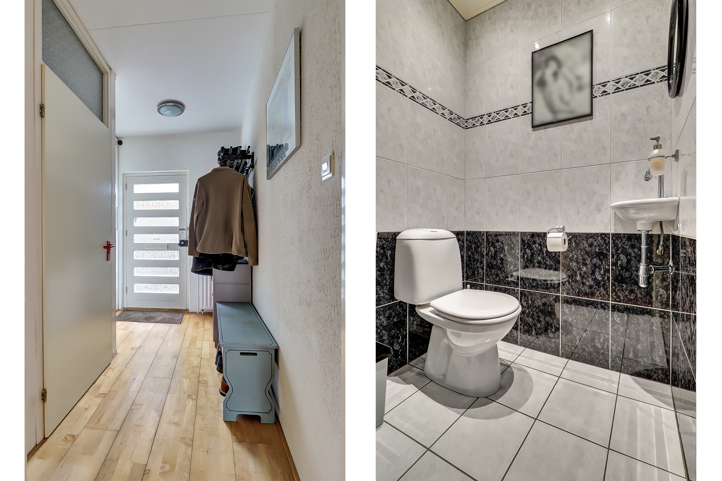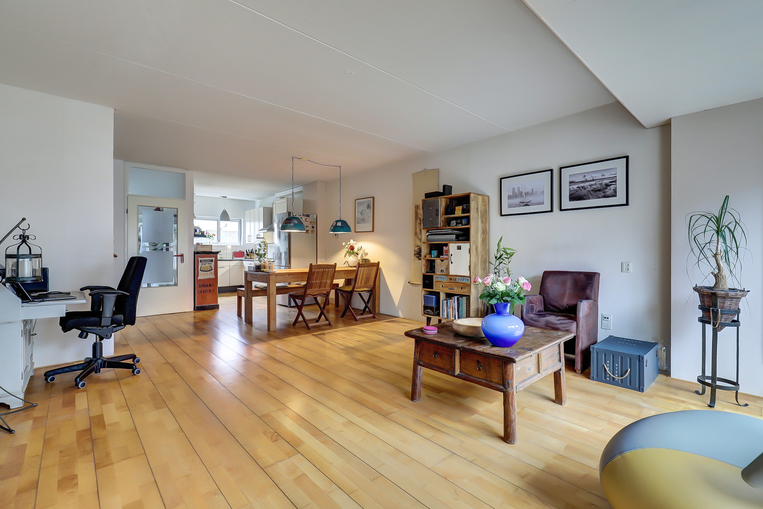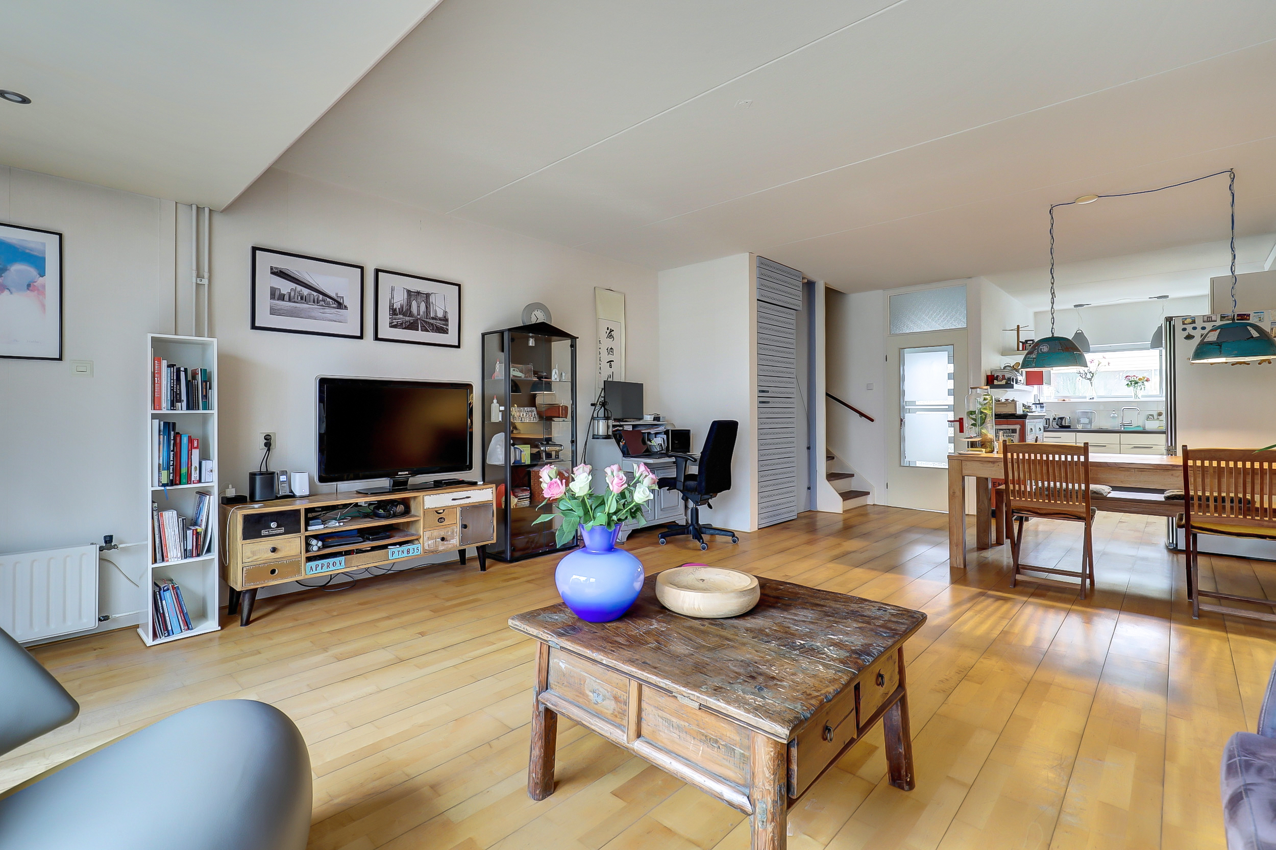 Via de hal komen we de woning binnen. Hier bevinden zich het toilet, de meterkast en toegang tot de woonkamer. De woonkamer heeft een oppervlakte van circa 37 m² en biedt voldoende ruimte voor zowel een zitgedeelte als een eethoek. Door de indeling is de ruimte goed te benutten en is er prettig daglicht aanwezig. Vanuit de woonkamer is de achtertuin bereikbaar.