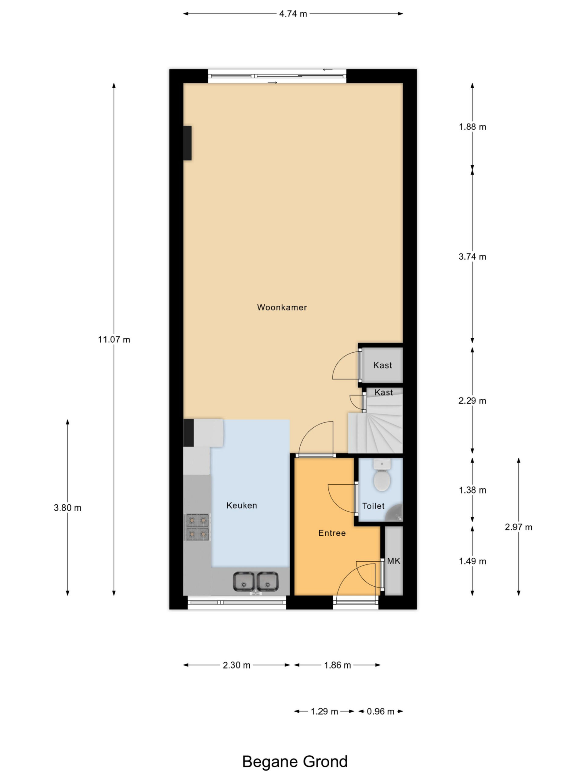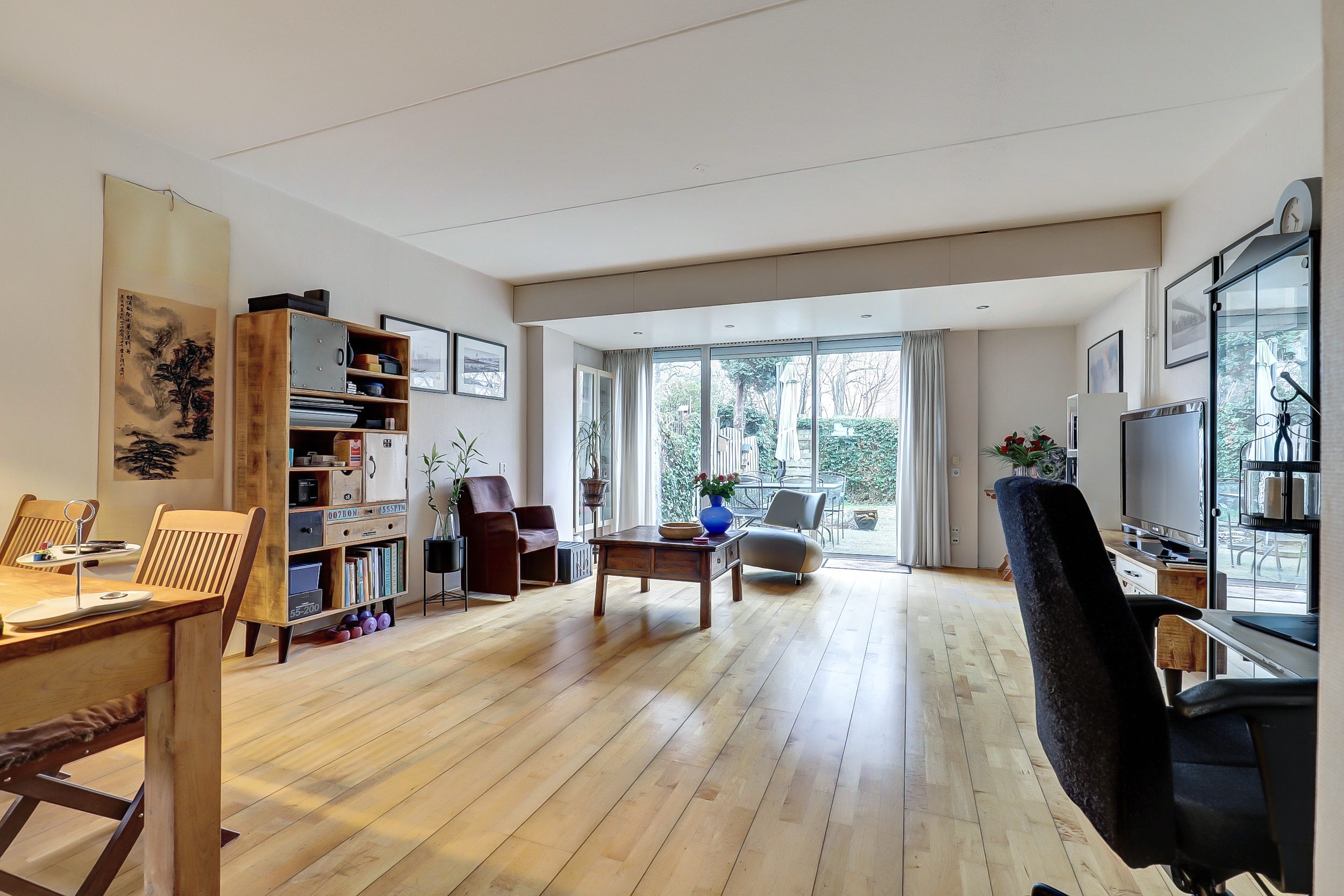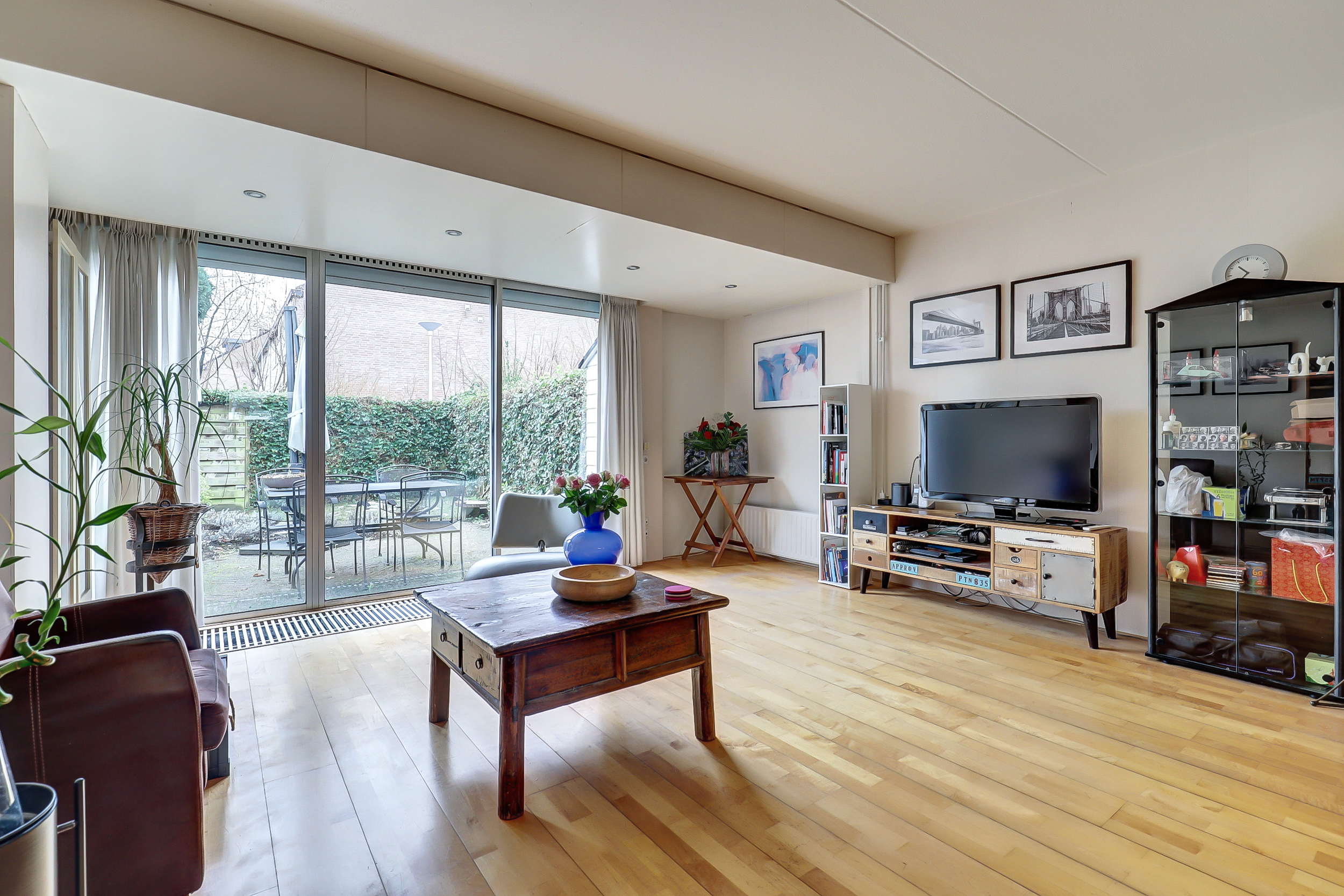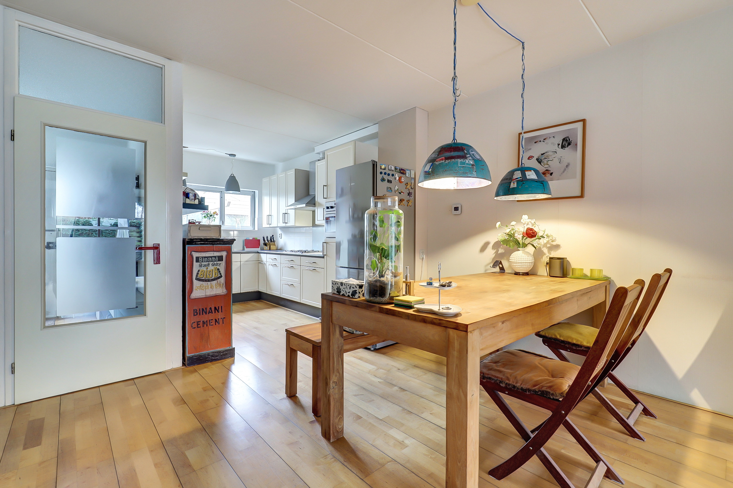 Via de hal komen we de woning binnen. Hier bevinden zich het toilet, de meterkast en toegang tot de woonkamer. De woonkamer heeft een oppervlakte van circa 37 m² en biedt voldoende ruimte voor zowel een zitgedeelte als een eethoek. Door de indeling is de ruimte goed te benutten en is er prettig daglicht aanwezig. Vanuit de woonkamer is de achtertuin bereikbaar.