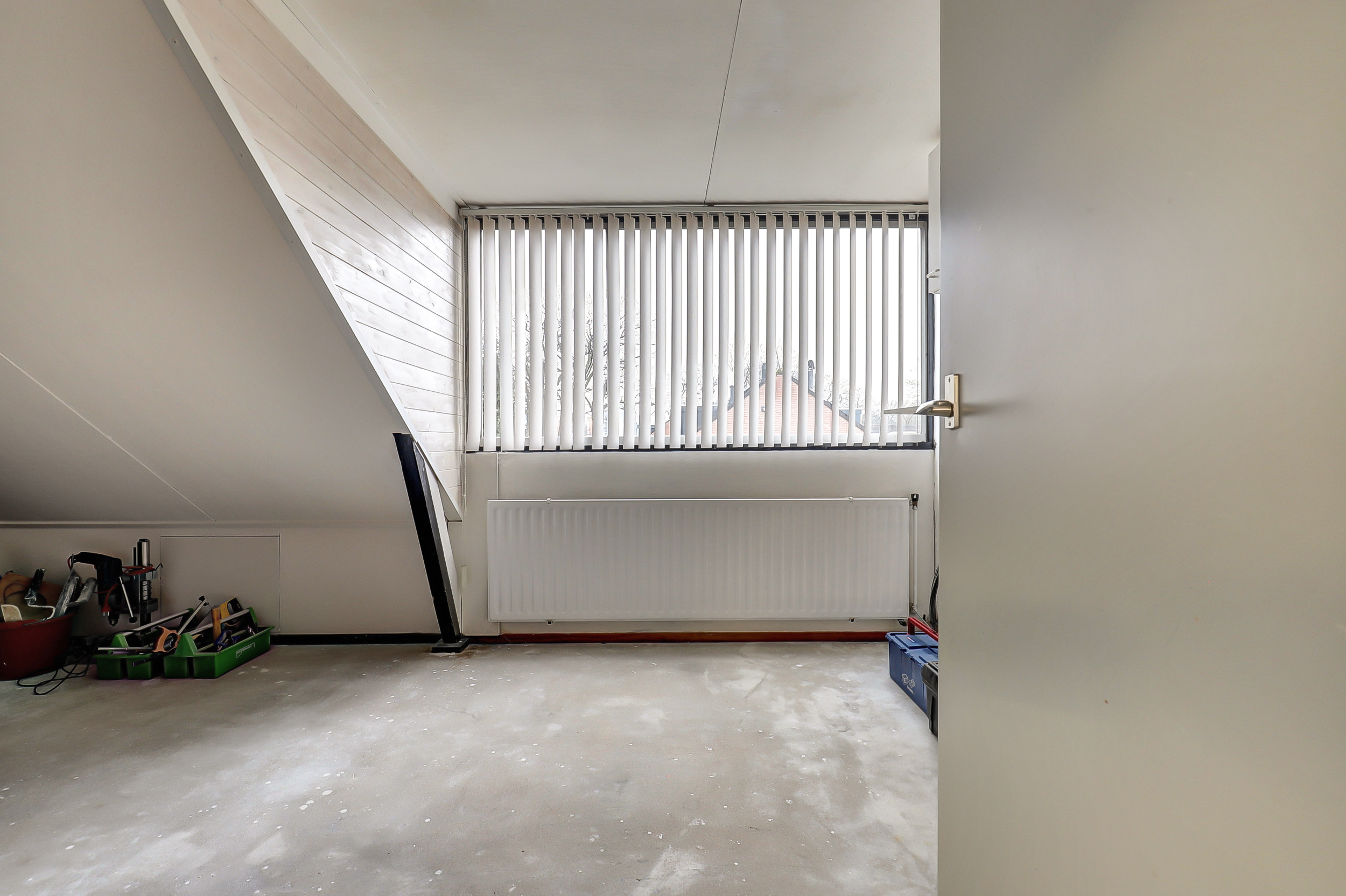 Via een vaste trap bereiken we de tweede verdieping. Hier bevindt zich de derde slaapkamer. Daarnaast is er extra bergruimte aanwezig, waardoor deze verdieping ook praktisch is voor opslag of een werkplek aan huis.