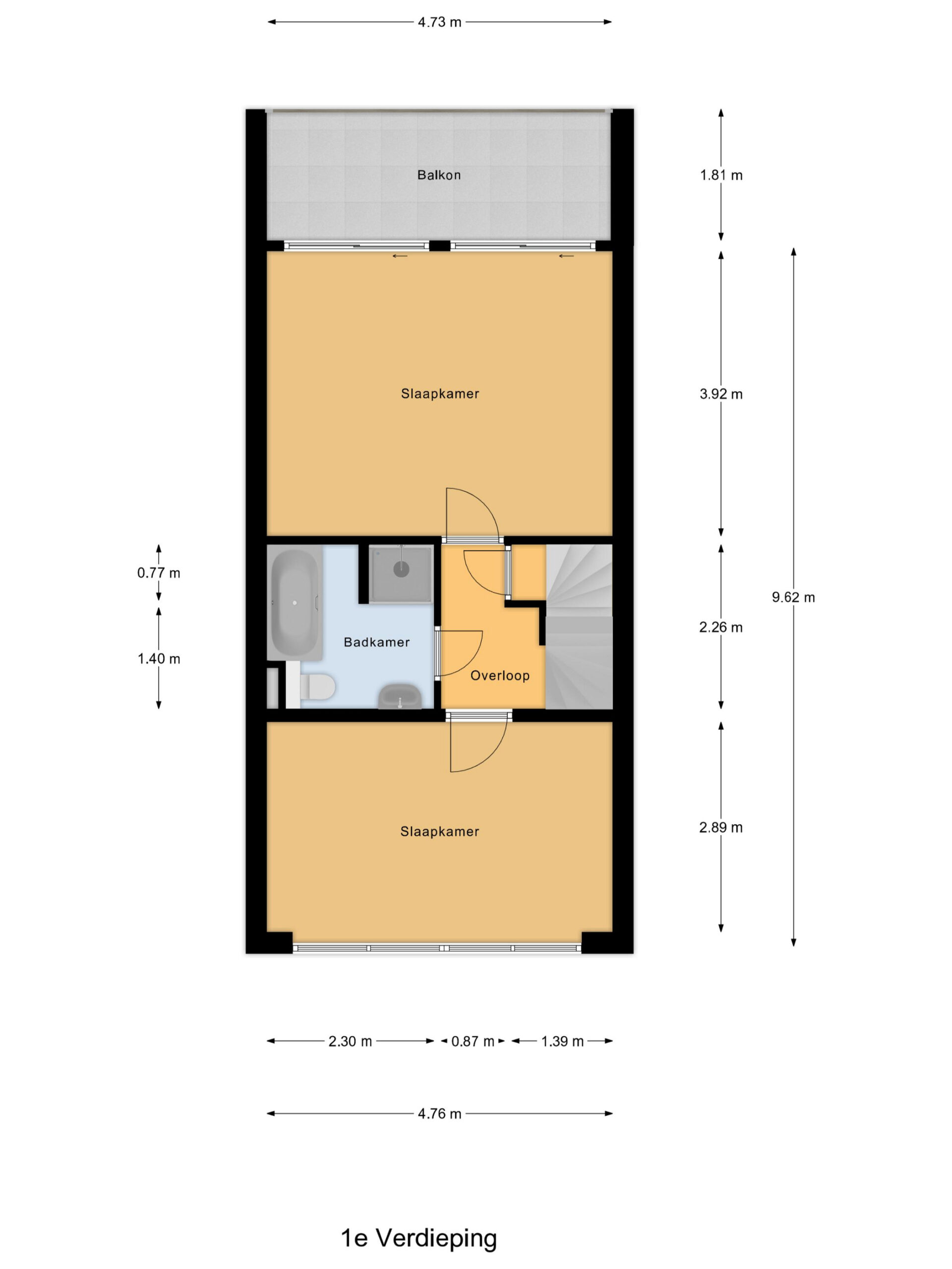 Op de eerste verdieping komen we uit op de overloop die toegang biedt tot 2 slaapkamers en de badkamer. De slaapkamers hebben een prettig formaat en zijn functioneel ingedeeld. De slaapkamer aan de achterzijde heeft toegang tot het balkon, gelegen op het zuiden. De badkamer is compleet uitgevoerd met een douche, ligbad, wastafel en toilet.
