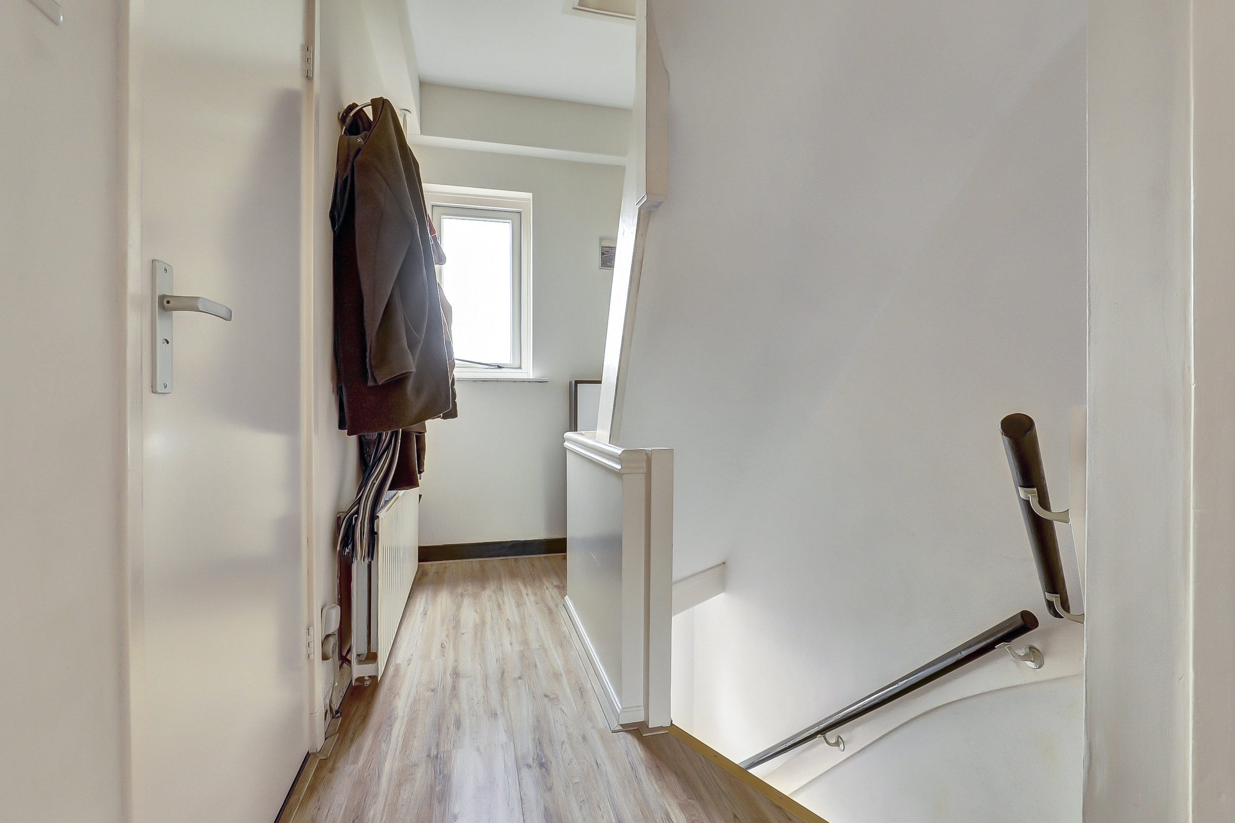 Je betreedt de woning op de begane grond, waar de meterkast en de trap naar zowel de eerste verdieping als naar de kelder zich bevinden.