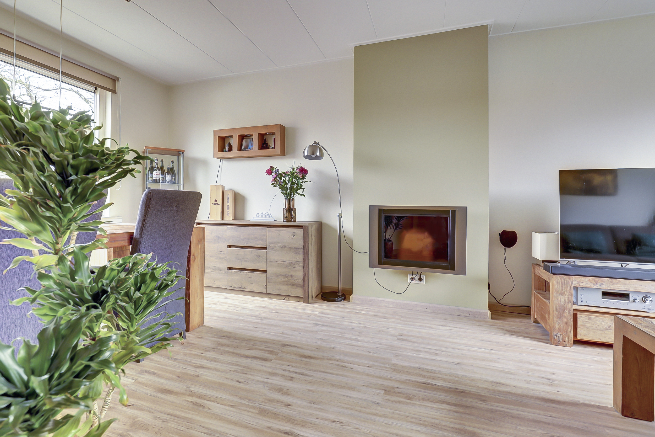 Op de eerste verdieping leidt de overloop naar het toilet met fontein, een praktische kastruimte en de trap naar boven. Vanuit hier stap je de royale woonkamer binnen. Grote raampartijen aan beide zijden laten het daglicht vrij binnenstromen en creëren een ruimtelijke sfeer.