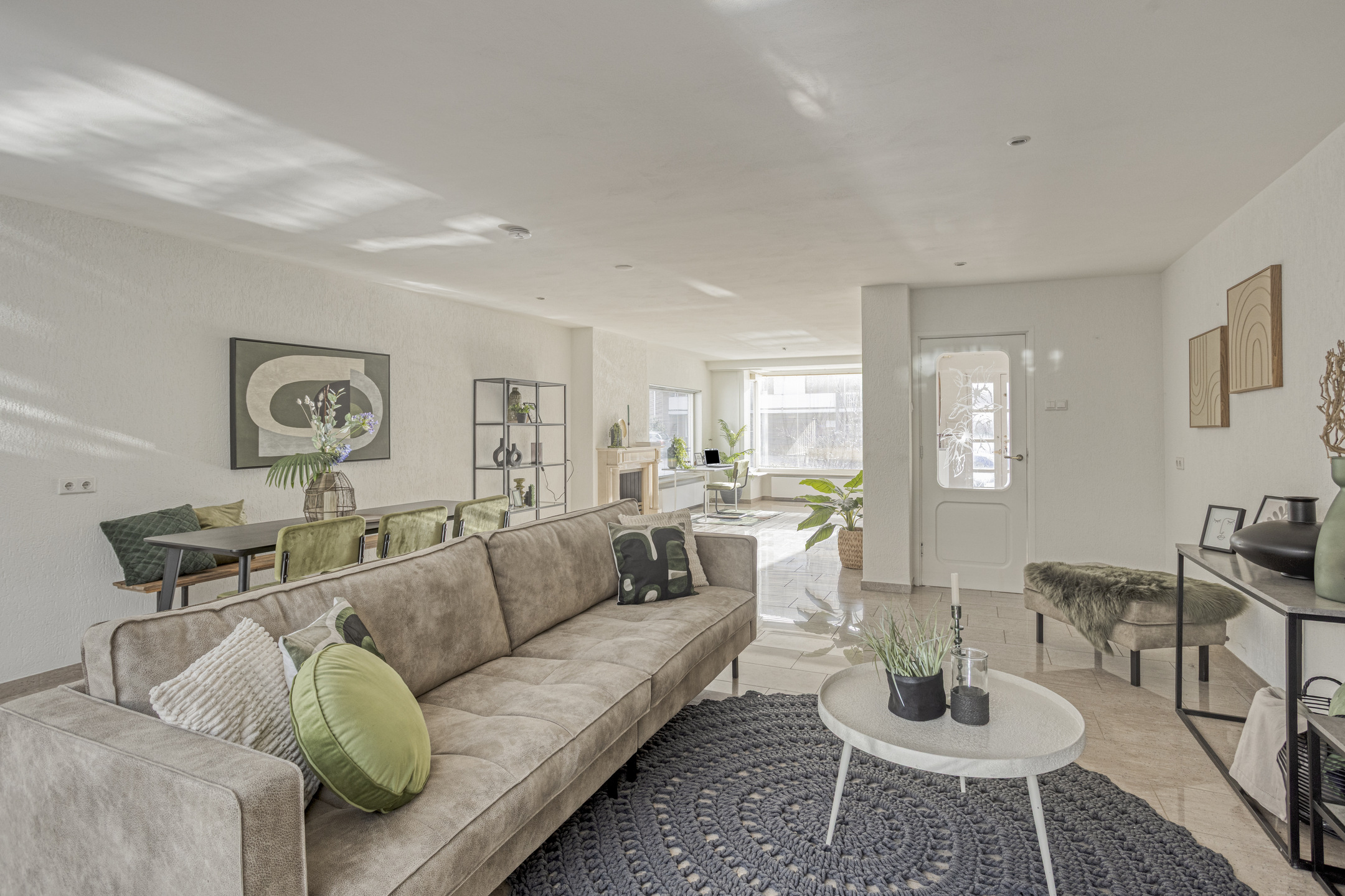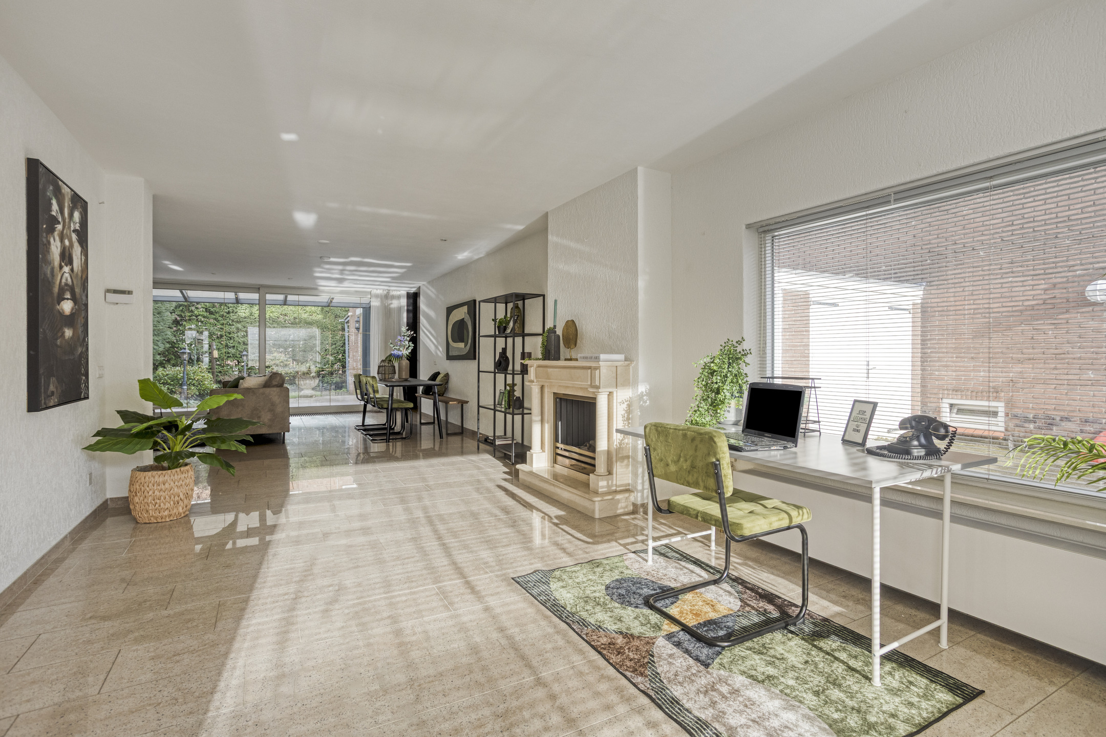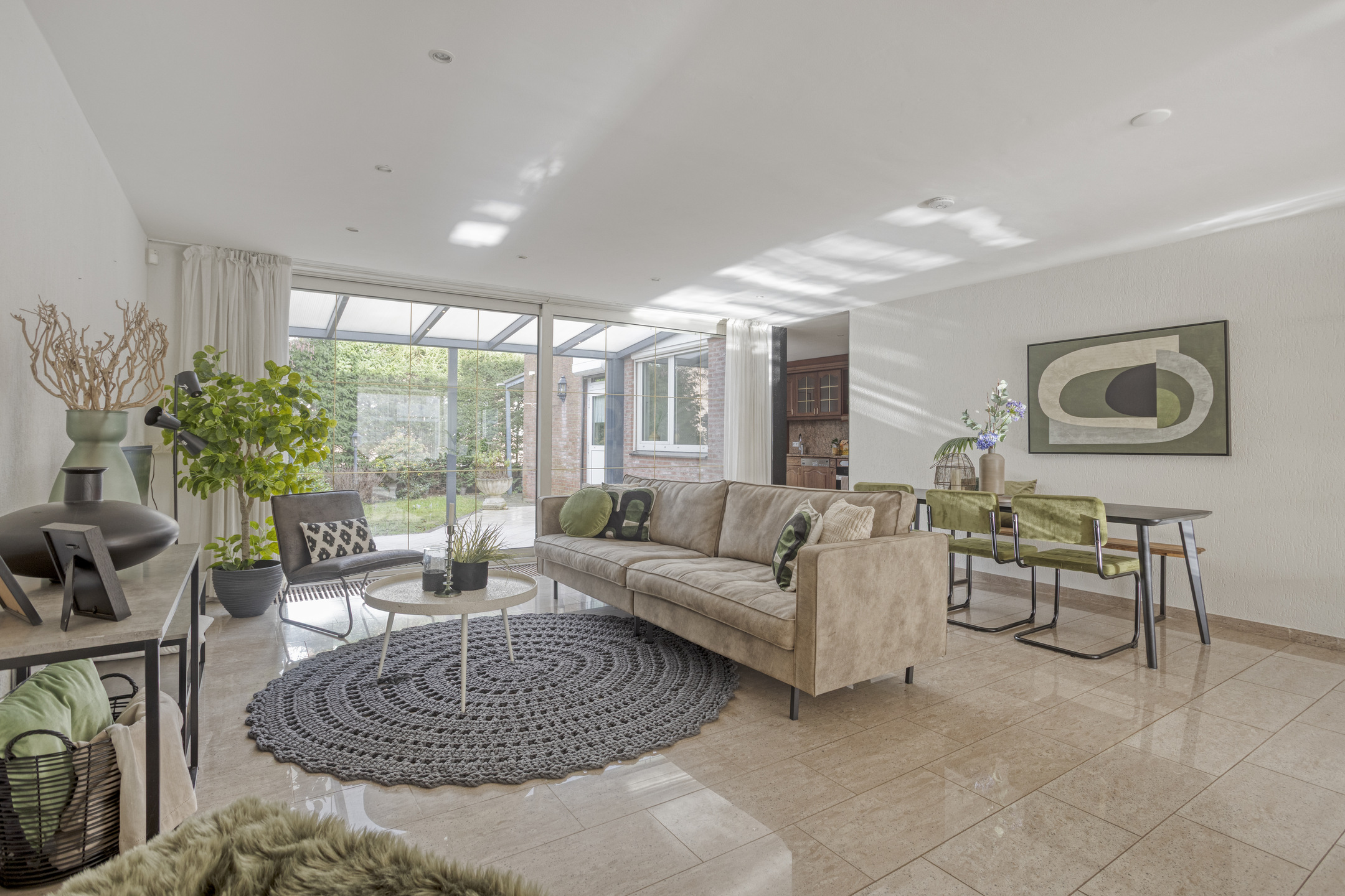 Je komt binnen in een verzorgde entree met toiletruimte en fonteintje. De woonkamer opent zich royaal en licht, met een sfeervolle erker aan de voorzijde en een gashaard die de ruimte warmte en karakter geeft. Dankzij de uitbouw en de schuifpui over de volle breedte van de woonkamer, loopt binnen moeiteloos over in buiten. Je stapt zo onder de vaste overkapping de besloten achtertuin in.