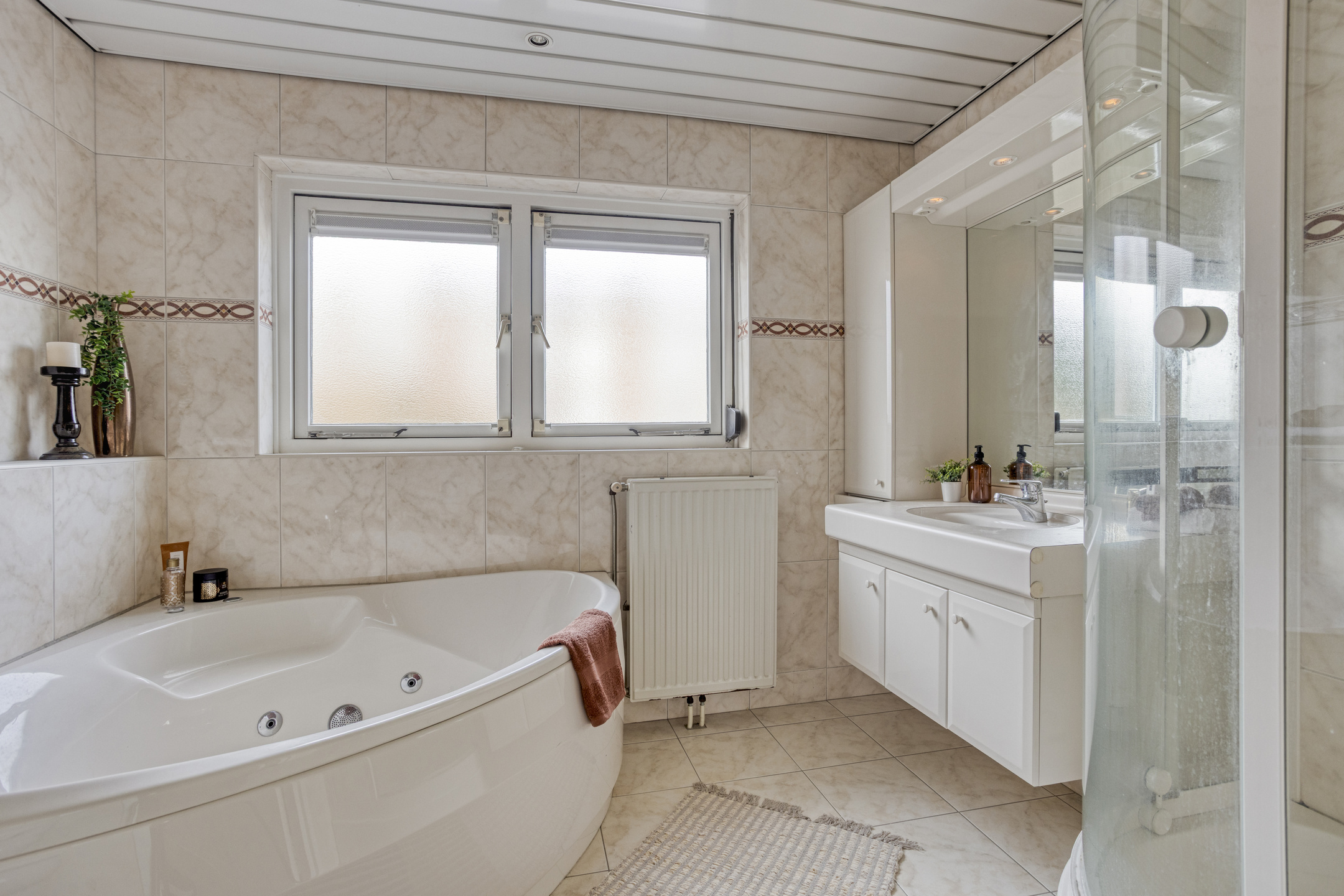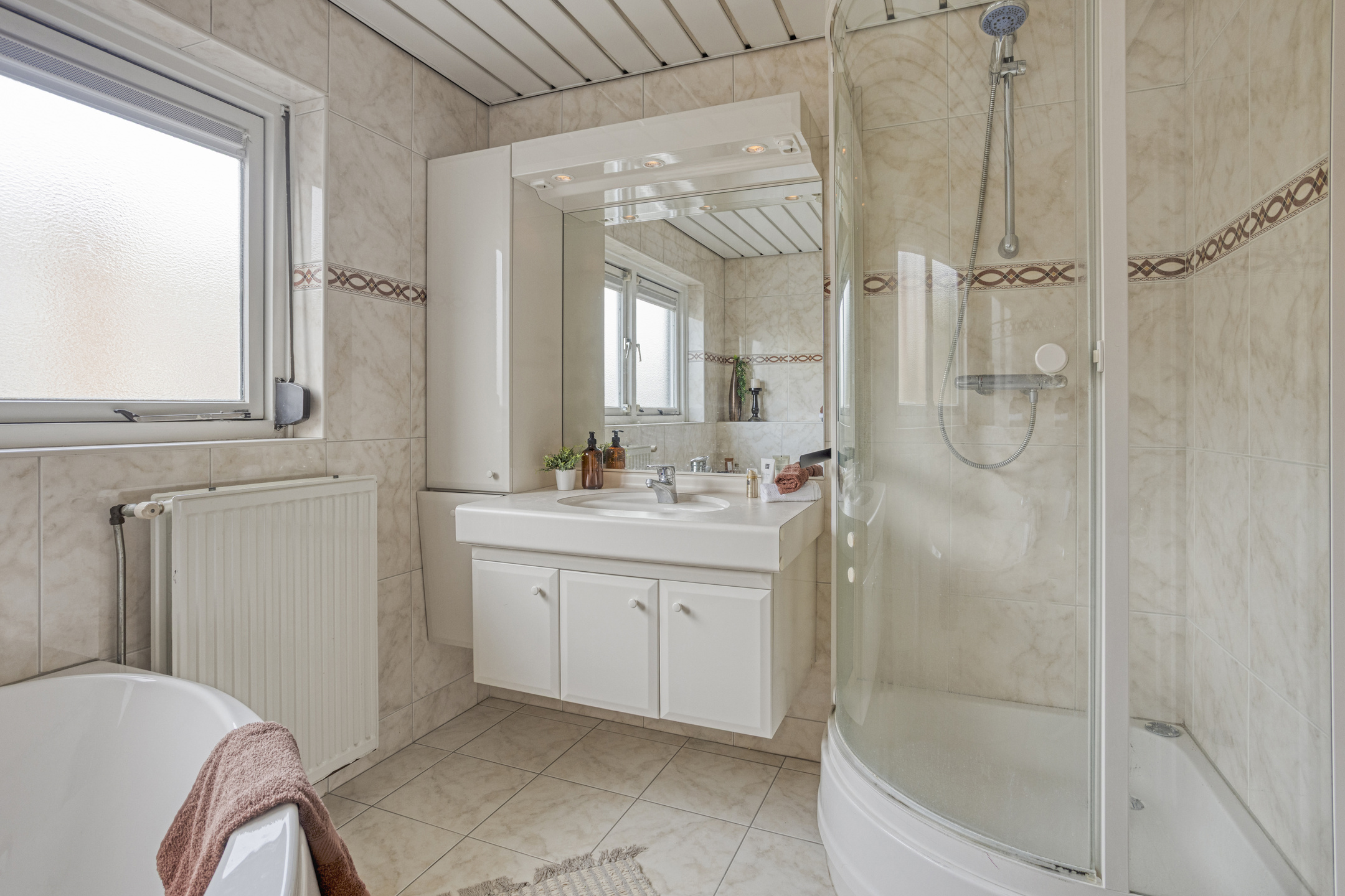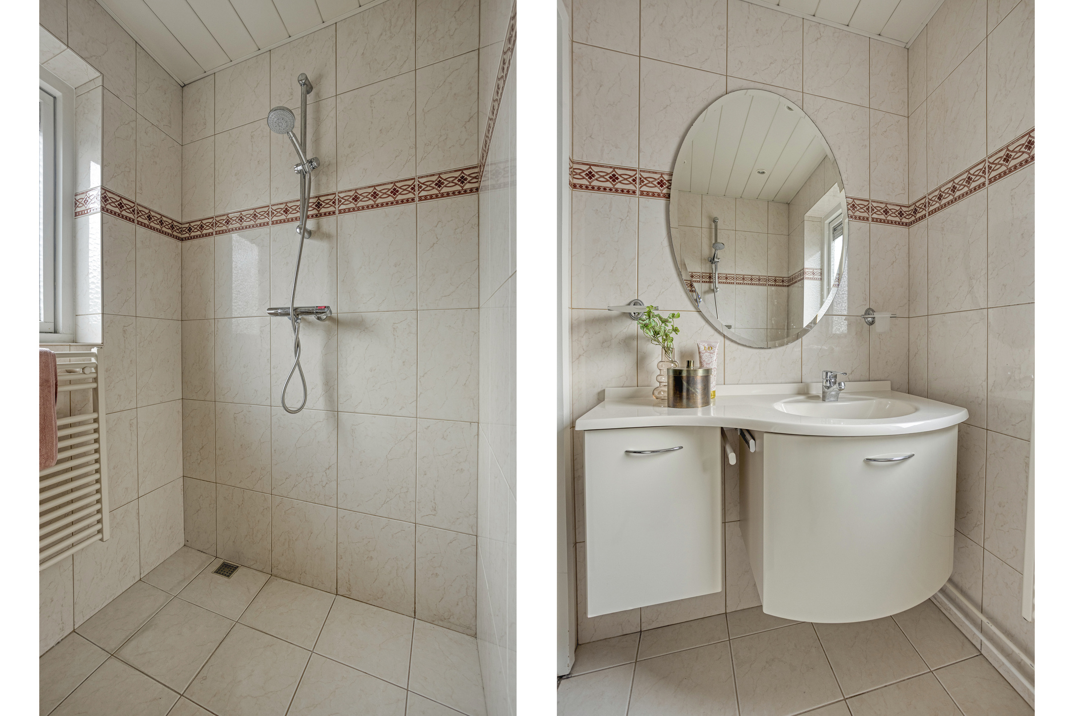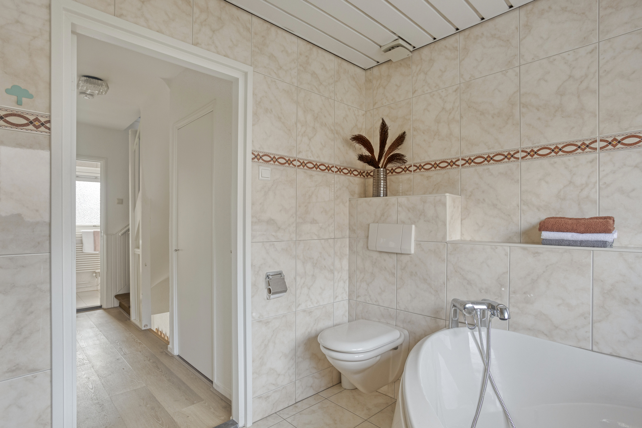 Aan de voorzijde bevindt zich een badkamer met douche en wastafel. De tweede badkamer, aan de achterzijde, pakt uit met een royaal hoekbad, douche, zwevend toilet en wastafel met -meubel. Ideaal voor gezinnen en drukke ochtenden.