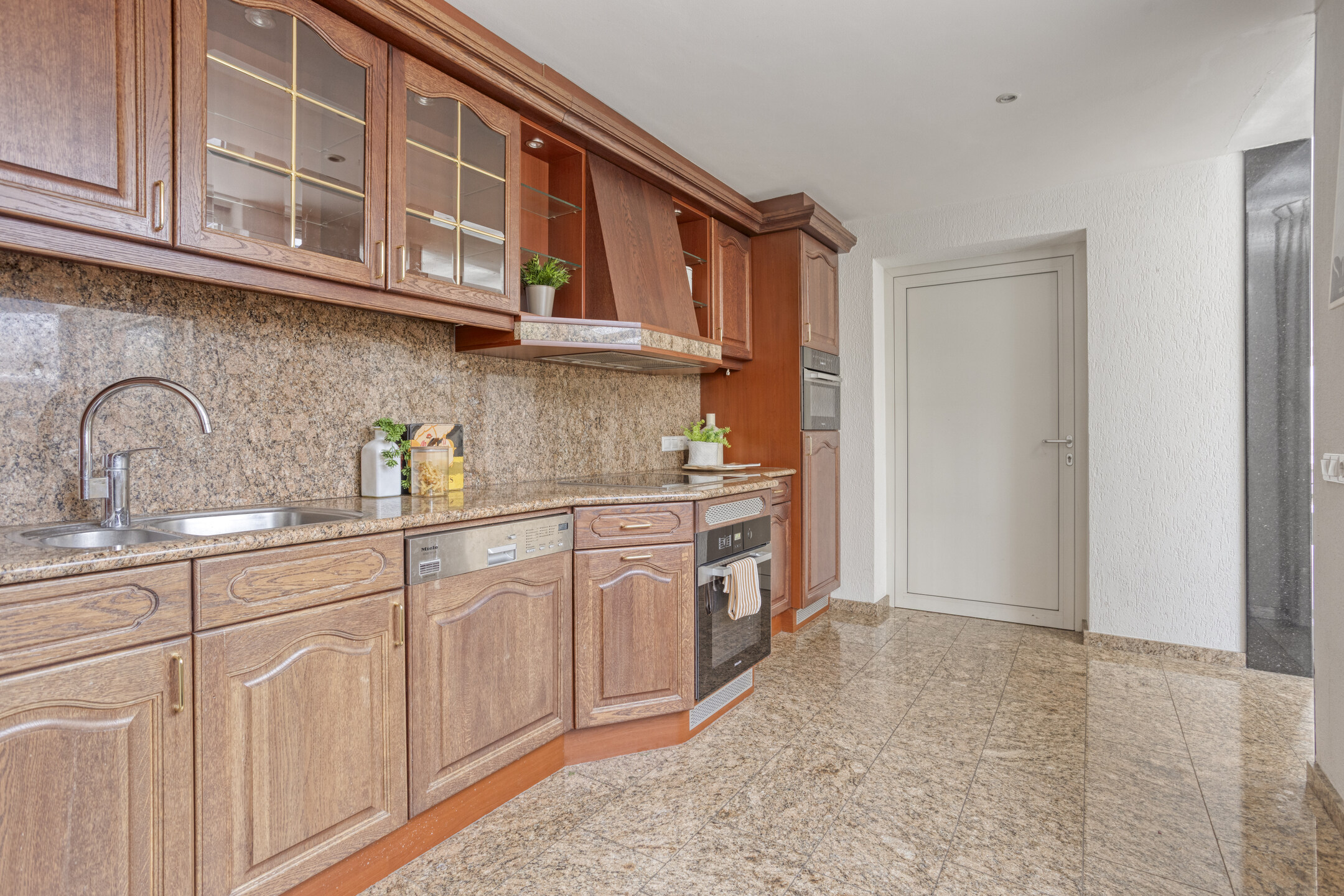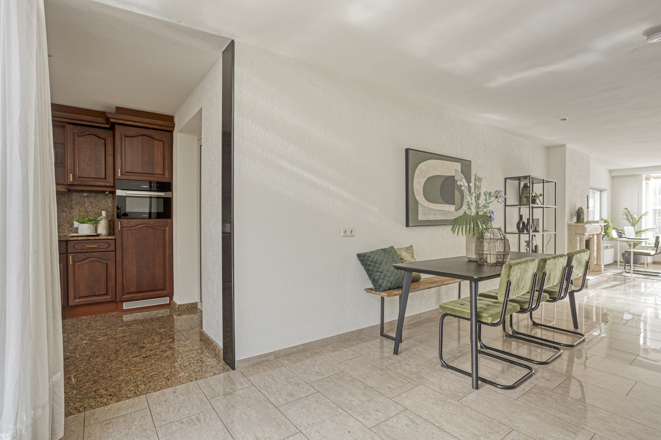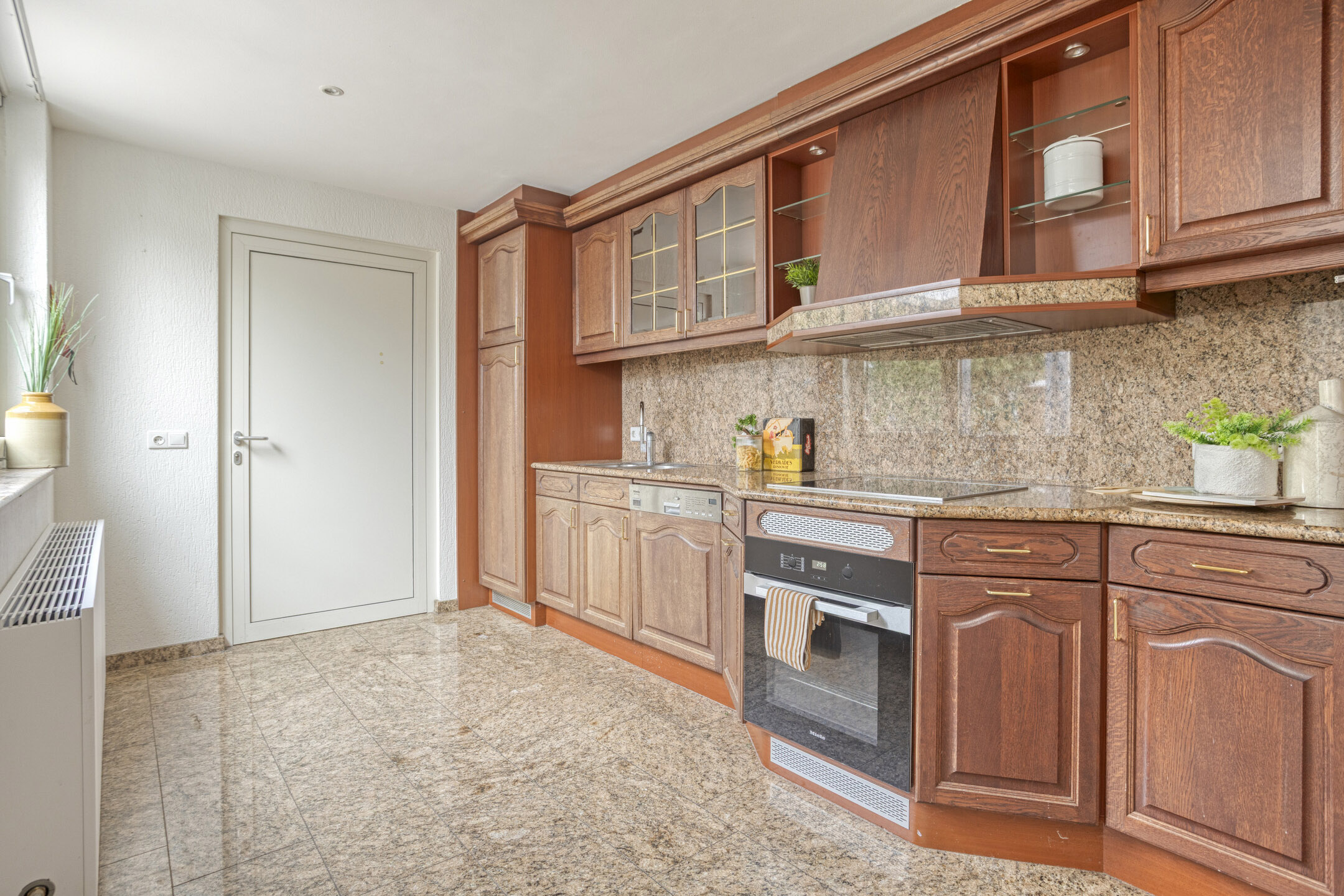 De half open keuken sluit hier perfect op aan en is voorzien van o.a. een granieten aanrechtblad en hoogwaardige Miele inbouwapparatuur, waaronder een inductiekookplaat. Vloerverwarming in de woonkamer, keuken en bijkeuken verhoogt het comfort en houdt het interieur strak.