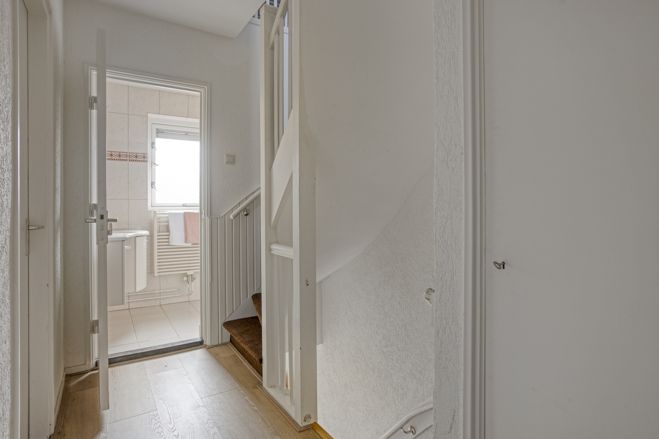 De overloop met vaste kast geeft toegang tot twee ruime slaapkamers. Oorspronkelijk waren dit er drie; een derde slaapkamer is hier eenvoudig te realiseren. In de huidige indeling is de kleinste kamer slim benut als extra badkamer.