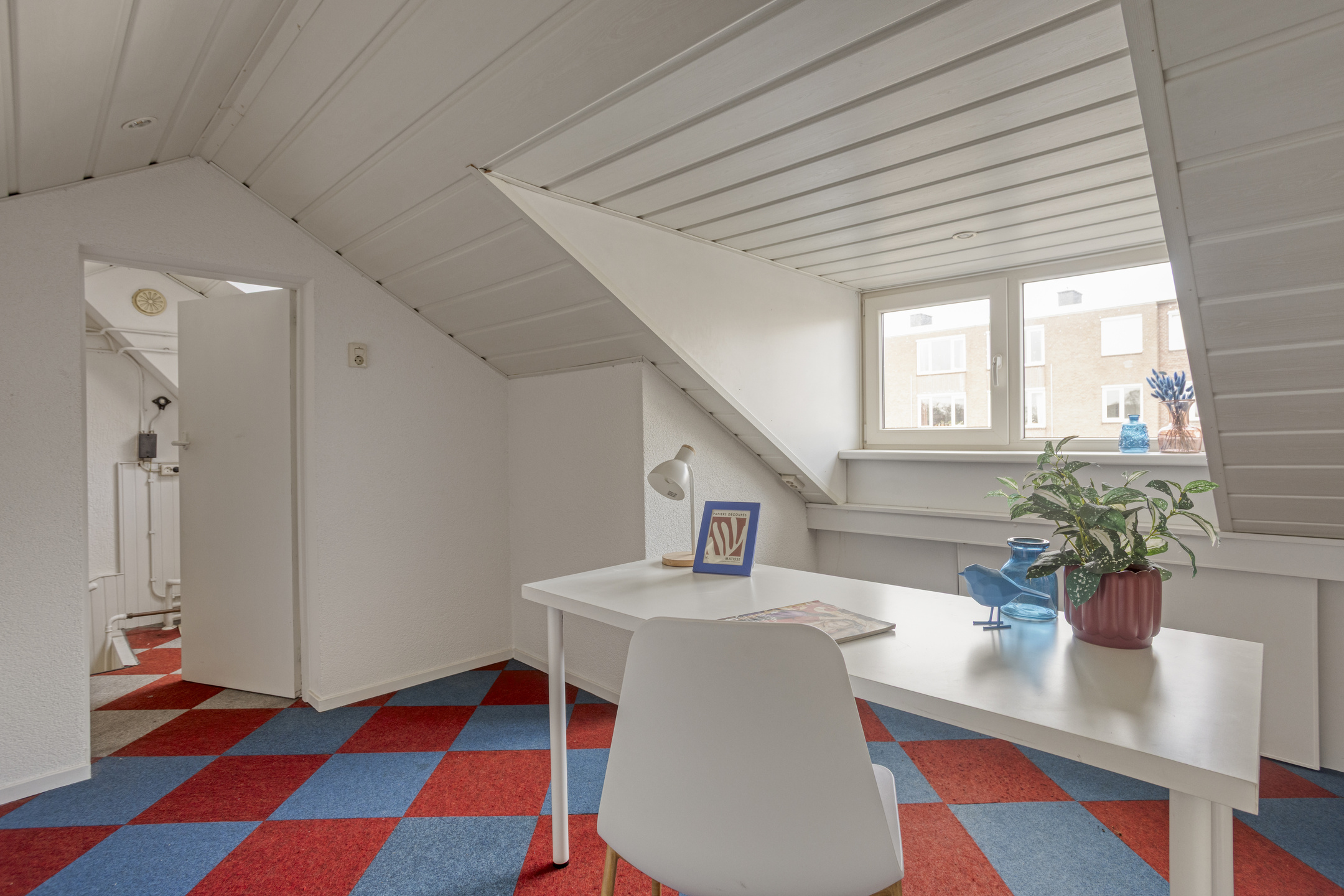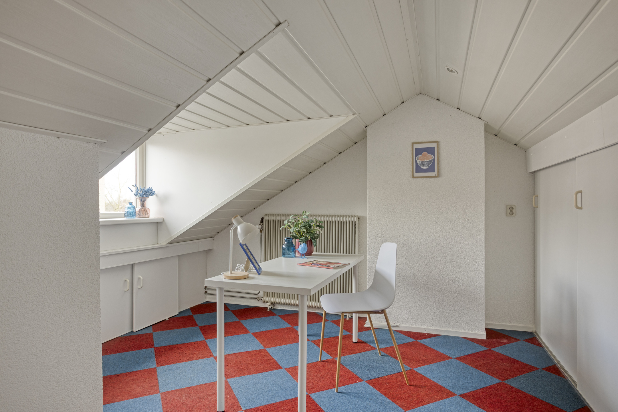 Via een vaste trap bereik je de zolderverdieping. De voorzolder biedt bergruimte en de cv-opstelling (Remeha Calenta, 2012). De slaapkamer met dakkapel aan de achterzijde voelt licht en prettig aan. Achter de knieschotten schuilt verrassend veel opbergruimte. Hoewel deze gehele verdieping vanwege de NEN-normering niet tot het woonoppervlak wordt gerekend, is het absoluut een volwaardige slaap- of werkkamer.