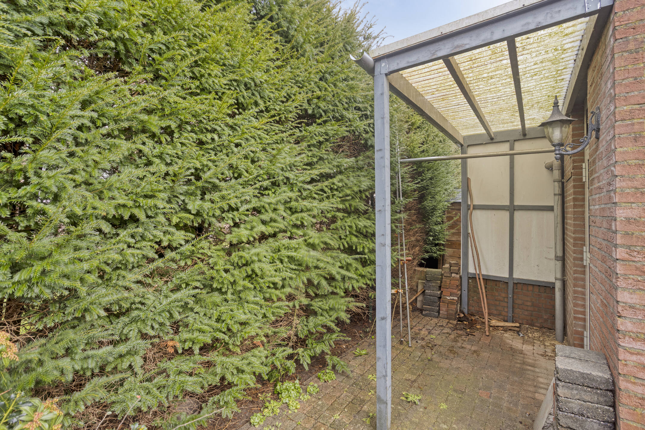De zonnige achtertuin is fraai omsloten door een hoge taxushaag, waardoor je hier geniet van maximale privacy zowel binnen als buiten.