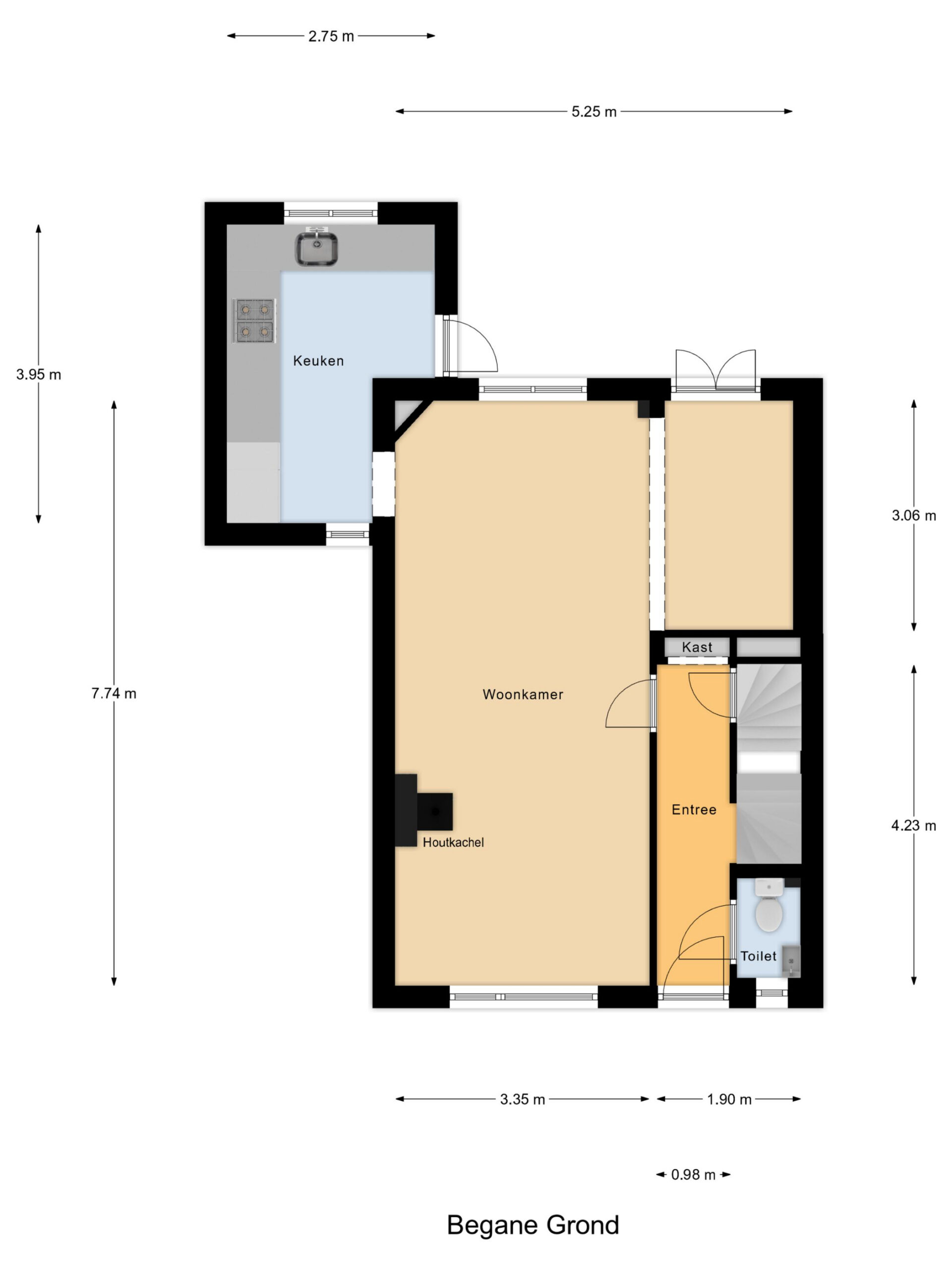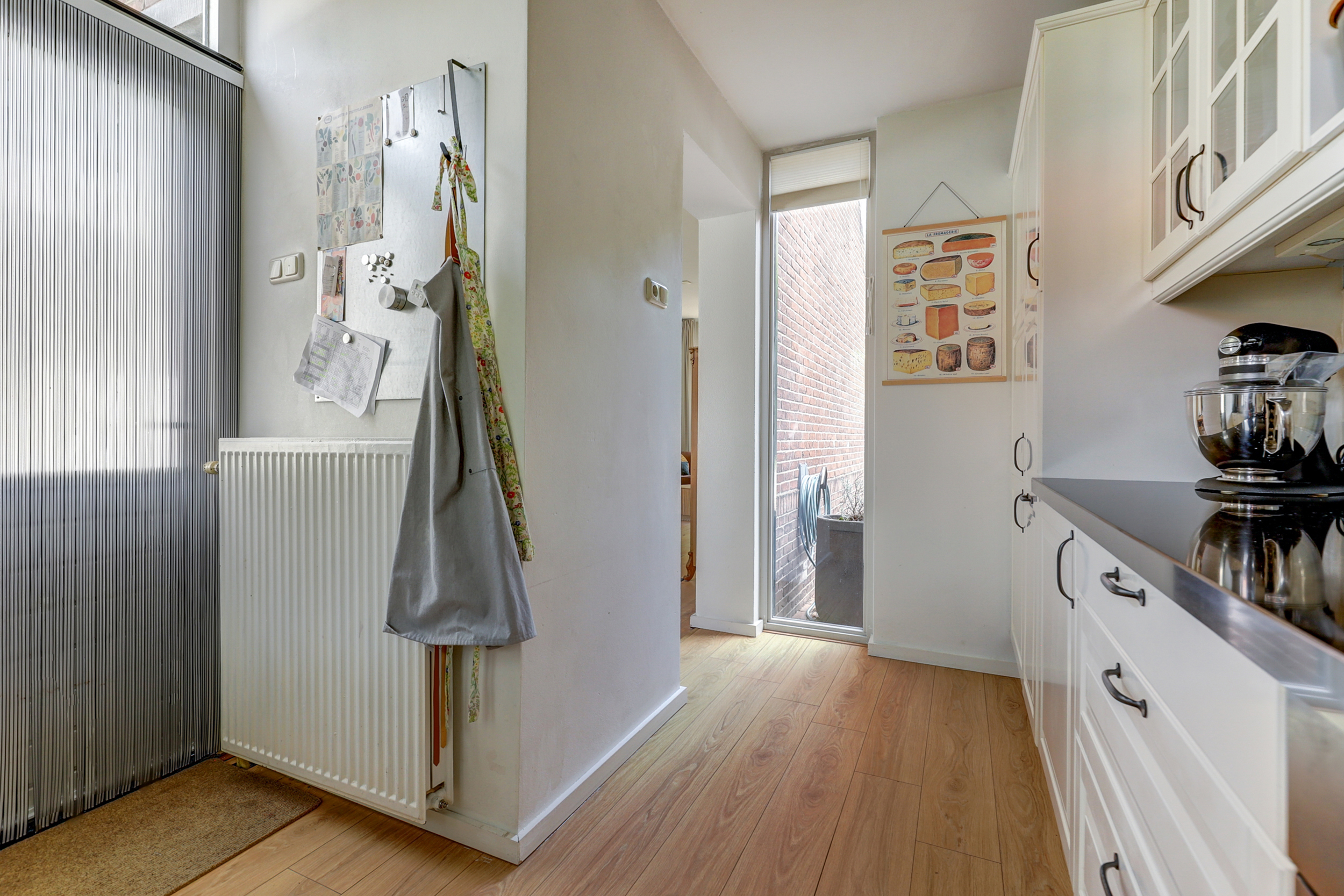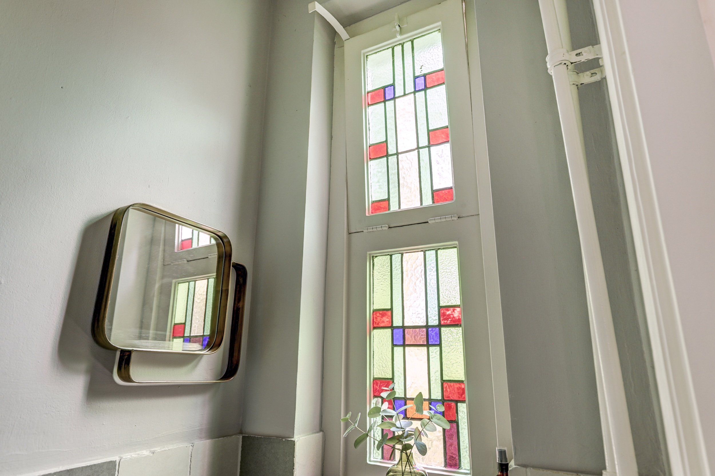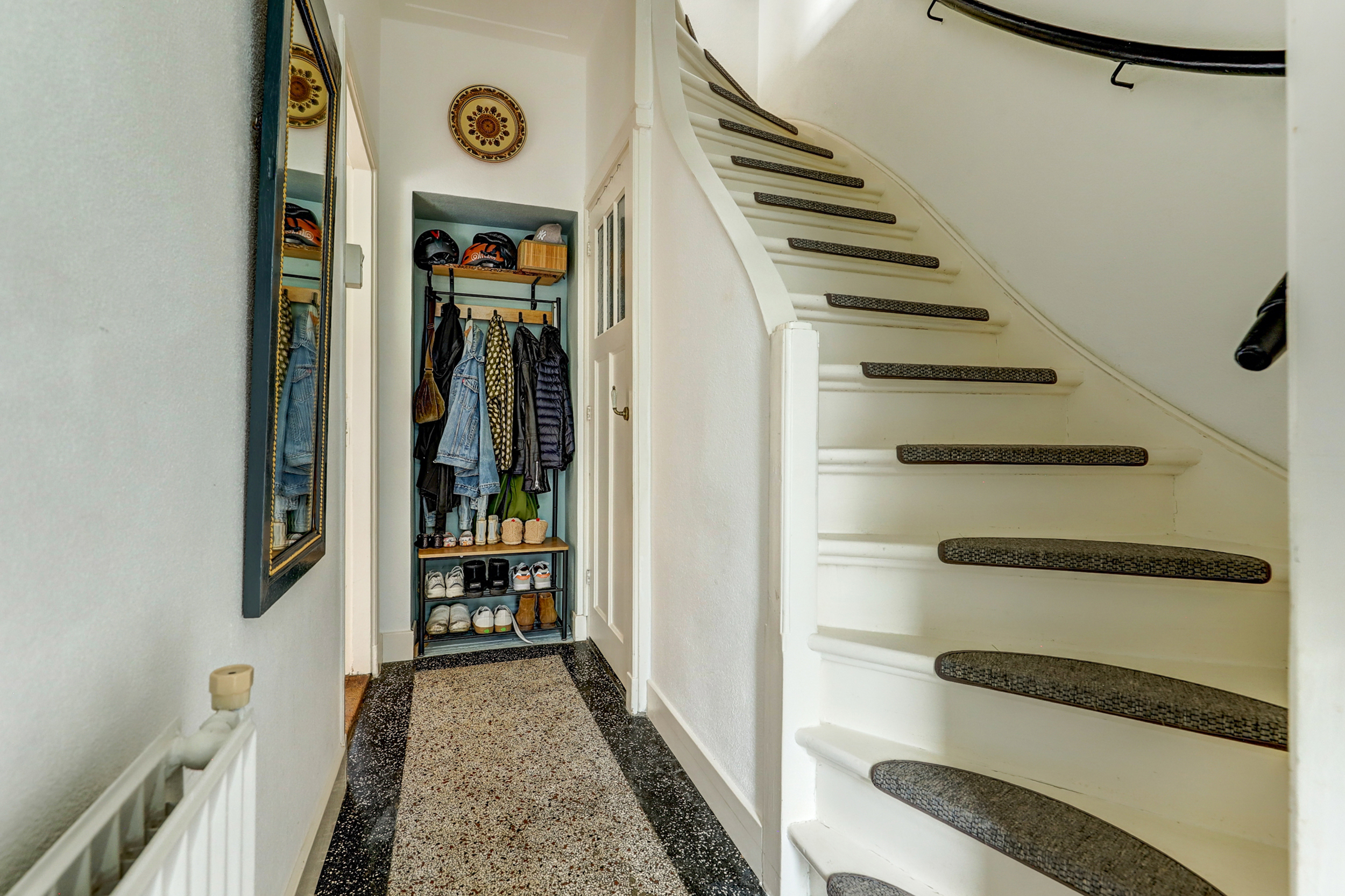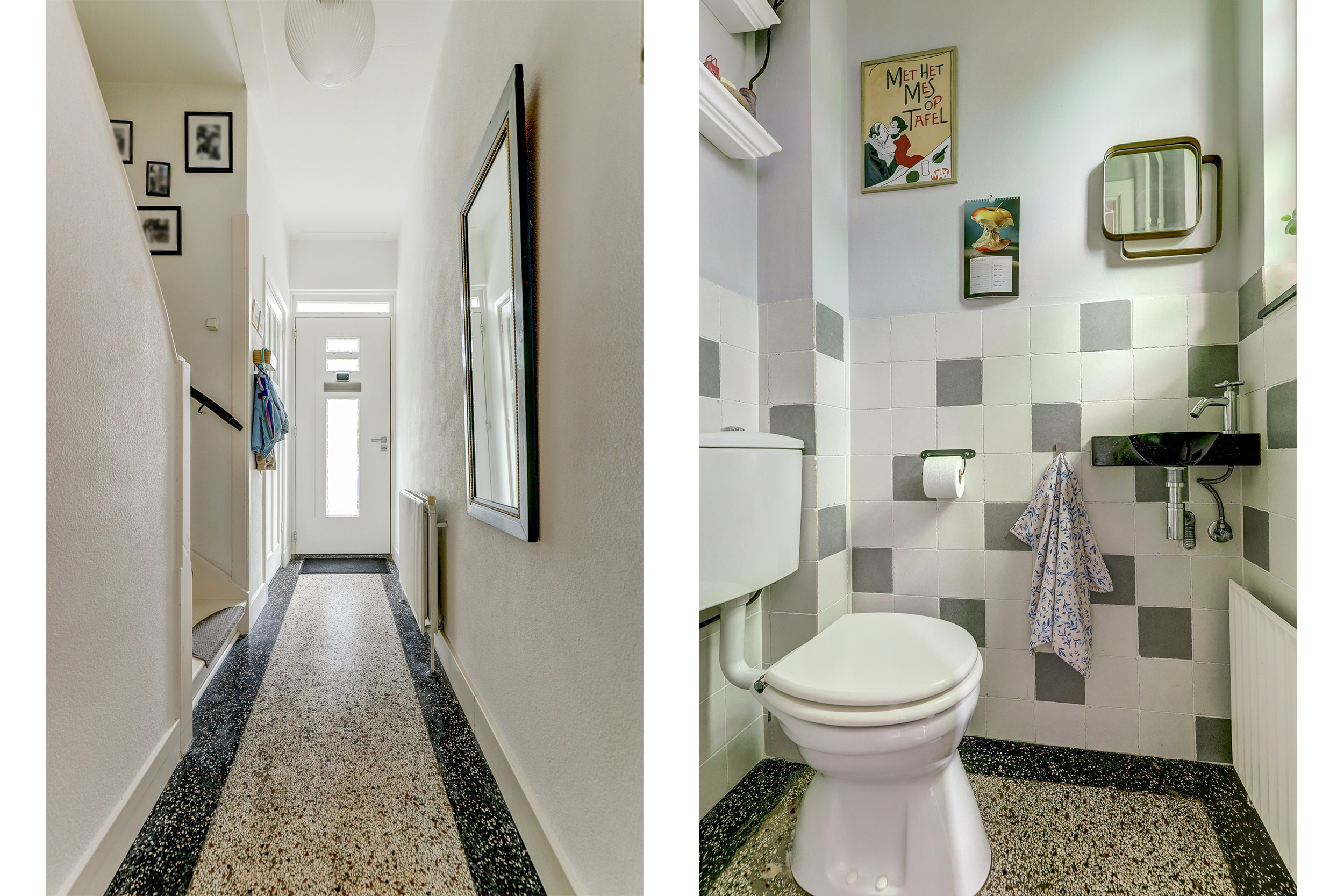 Bij binnenkomst word je verwelkomd in een sfeervolle hal met een stijlvolle terrazzo vloer. Het toilet is voorzien van een fonteintje en een charmant glas-in-loodraam, dat meteen karakter toevoegt. Vanuit de hal heb je toegang tot de woonkamer, de kelder en de trap naar de eerste verdieping.