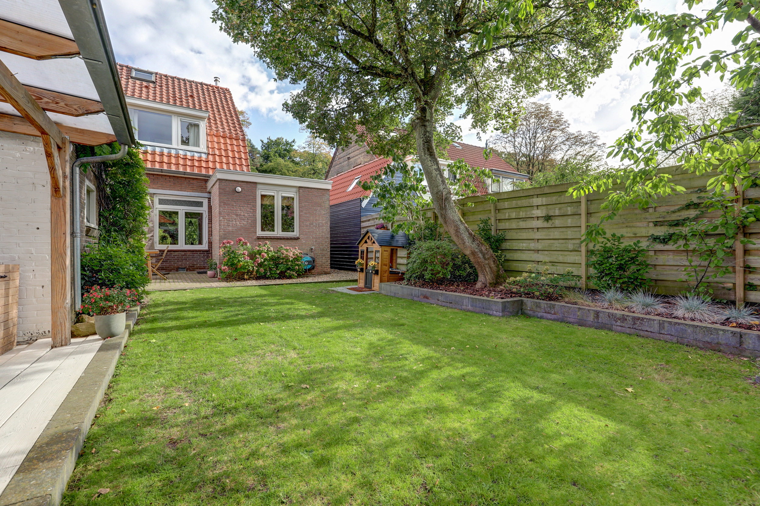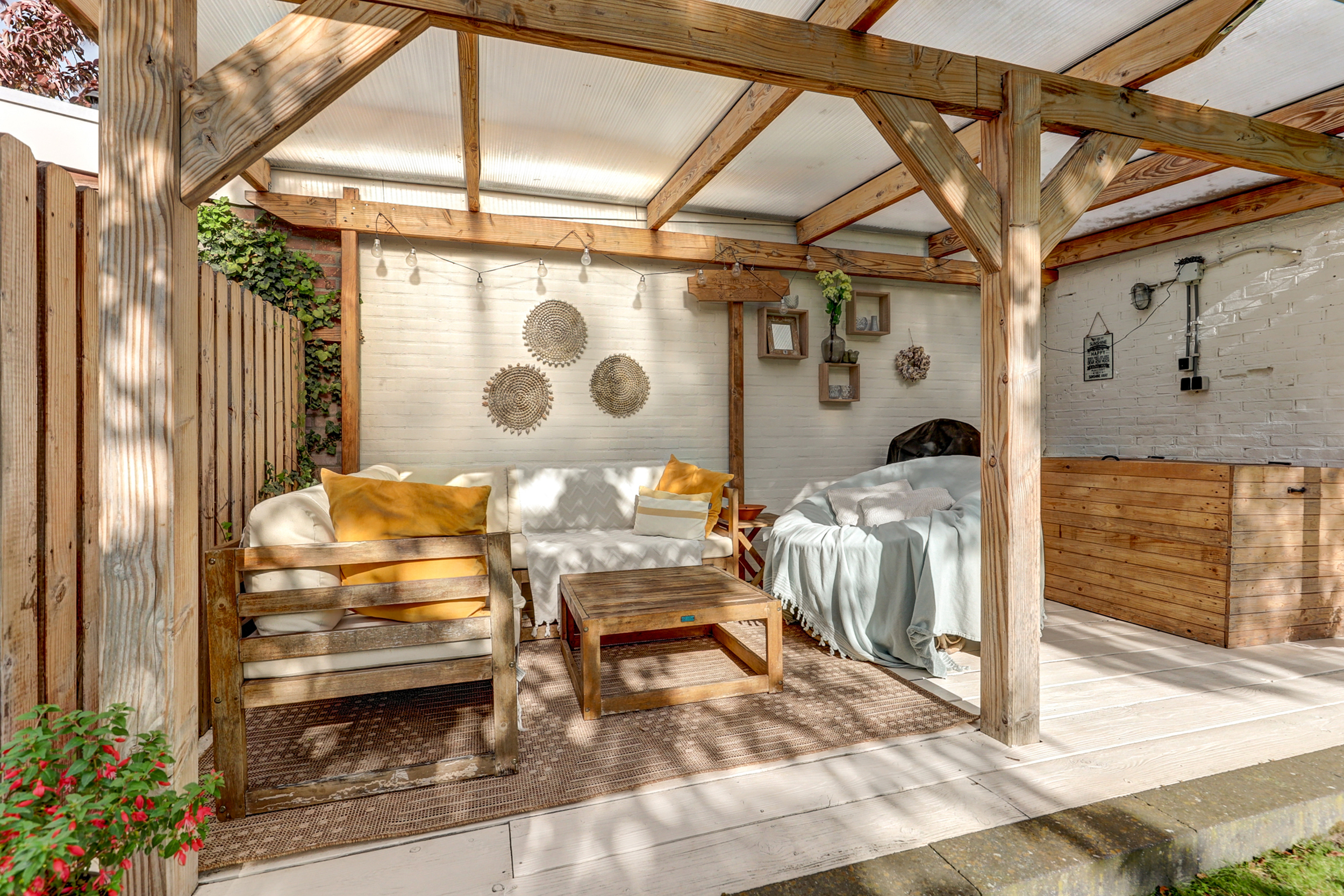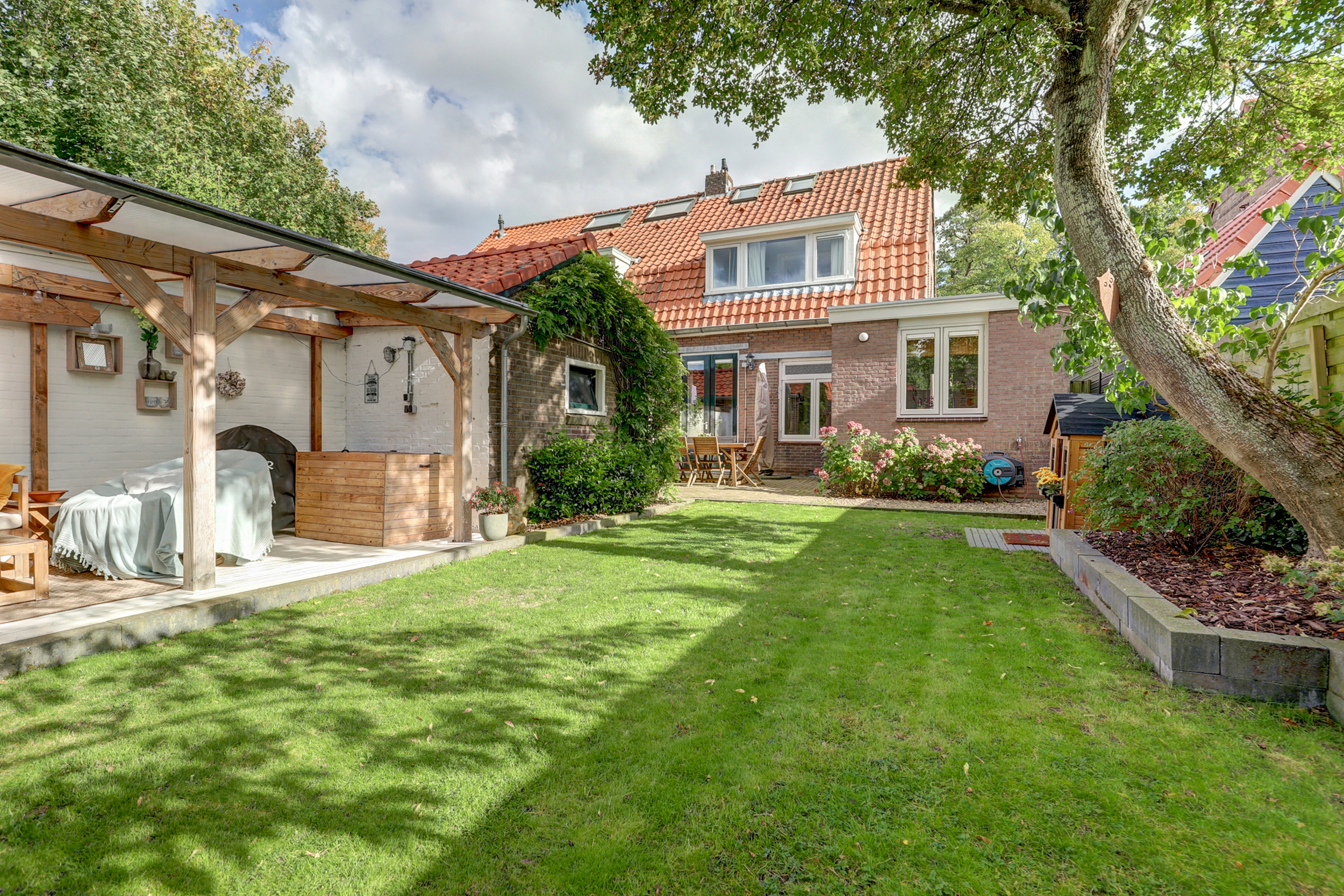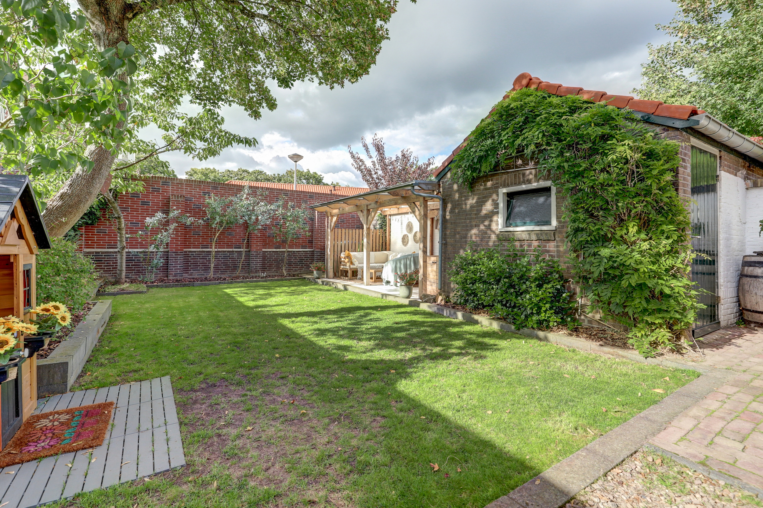 De achtertuin op het noordwesten biedt een royale overkapping, berging en achterom via de zijkant. Een plek waar je elk seizoen buiten leeft.