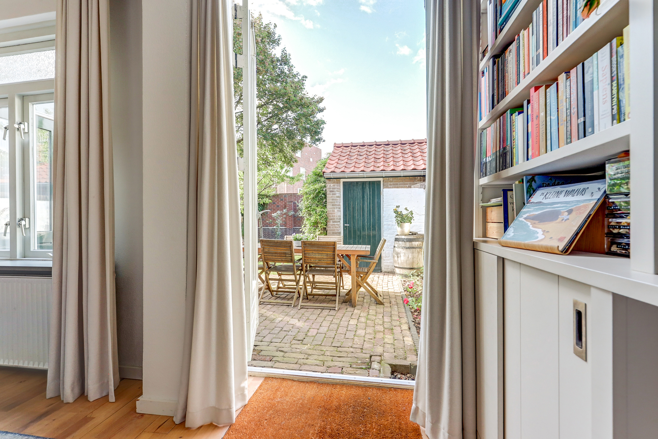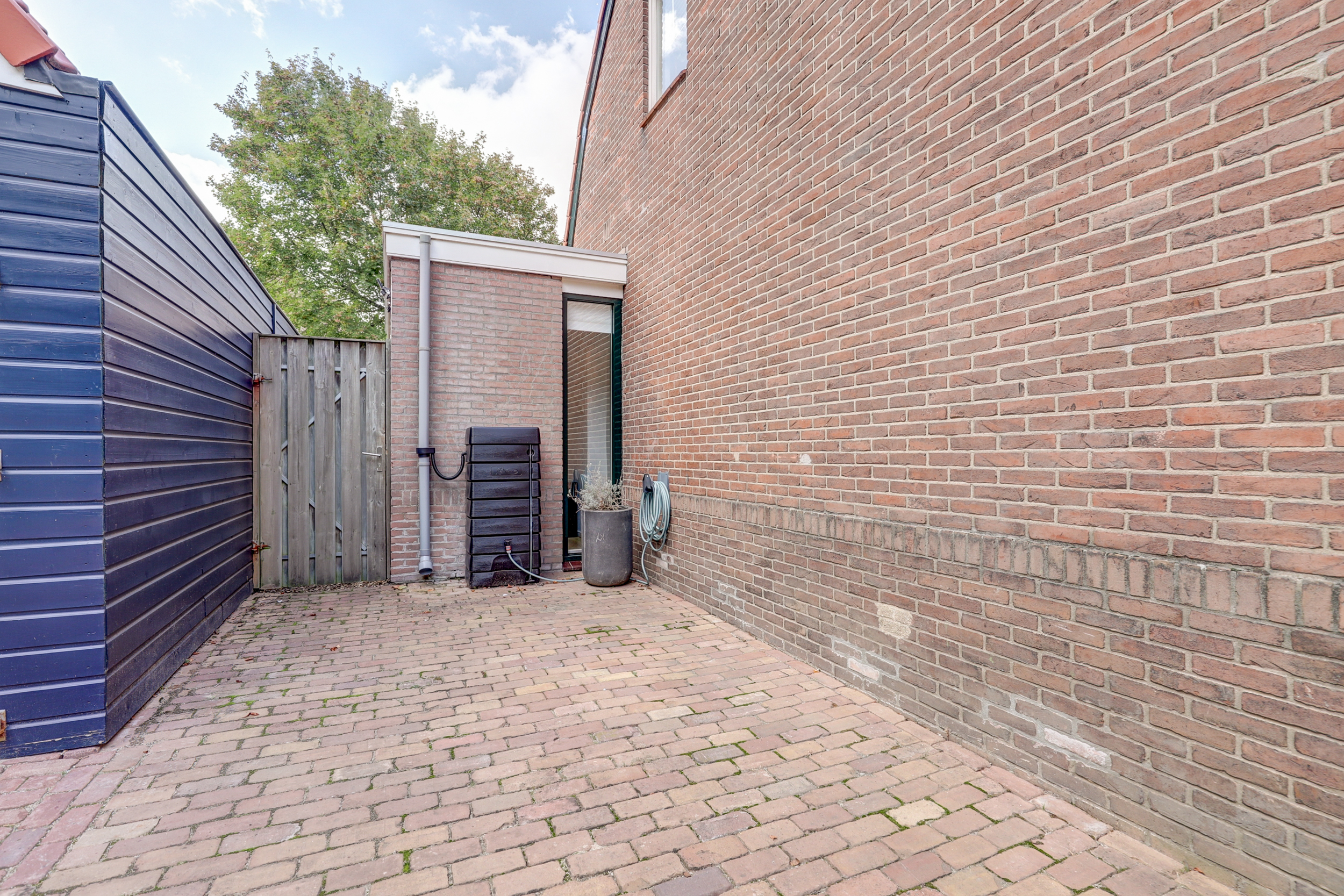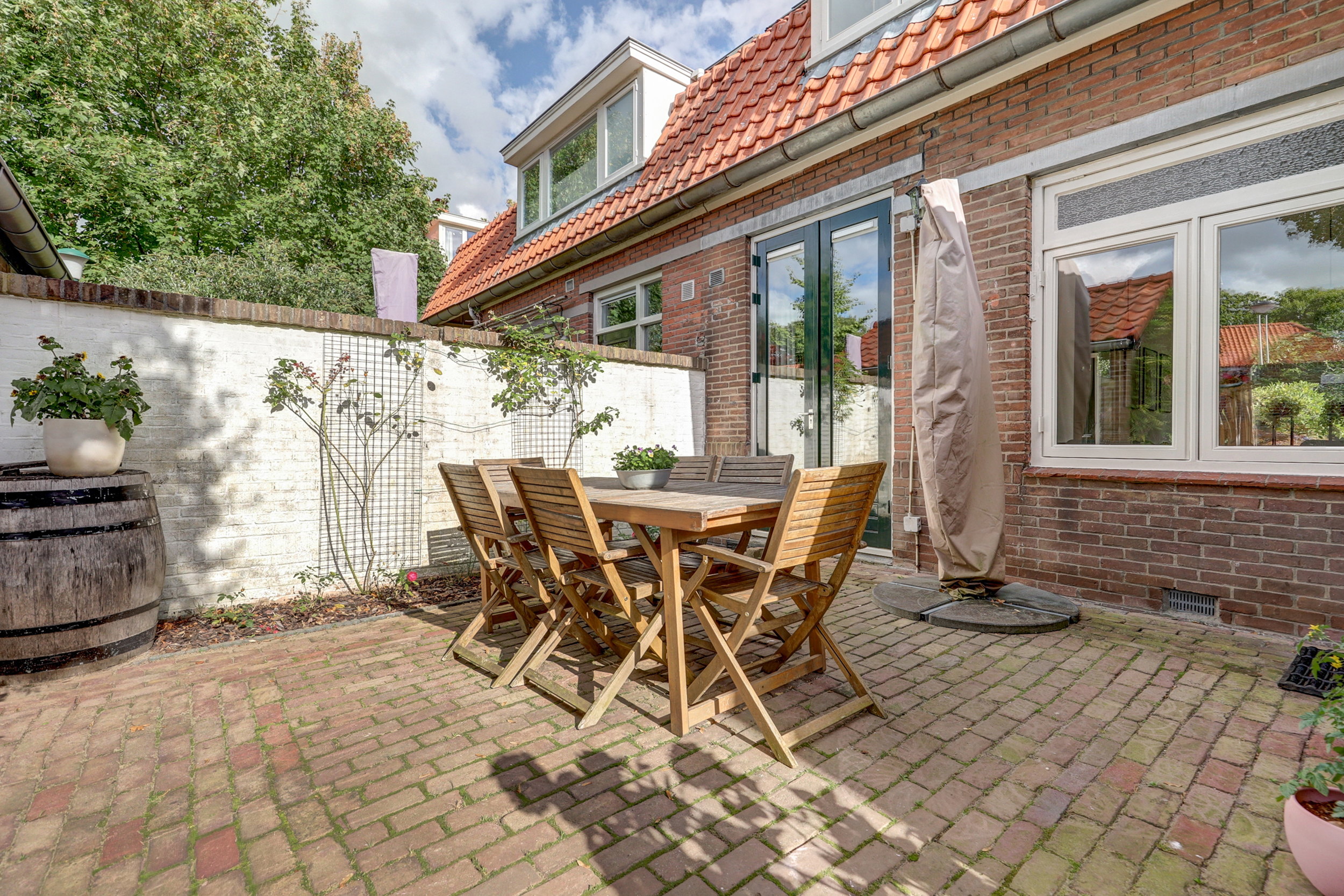 De achtertuin op het noordwesten biedt een royale overkapping, berging en achterom via de zijkant. Een plek waar je elk seizoen buiten leeft.