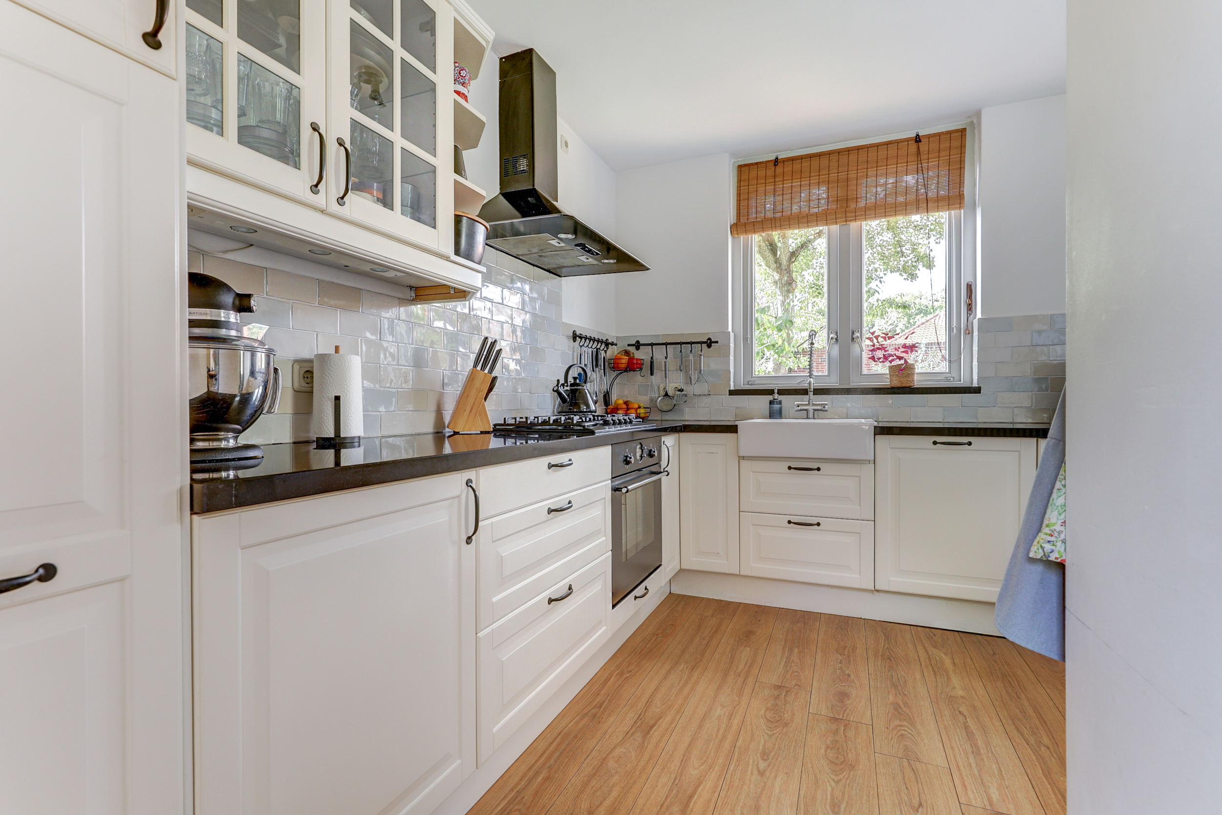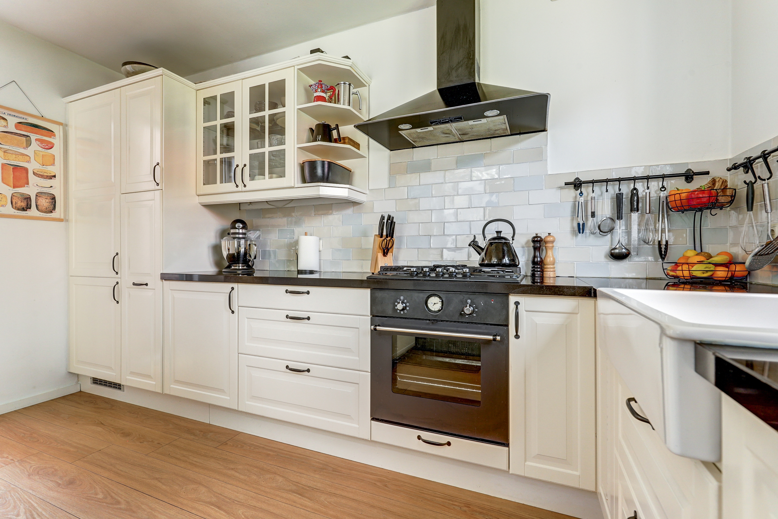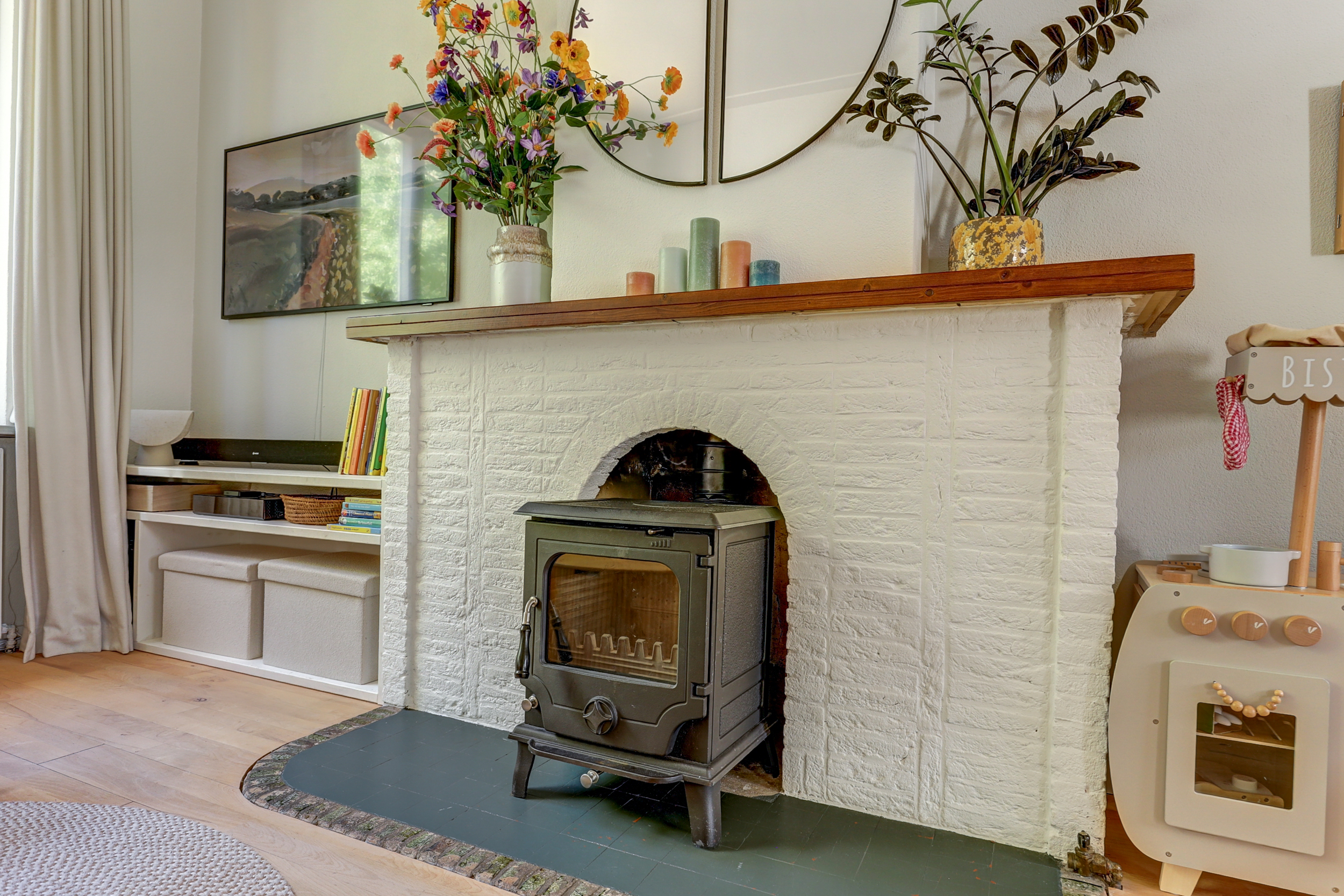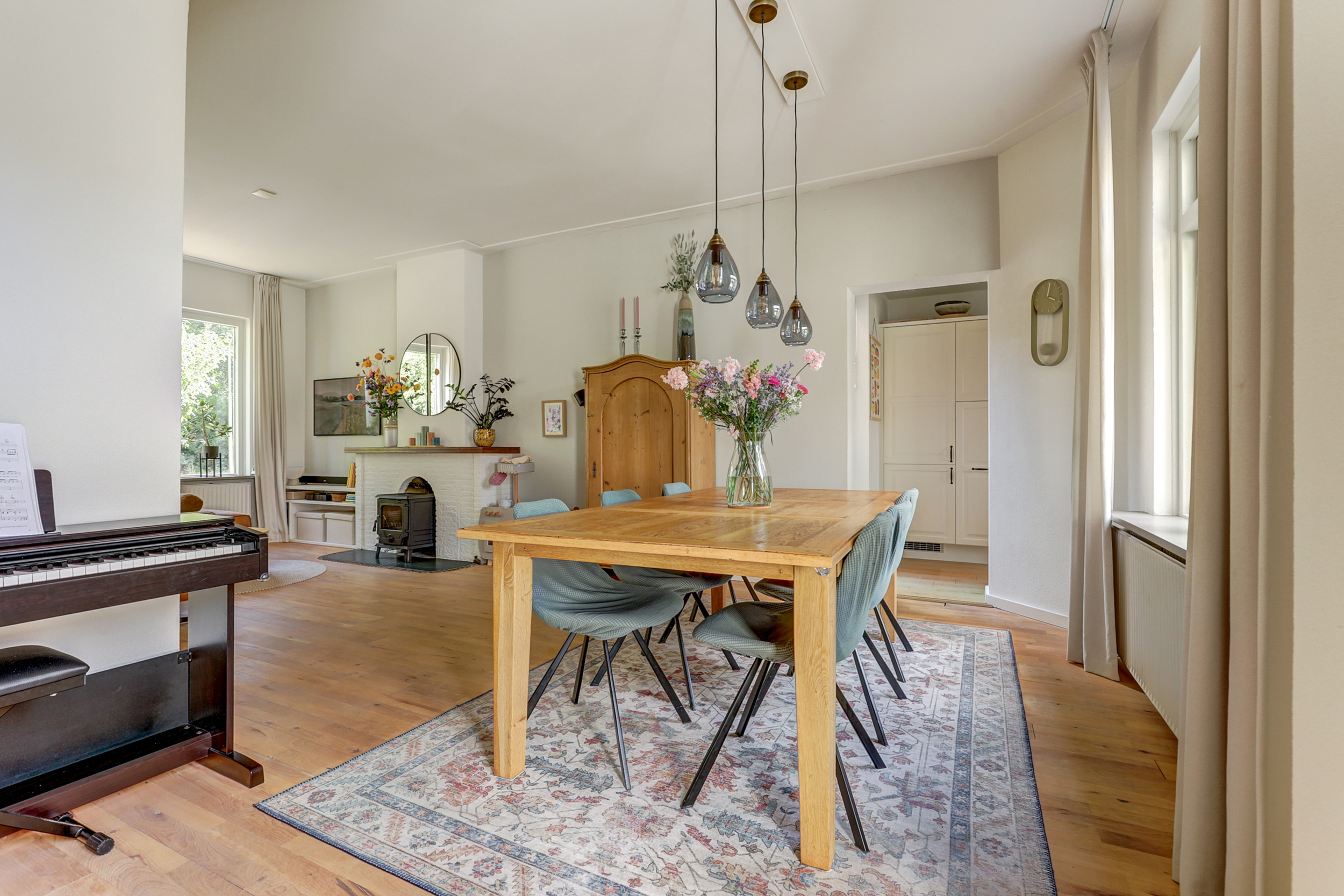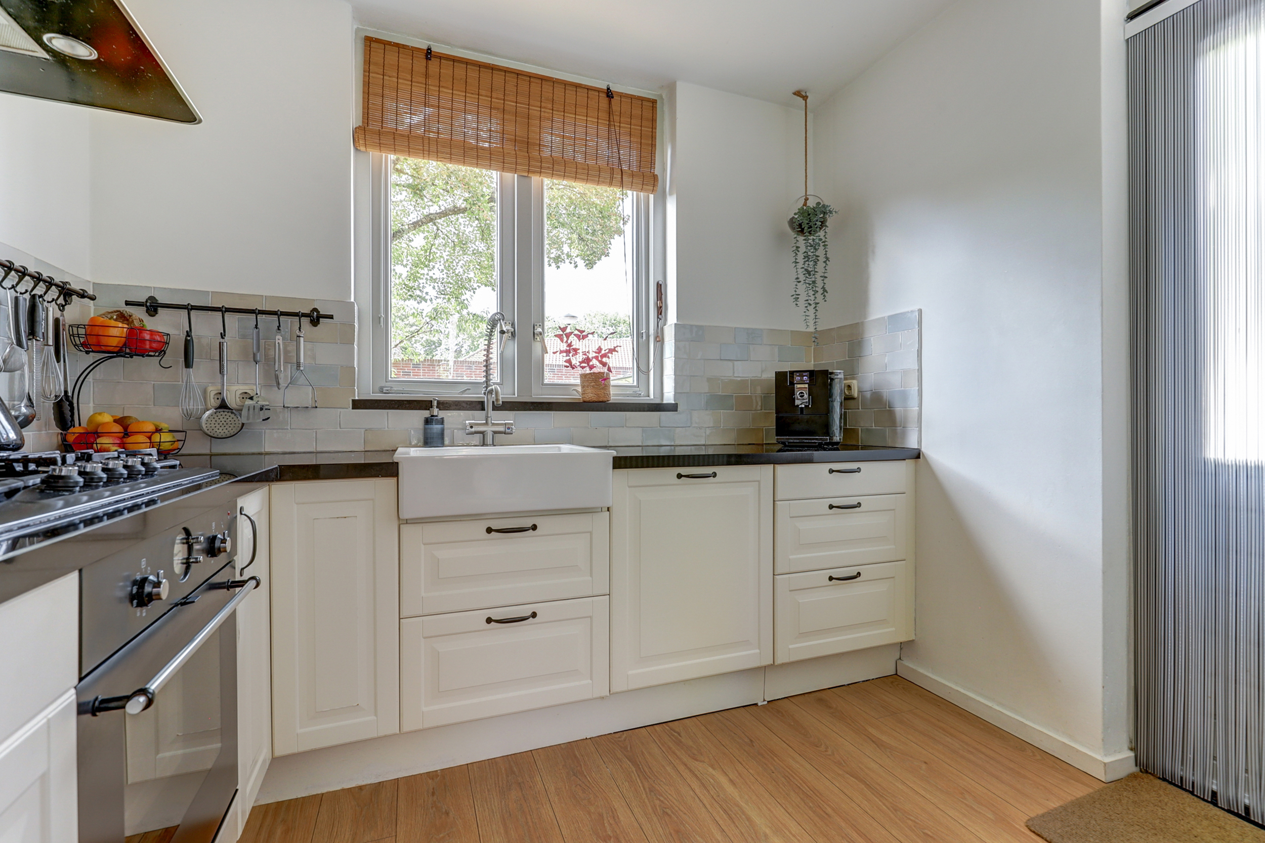 De lichte L-vormige woonkamer nodigt uit tot samenkomen. De houtkachel voegt warmte en sfeer toe, terwijl de openslaande deuren de tuin bij je woonruimte betrekken. De keuken (2010) is praktisch ingedeeld en voorzien van de nodige inbouwapparatuur.