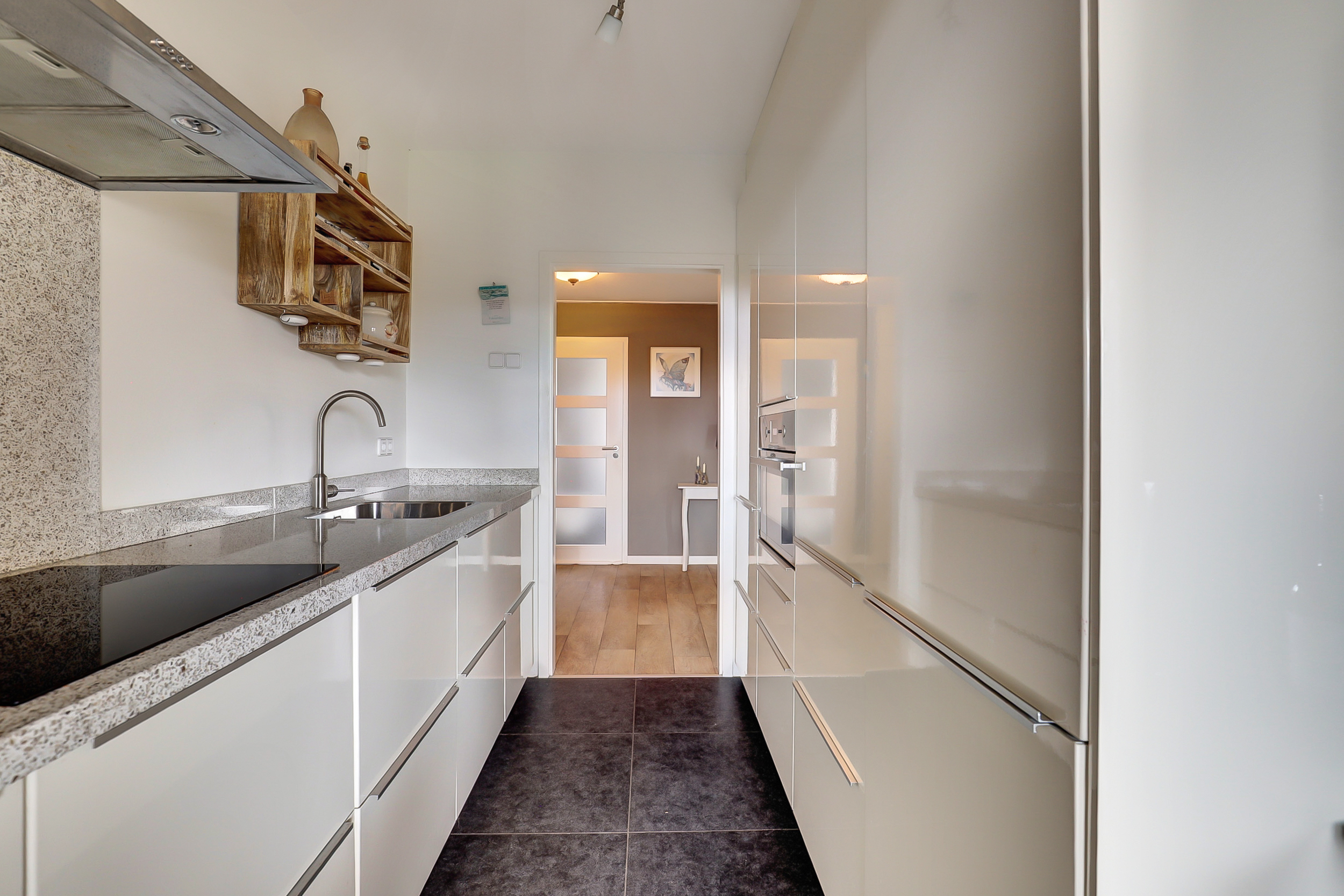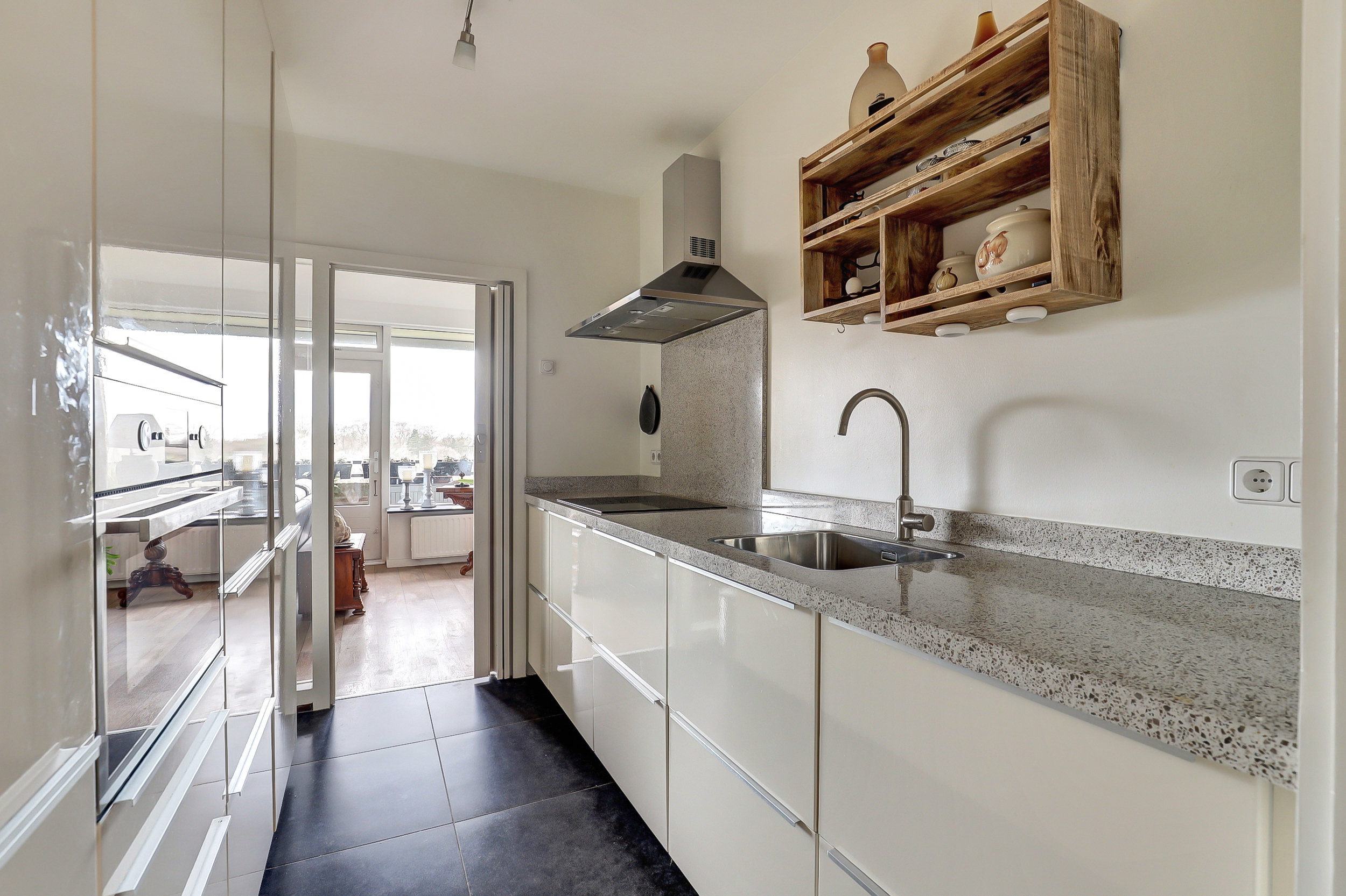 De keuken is uitgevoerd in een dubbele wandopstelling en voorzien van diverse inbouwapparatuur, waaronder een inductiekookplaat, afzuigkap, vaatwasser, koel-/vriescombinatie en combimagnetron.