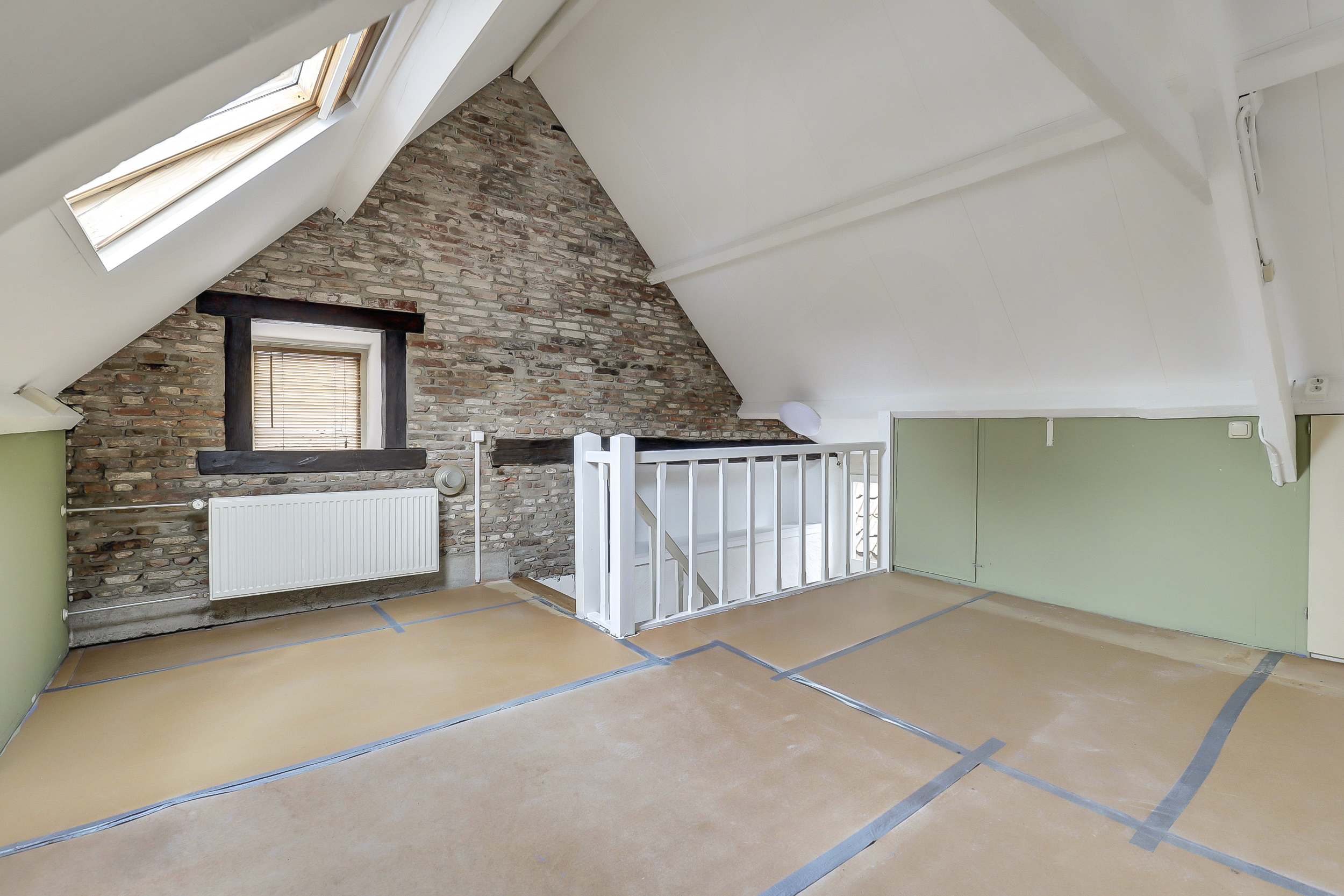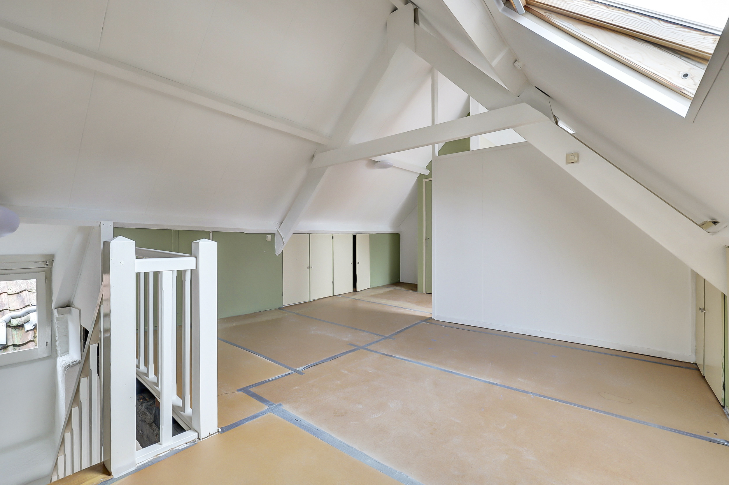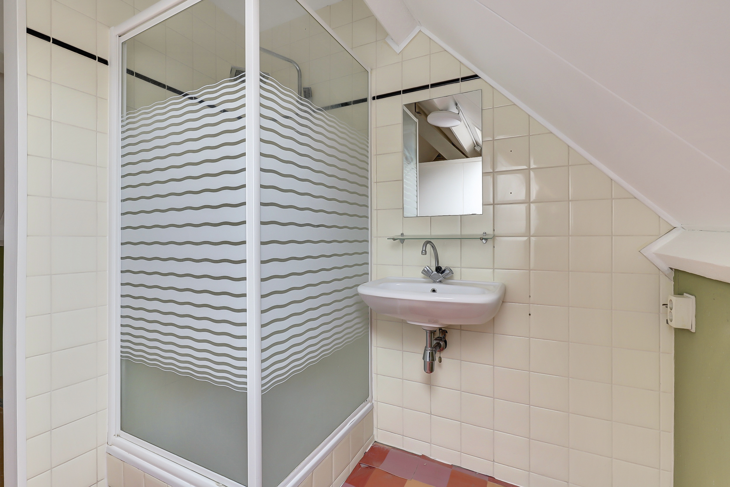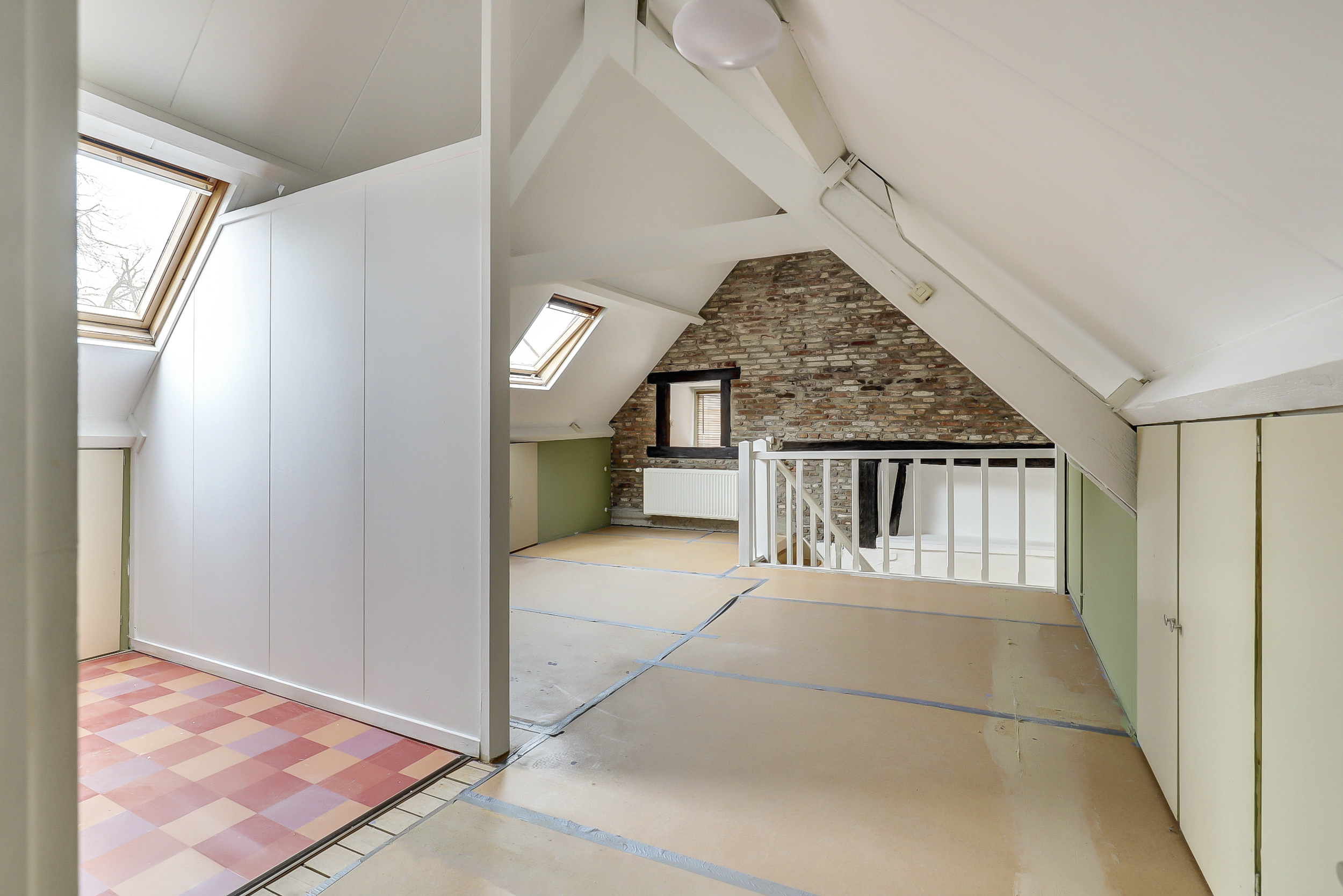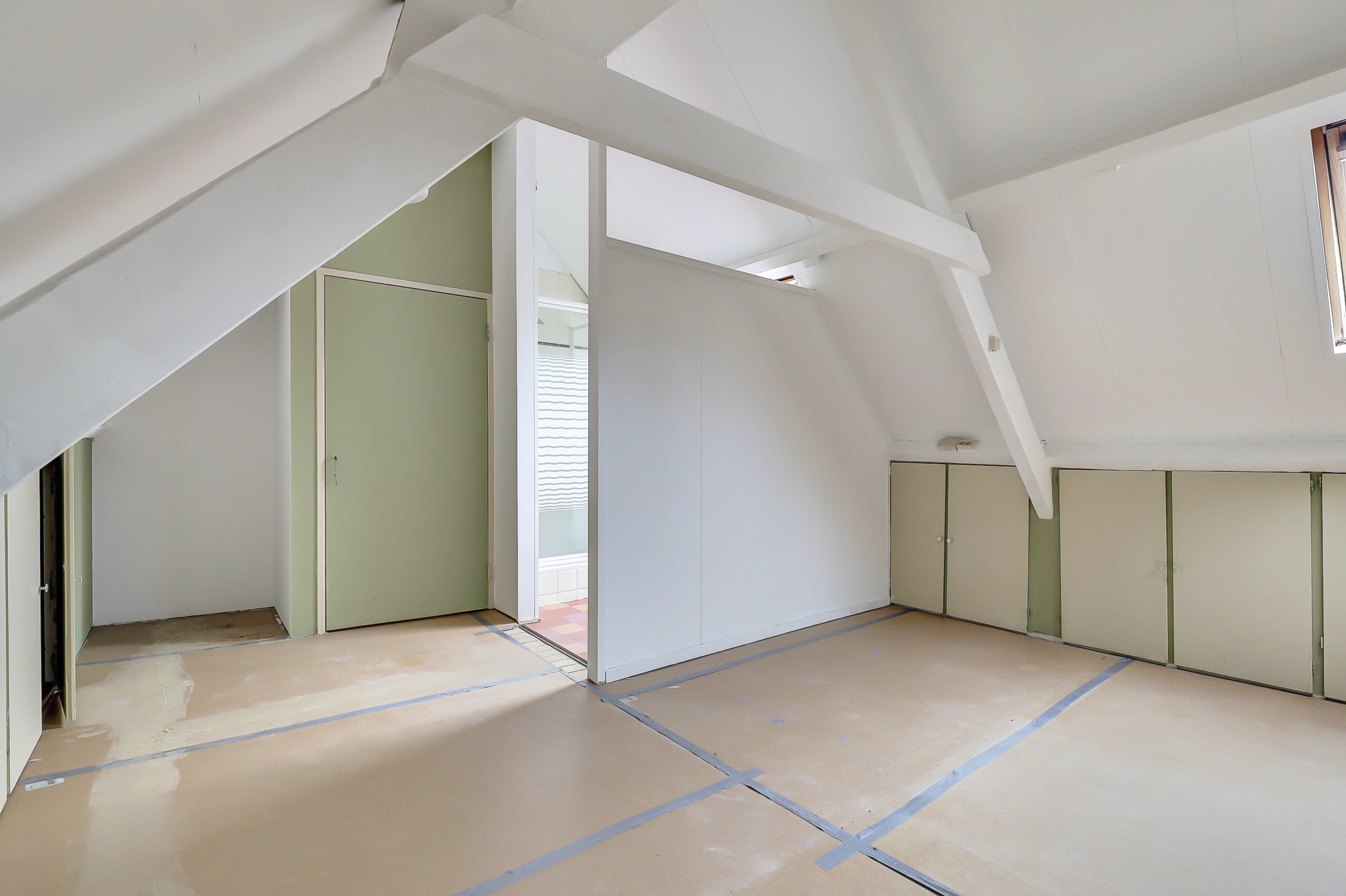 Boven vind je een ruime slaapkamer met voldoende lichtinval en zichtlijnen naar de omgeving. Daarnaast vind je hier de badkamer met douche en vaste wastafel, en een bergkast waar de cv-ketel (Nefit, 2020) is geplaatst.