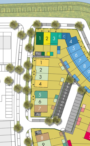 De parkeerplaatsen op de afbeelding aangeduid met H, I, J en K zijn nog beschikbaar. De vraagprijs bedraagt € 3.500,- per parkeerplaats.